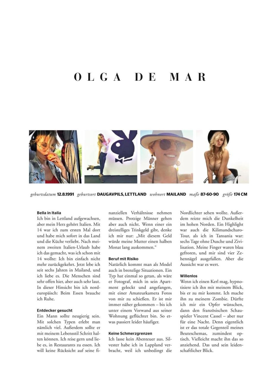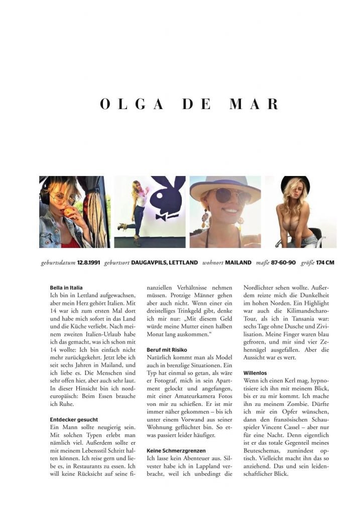 Découvrez les photos d’Olga de Mar par Ana Dias pour Playboy Playmate Allemagne (août 2017). Olga de Mar est un mannequin originaire de Lettonie.