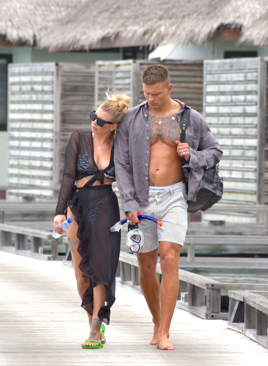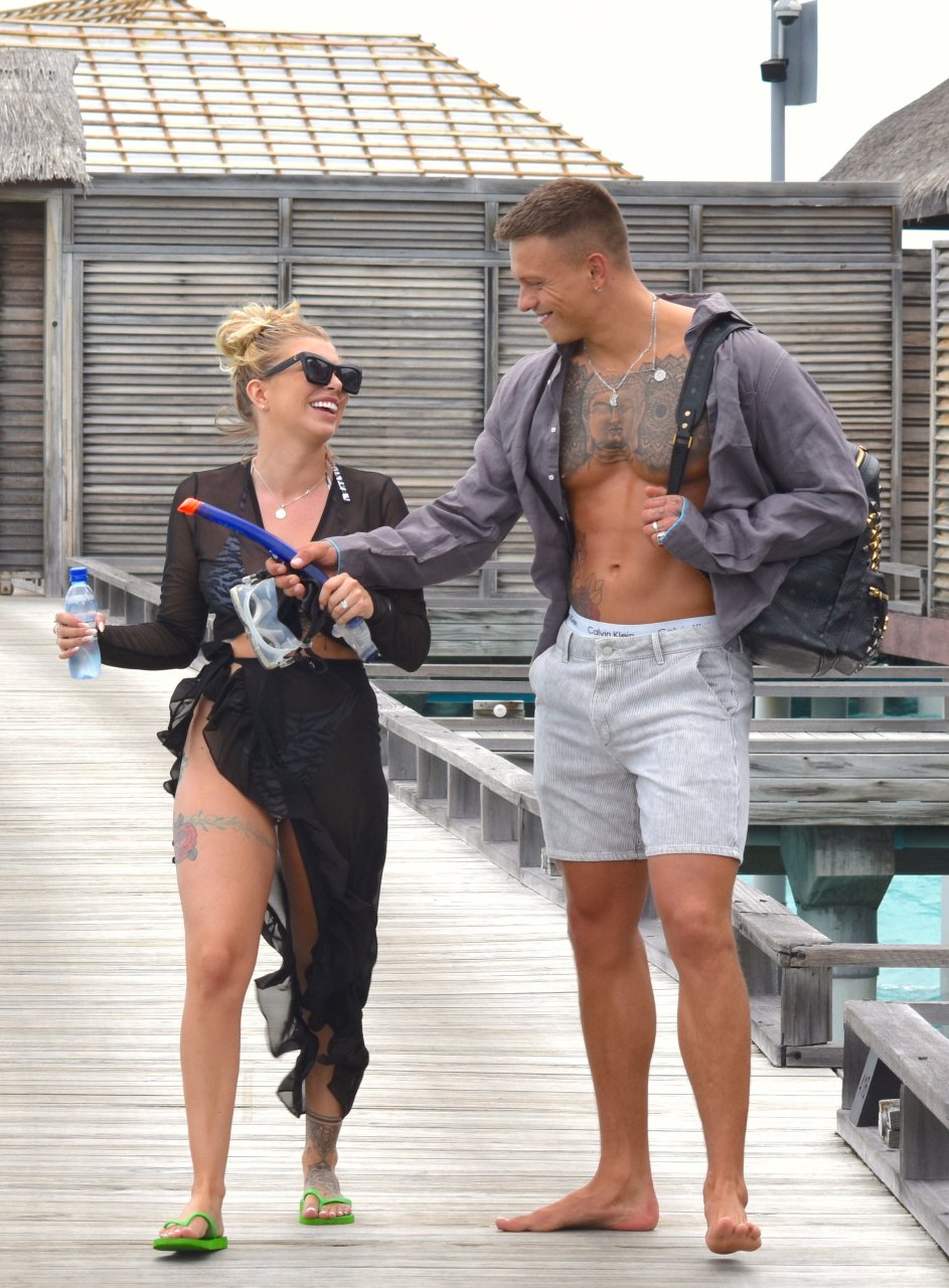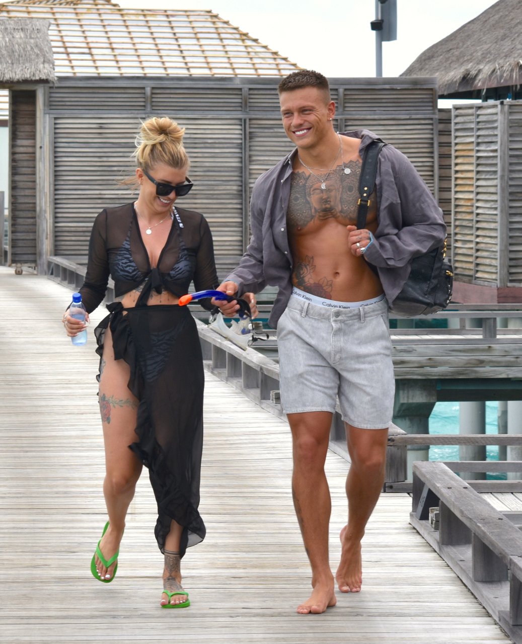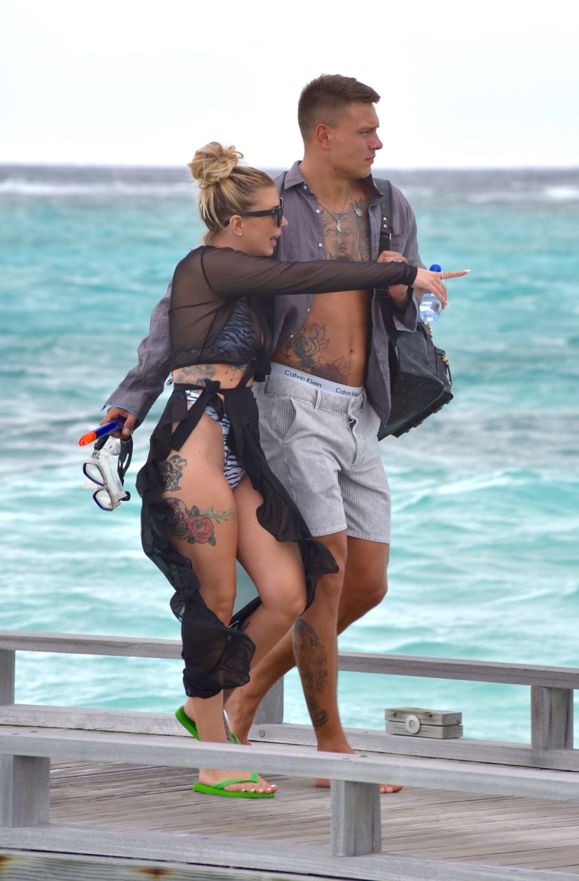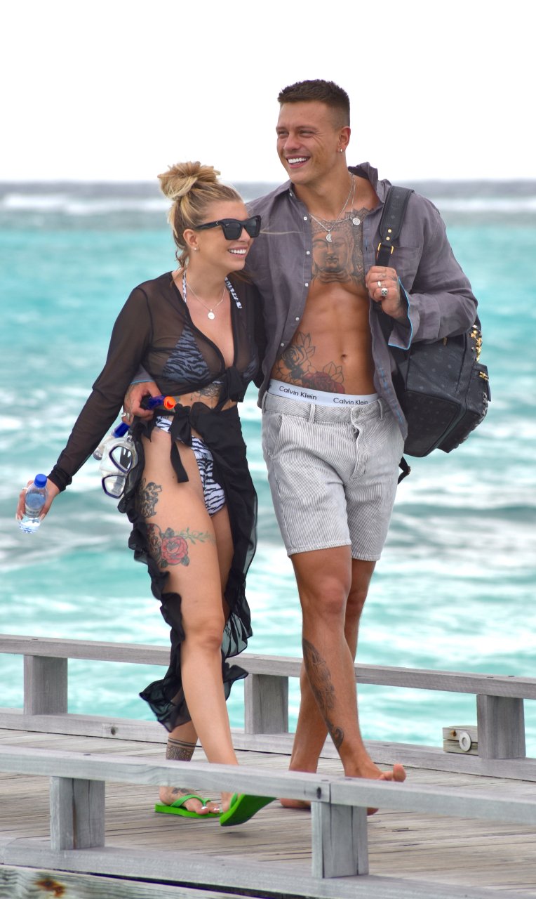 Olivia Buckland et Alex Bowen font une promenade romantique sur la jetée lors de leur lune de miel aux Maldives, 30/09/2018. Olivia Buckland Bowen est une star anglaise de la télévision et mannequin de 24 ans.