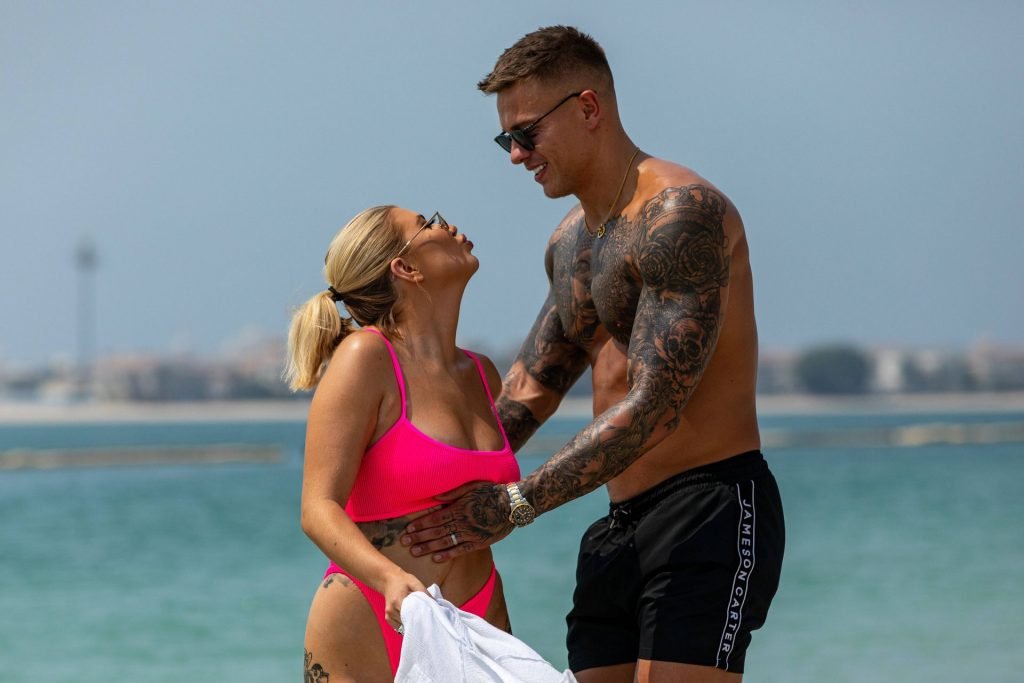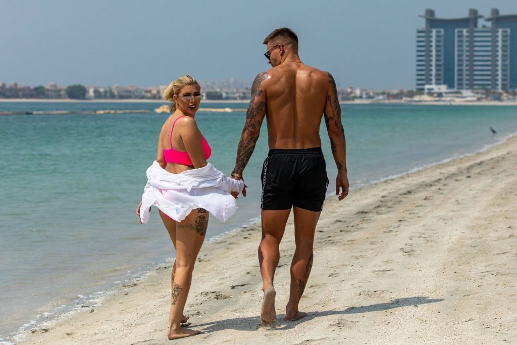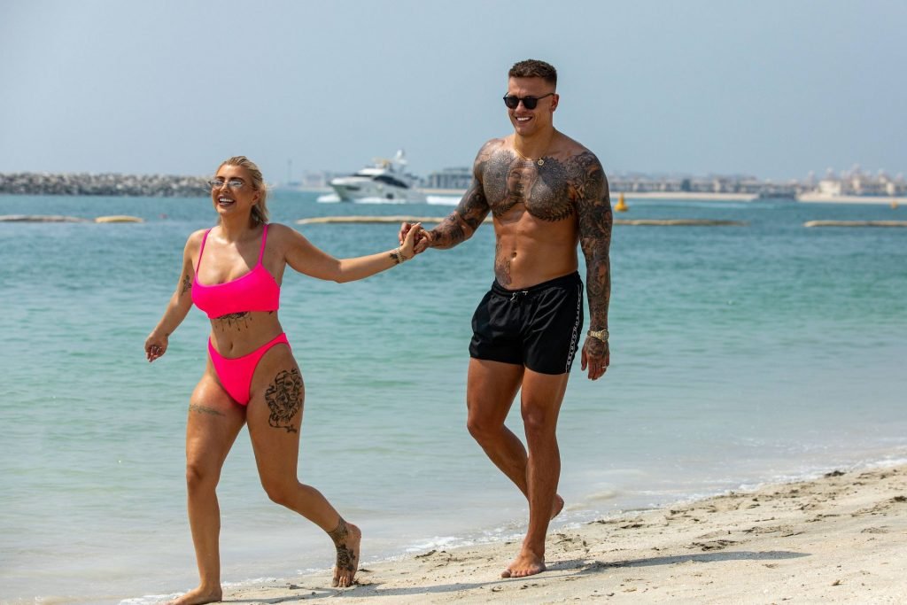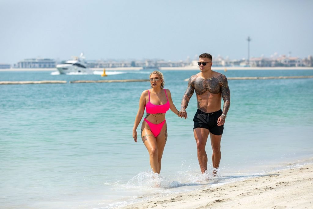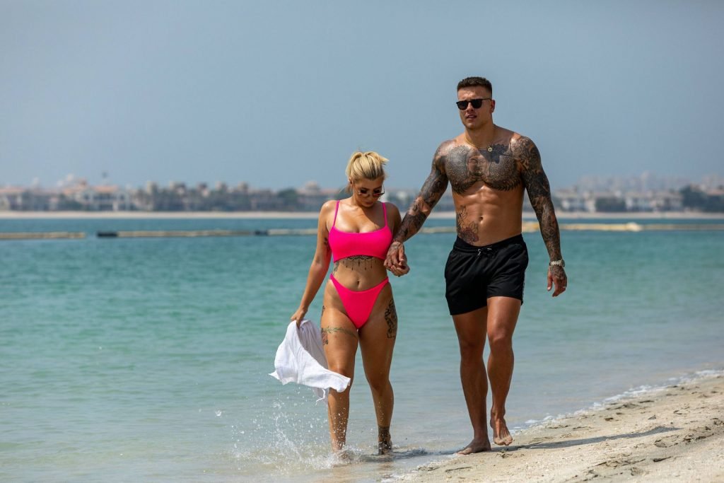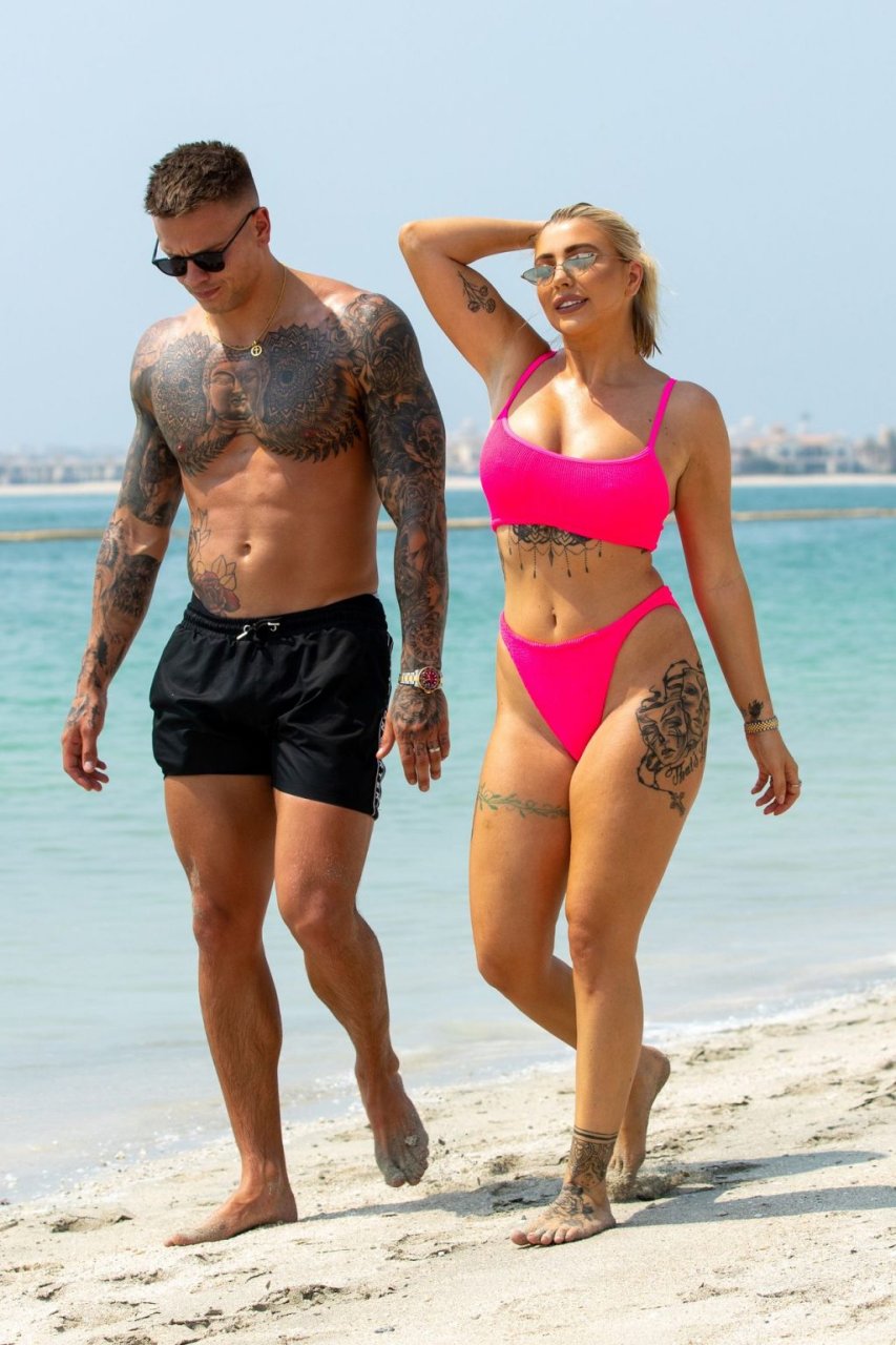 Les stars de la télé-réalité Olivia Buckland et Alex Bowen ont été vues sur une plage à Dubaï, le 10/03/2019. Olivia affichait son corps enviable dans un bikini rose.