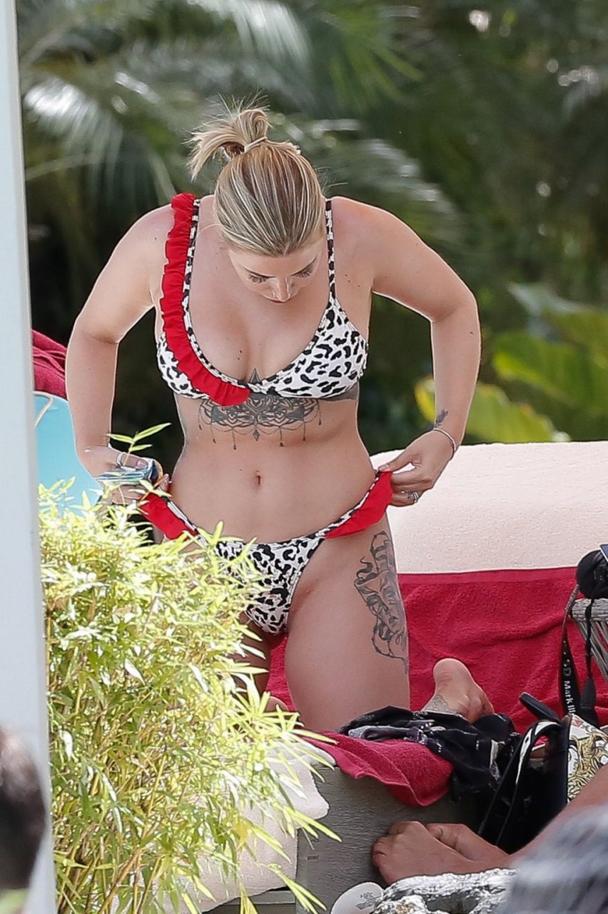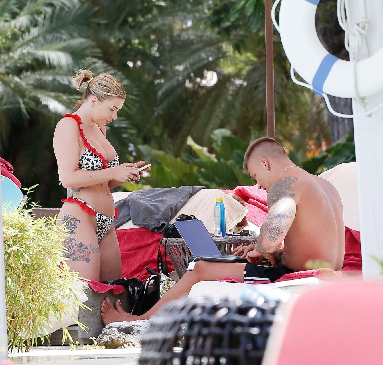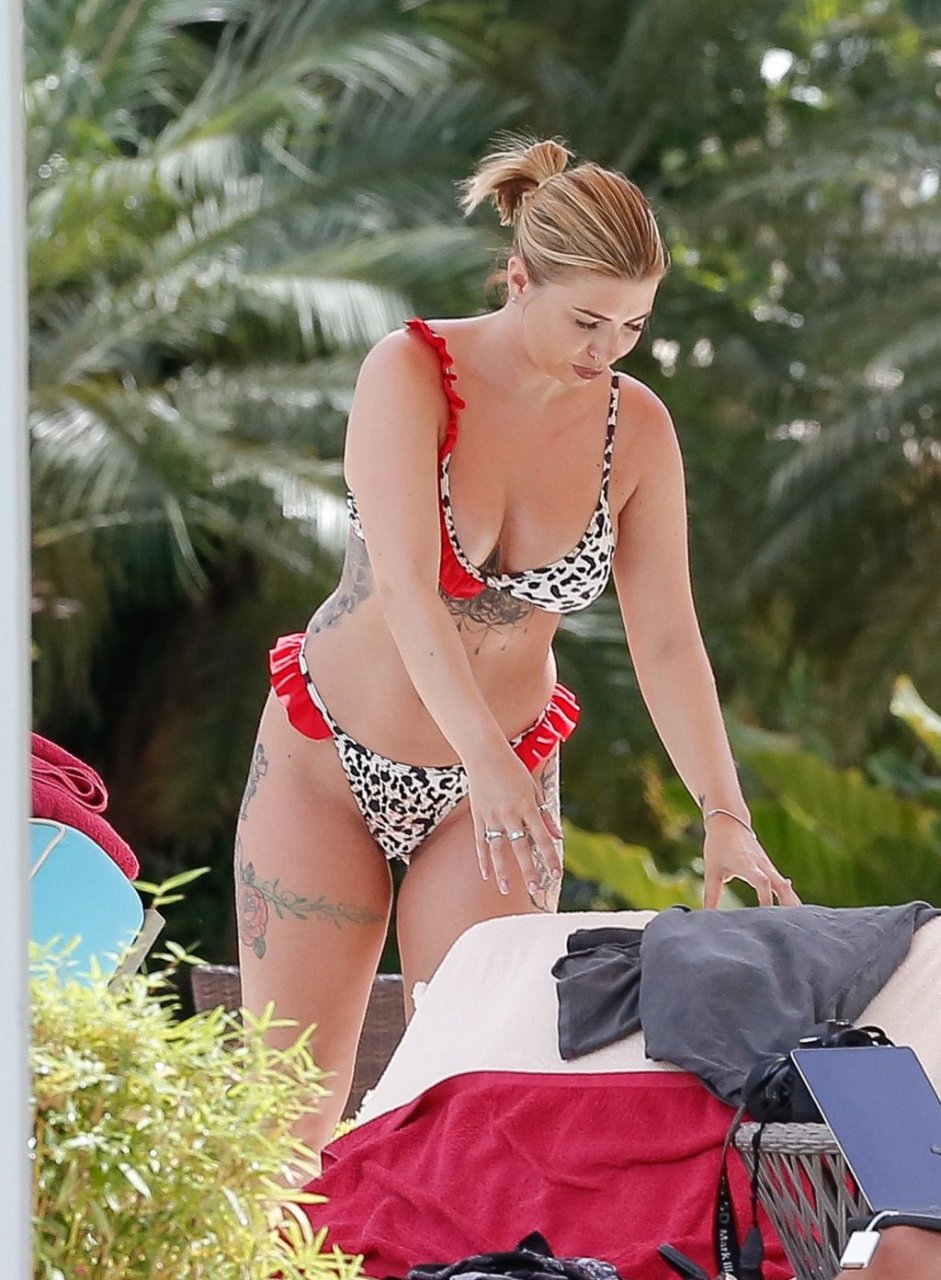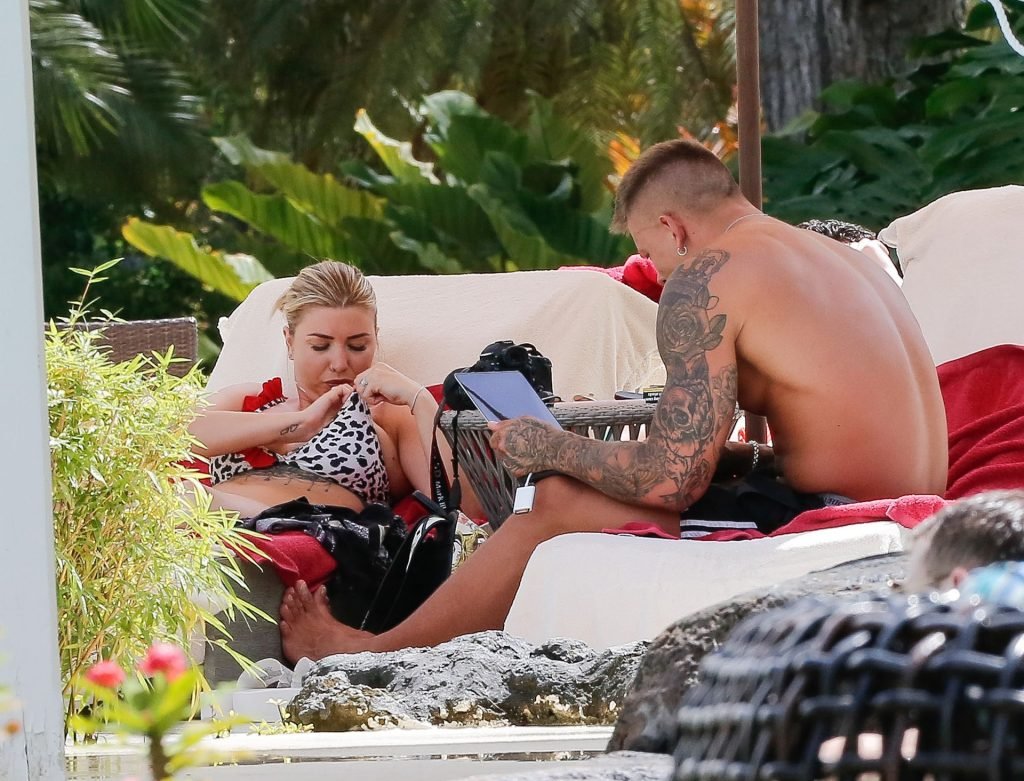 La star de la télé-réalité Olivia Buckland est aperçue dans un minuscule bikini rouge et blanc lors de ses vacances à la Barbade avec son mari, Alex Bowen, 25/03/2019.