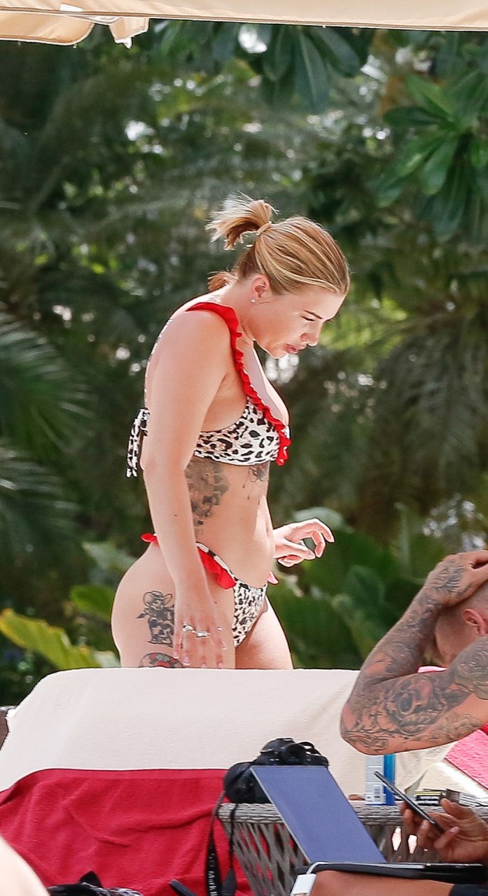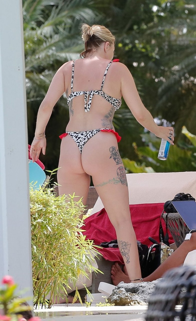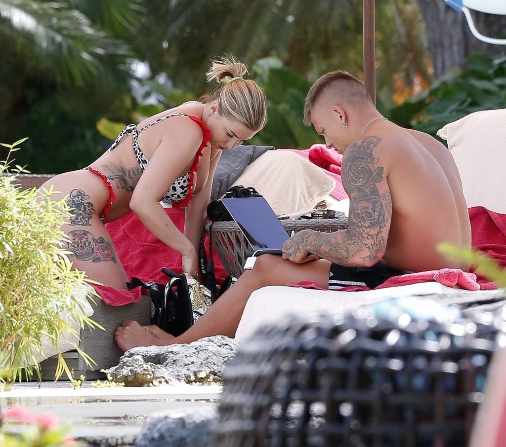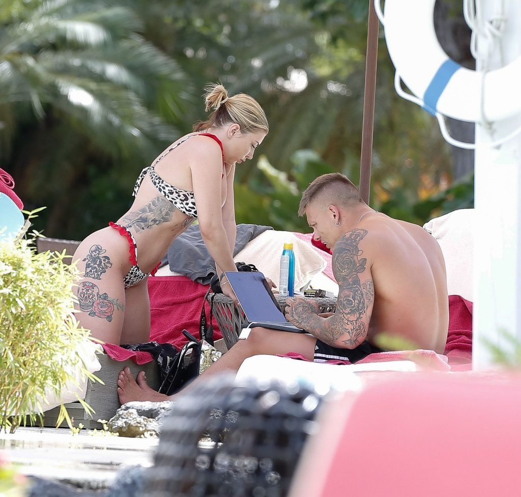 La star de la télé-réalité Olivia Buckland est aperçue dans un minuscule bikini rouge et blanc lors de ses vacances à la Barbade avec son mari, Alex Bowen, 25/03/2019.