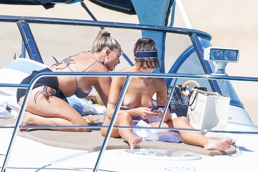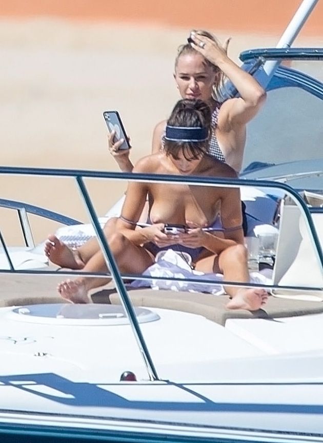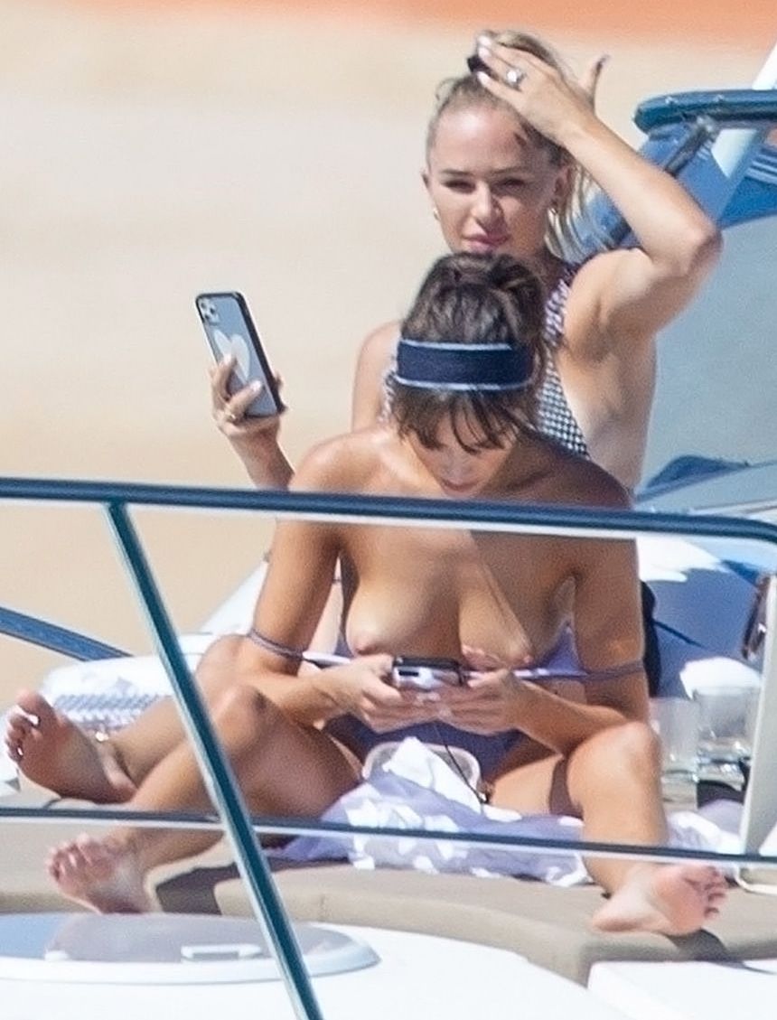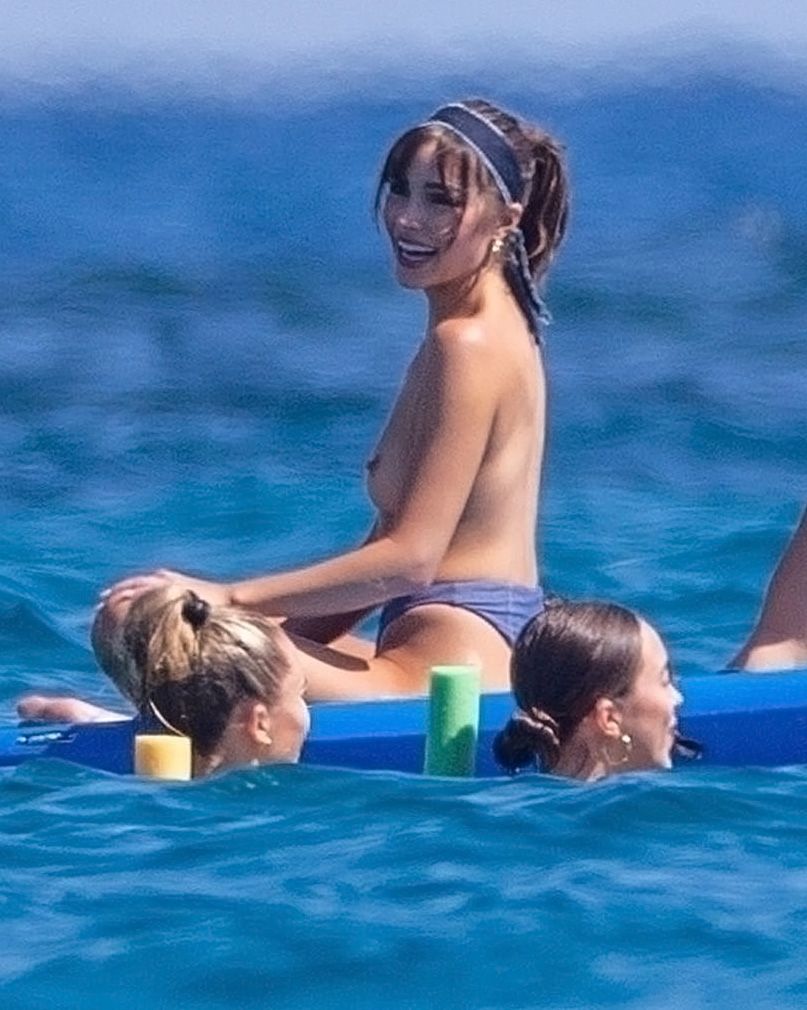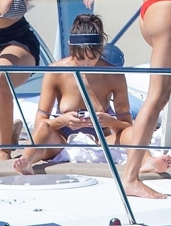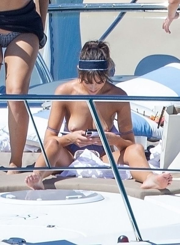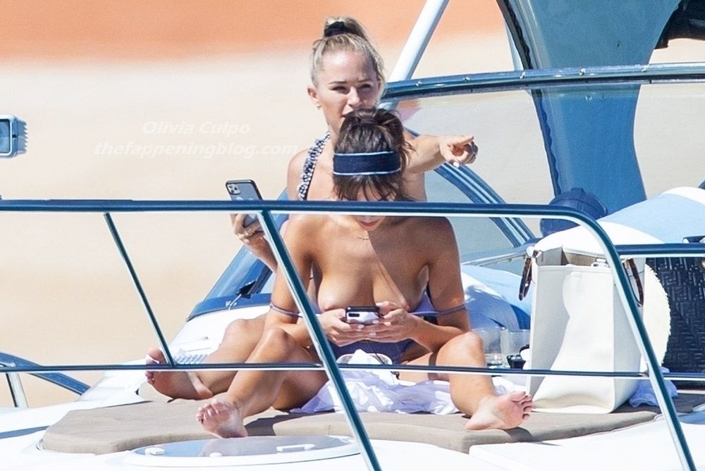 Here is the model Olivia Culpo topless and in a blue denim bikini while sailing off Cabo San Lucas, Mexico. Culpo showed her boobs and hard nipples!