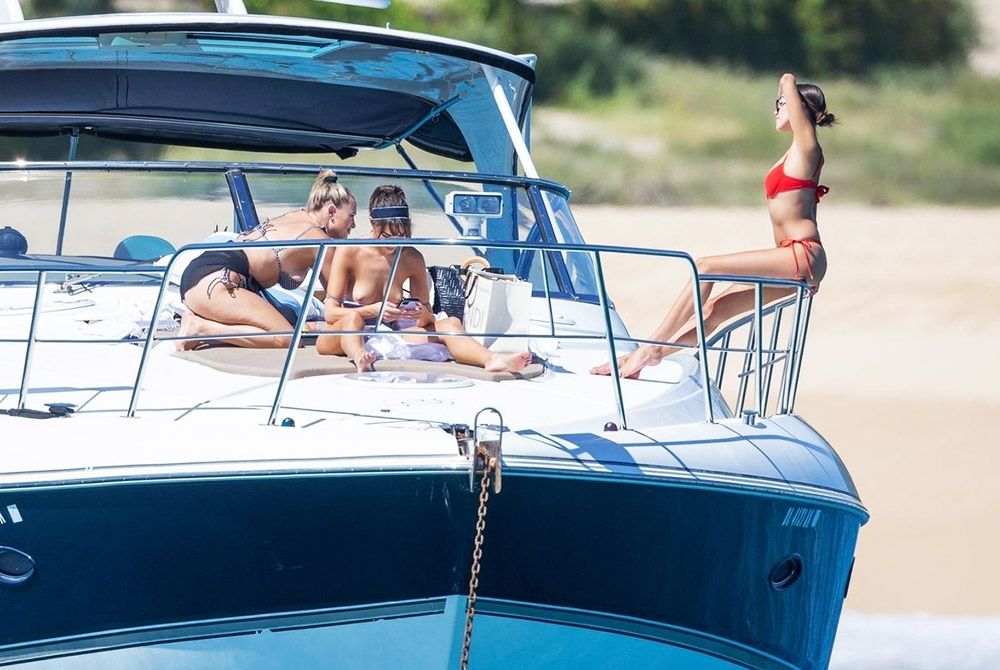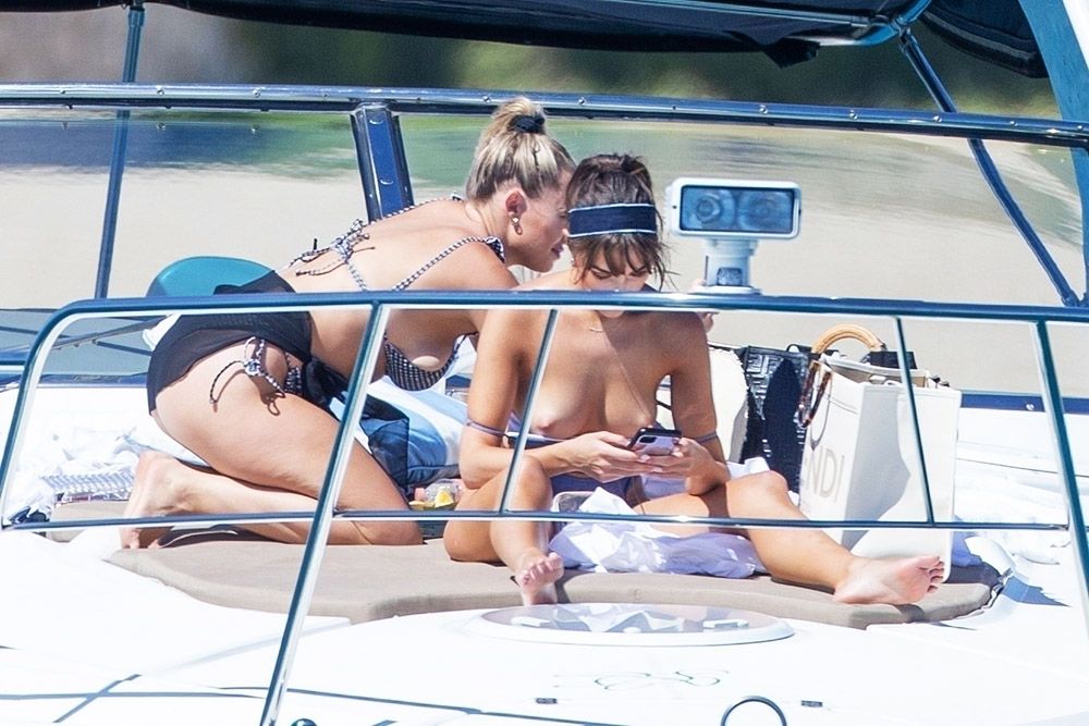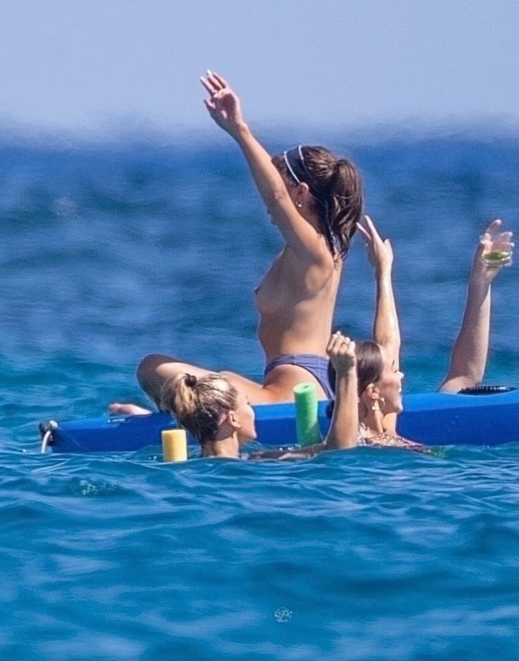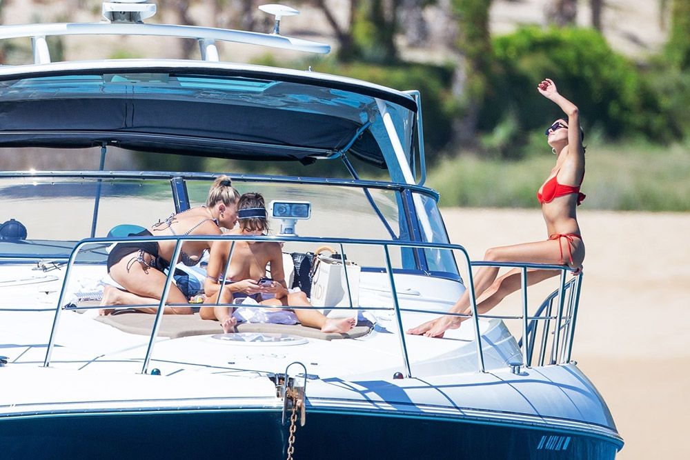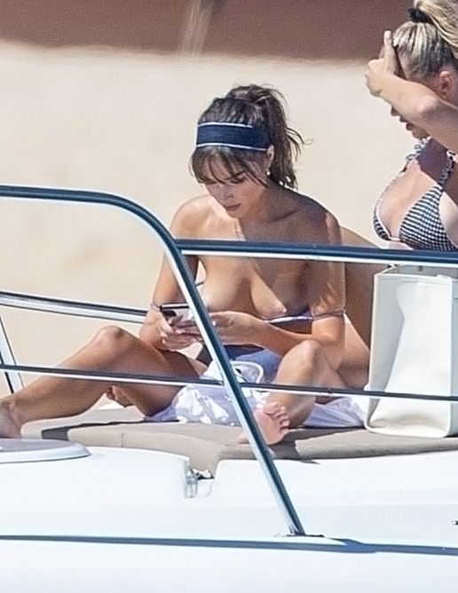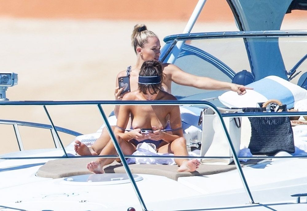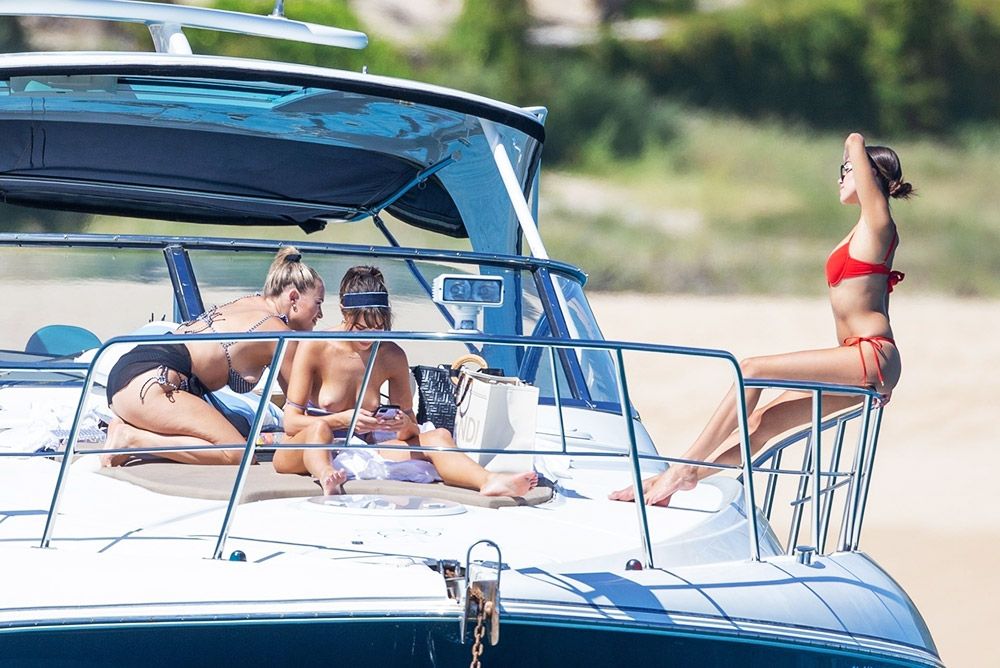 Here is the model Olivia Culpo topless and in a blue denim bikini while sailing off Cabo San Lucas, Mexico. Culpo showed her boobs and hard nipples!