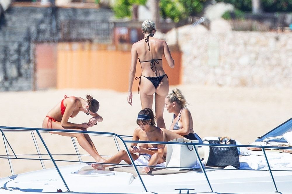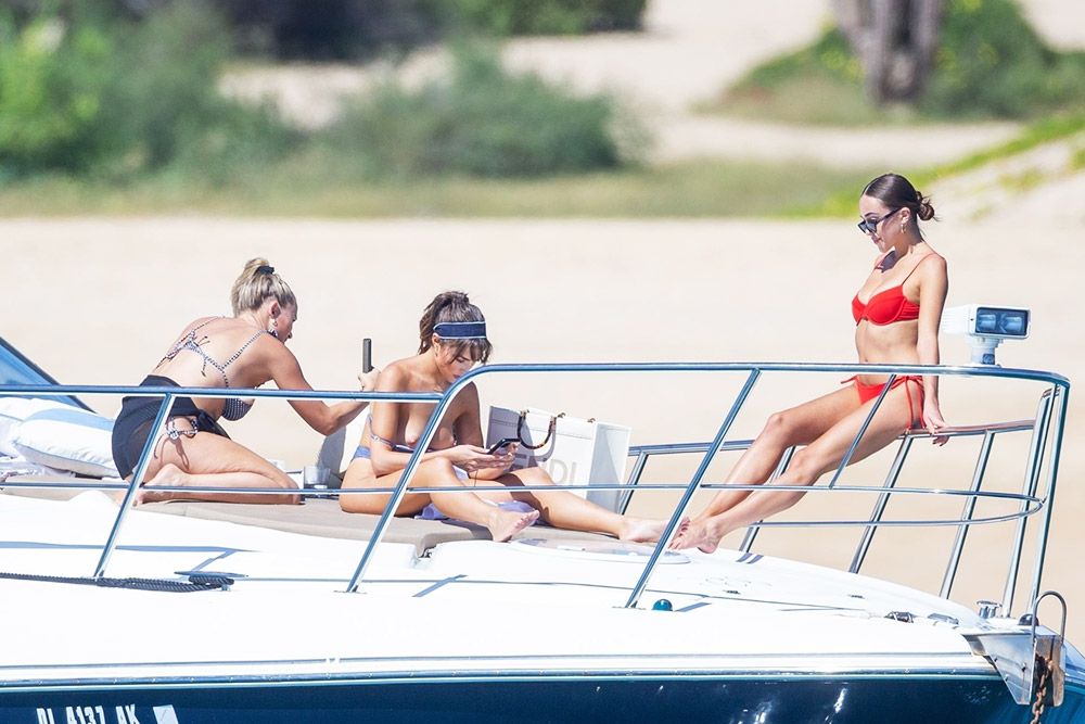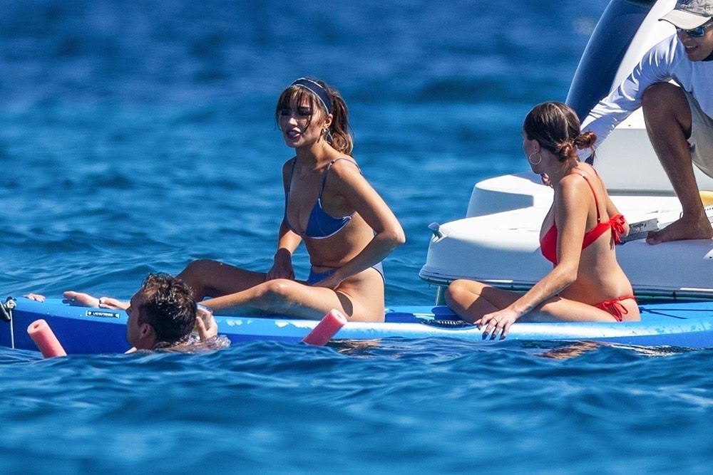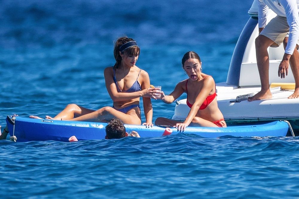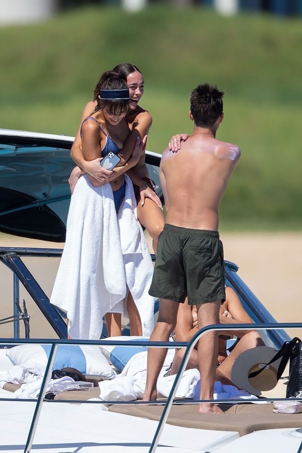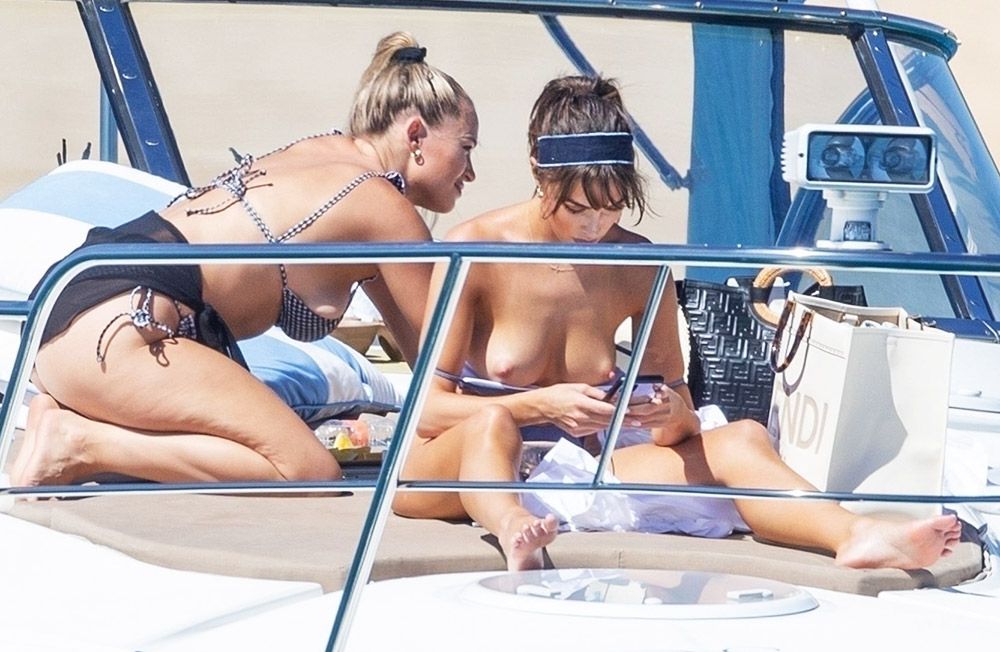 Here is the model Olivia Culpo topless and in a blue denim bikini while sailing off Cabo San Lucas, Mexico. Culpo showed her boobs and hard nipples!