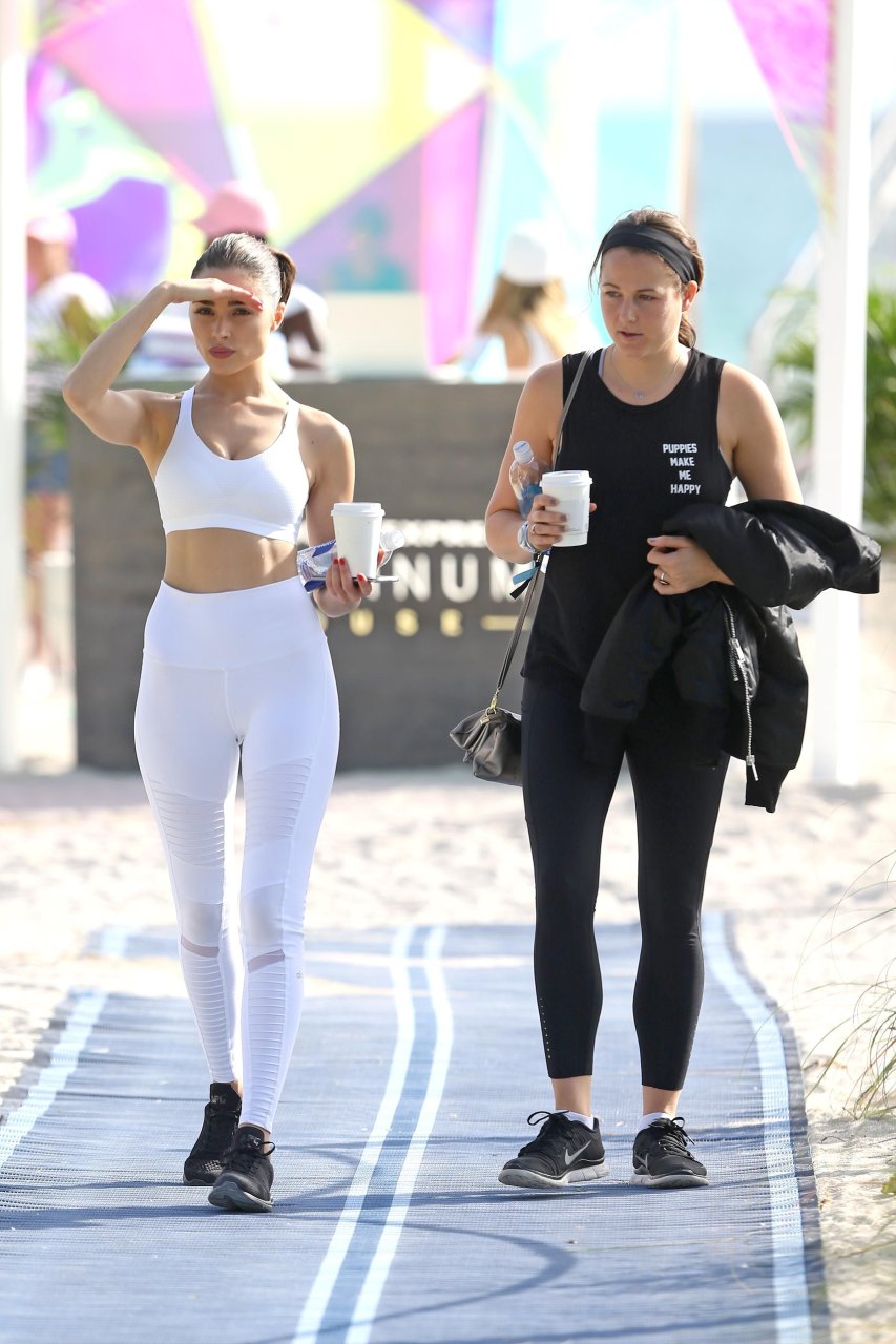 Olivia Culpo se promène de retour à son hôtel de Miami après une séance d’entraînement matinale, 12/08/2017. Olivia Culpo est une actrice américaine, animatrice de télévision, reine de beauté (Miss USA). Âge : 25 ans.