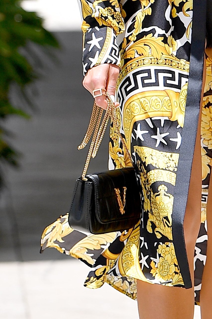 Le mannequin Olivia Culpo porte une robe Versace avec un maillot de bain noir à Miami Beach, Floride, 14/07/2019.