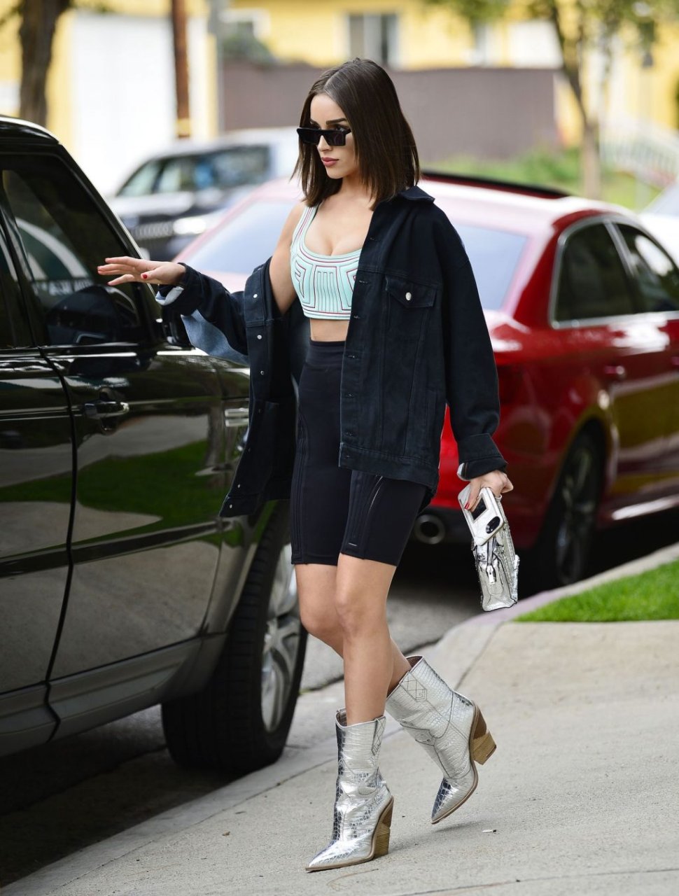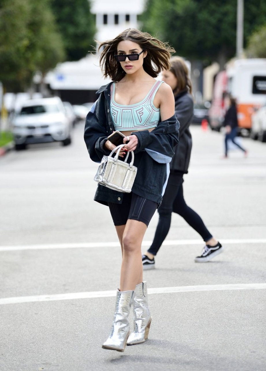 Le mannequin/actrice Olivia Culpo exhibe son décolleté prononcé et ses jambes sexy lors d’une séance shopping entre amis à Beverly Hills, le 01/02/2019.