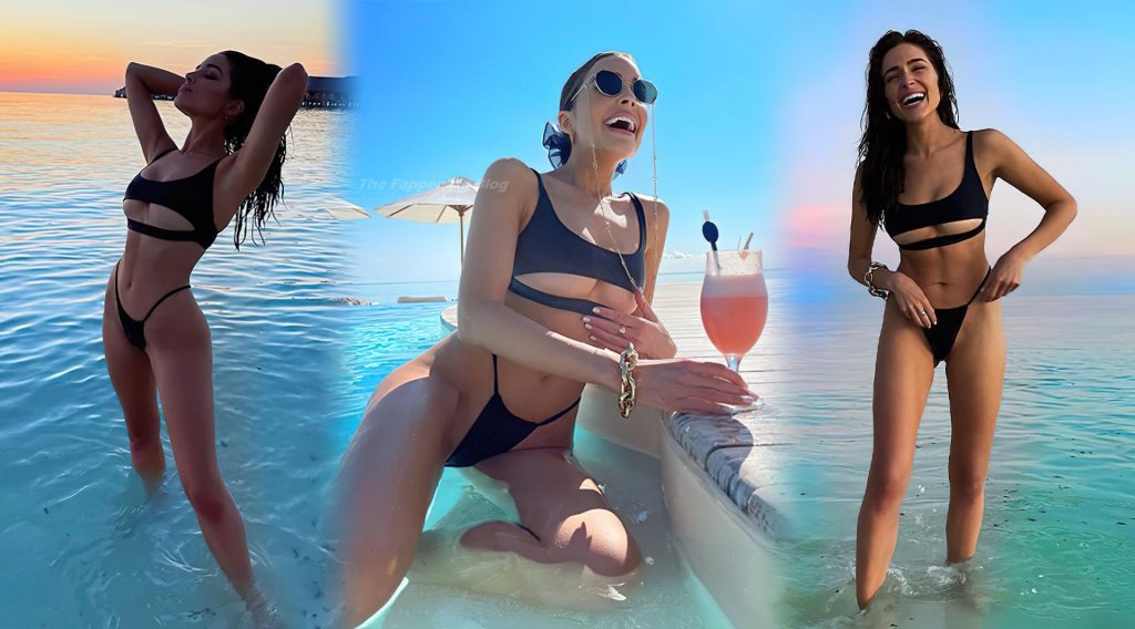 Olivia Culpo montre son underboob et sideboob en posant dans un tout petit bikini et sans soutien-gorge dans une robe grise lors d’une escapade idyllique aux Maldives.