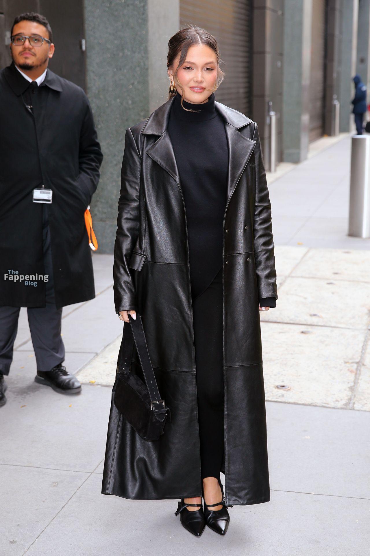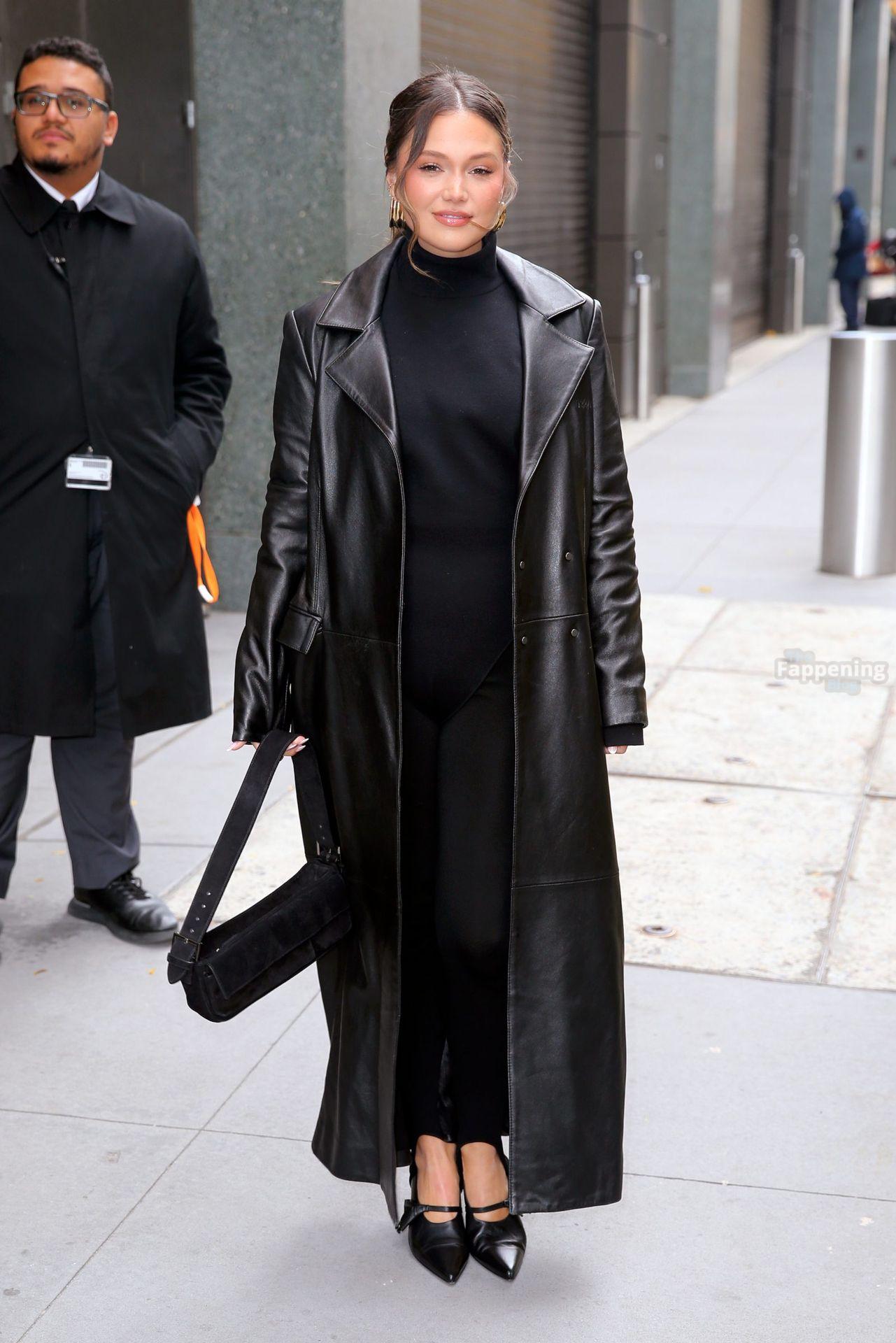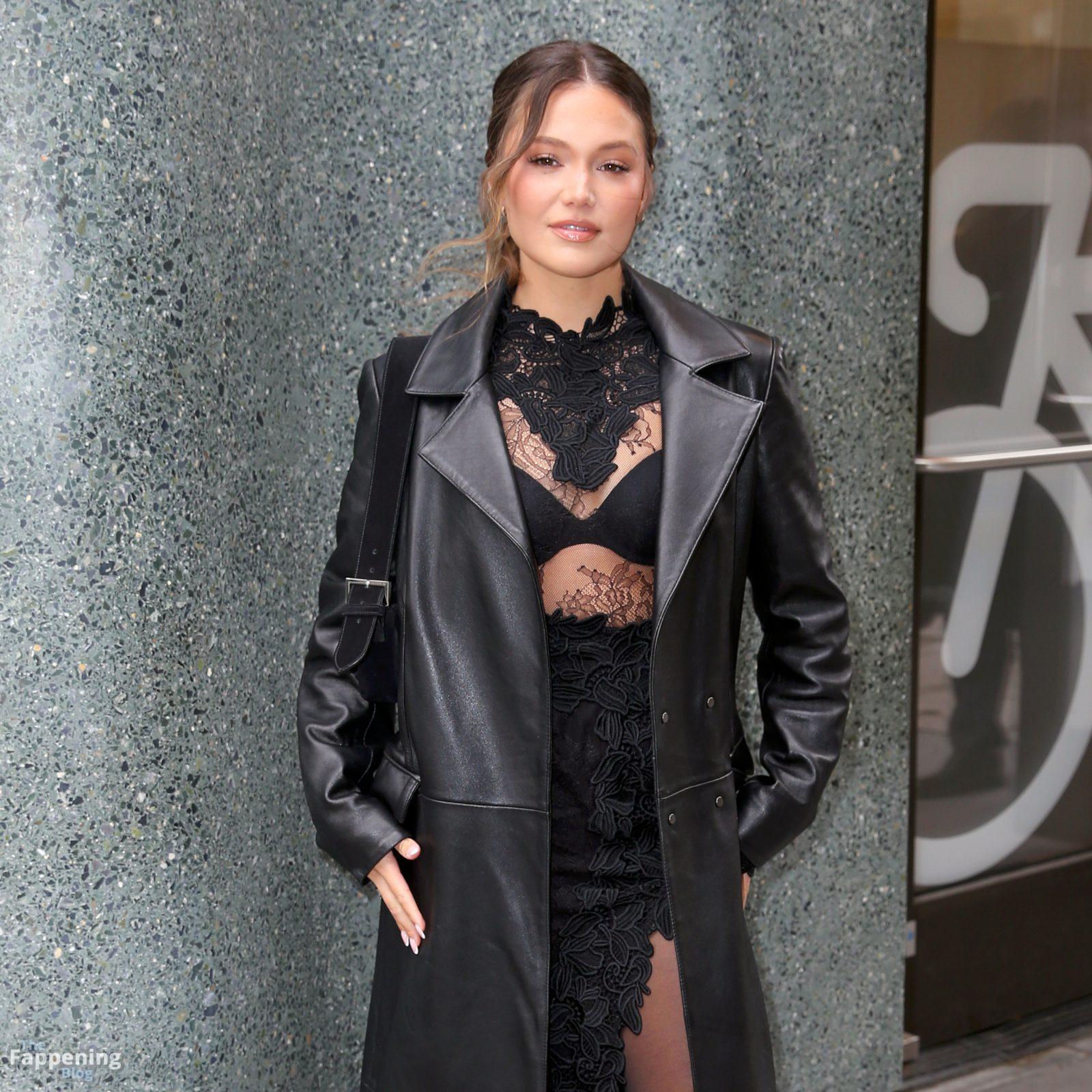Olivia Holt éblouit à New York, défilant dans un body en dentelle transparent et un trench en cuir noir. Admirez ses jambes et son décolleté dans Live with Kelly & Mark à New York.