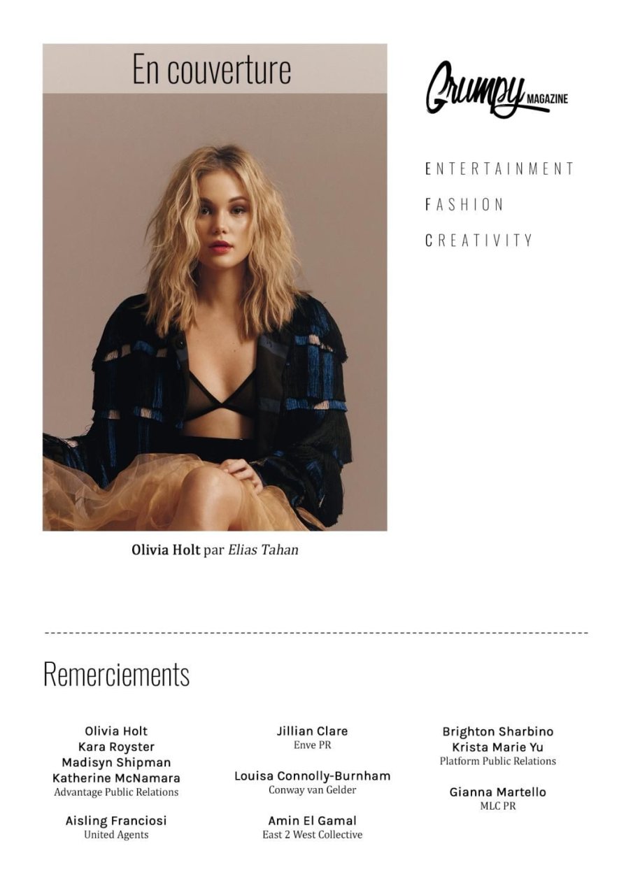 Découvrez de nouvelles photos sexy d’Olivia Holt par Paul Smith pour Grumpy Magazine (février/mars 2017). Olivia Hastings Holt est une actrice et chanteuse américaine. Âge : 19 ans (née le 5 août 1997).