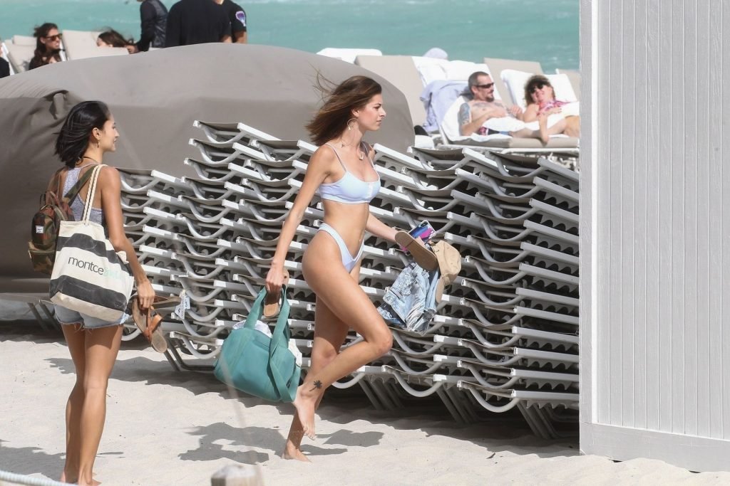 Le mannequin Olivia Pascale, qui a joué dans la série télévisée “Ballers” avec Dwayne Johnson, est vue posant pour des photos avec son amie mannequin Jessica Martin tout en portant de minuscules bikinis à Miami Beach, le 22/01/2019.