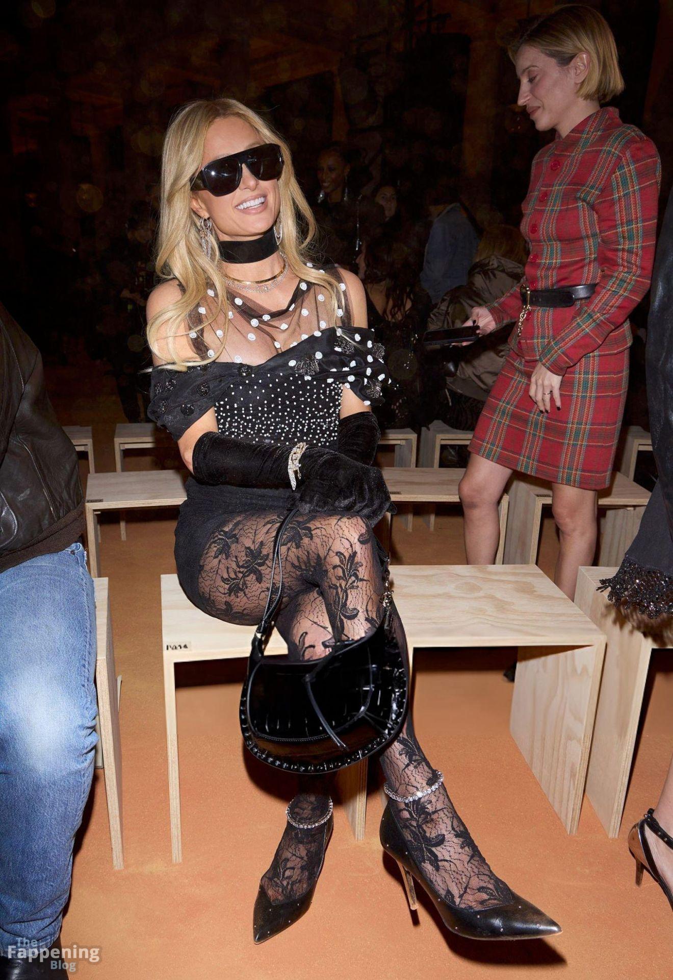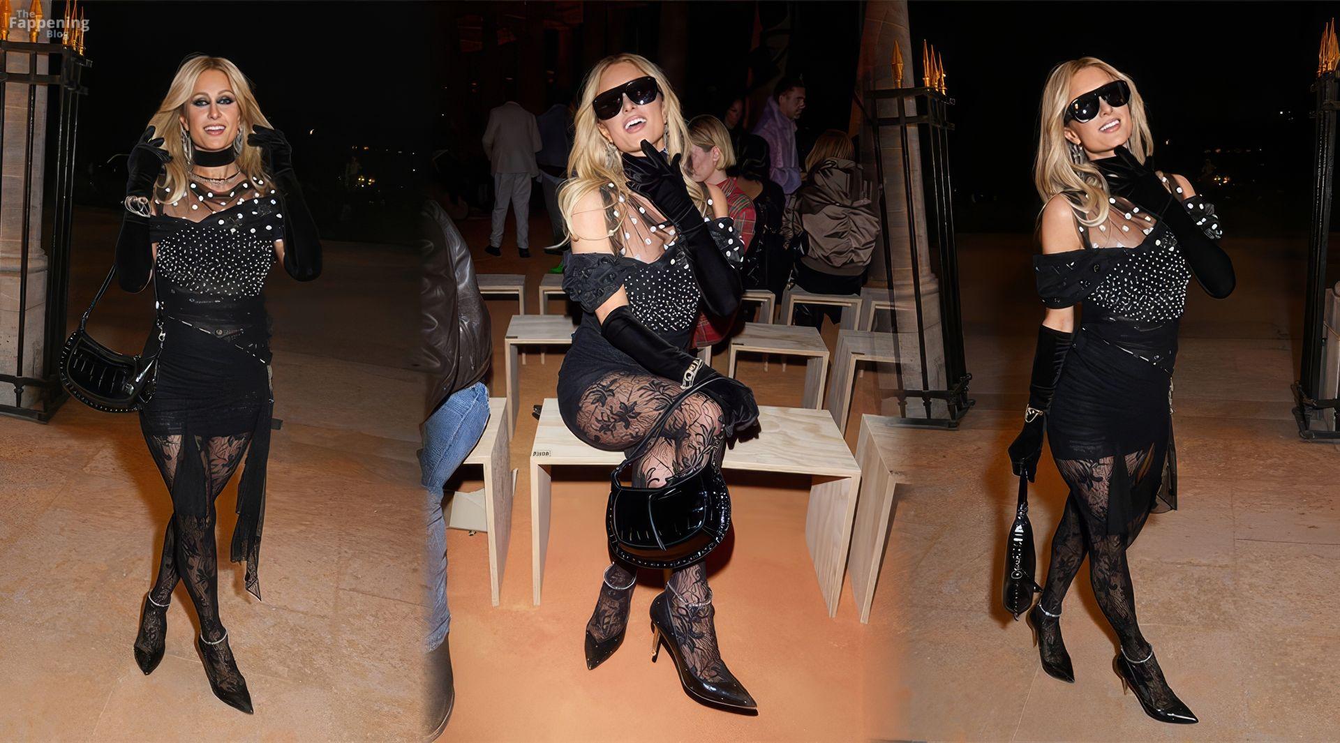 Paris Hilton a exhibé ses jambes sexy dans une mini robe noire transparente lors du défilé Isabel Marant à la Fashion Week de Paris.