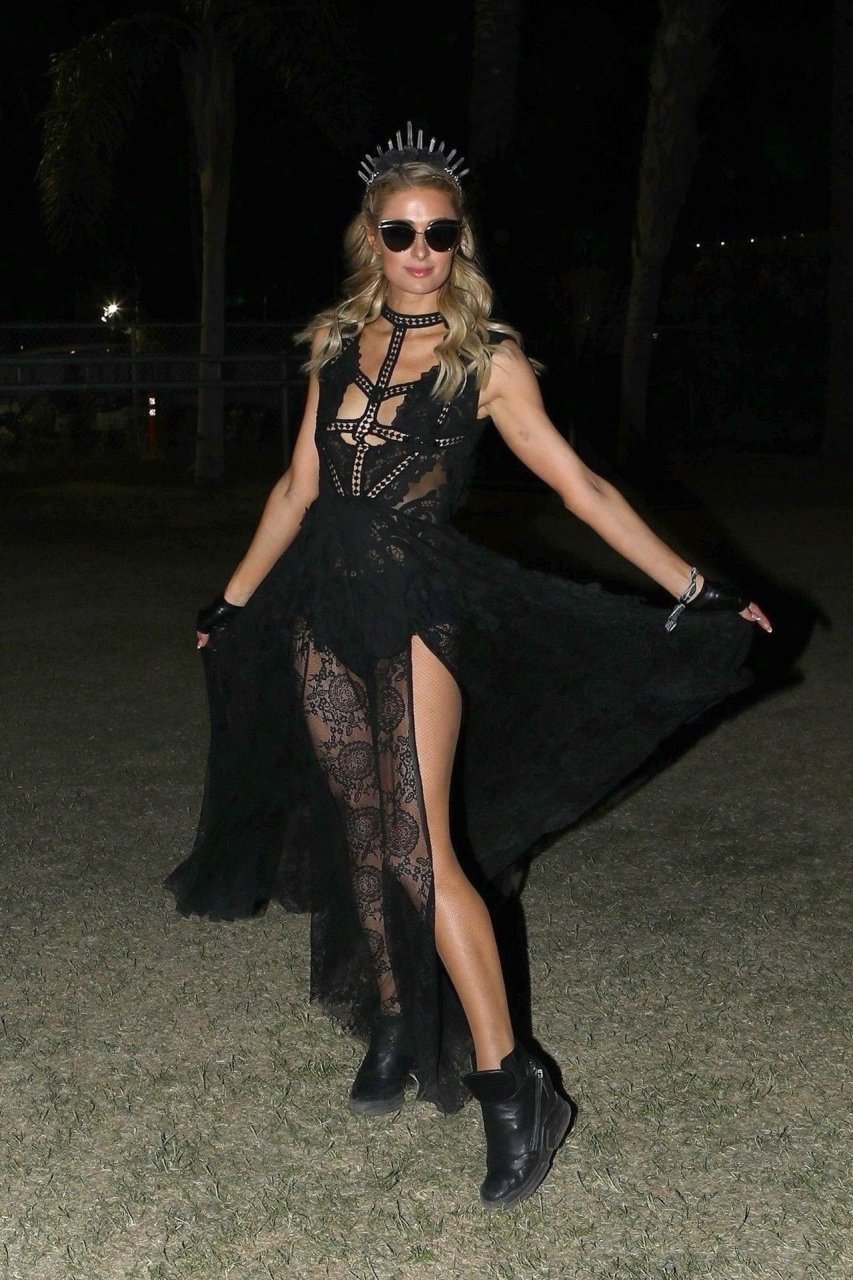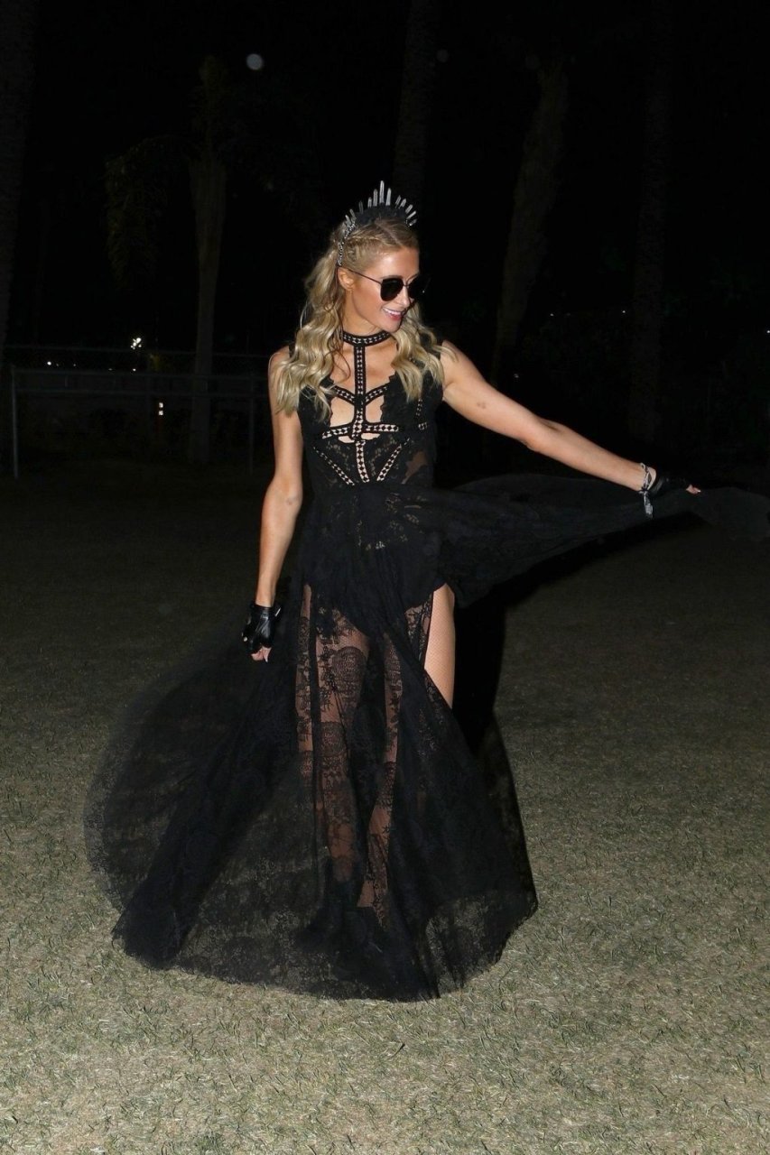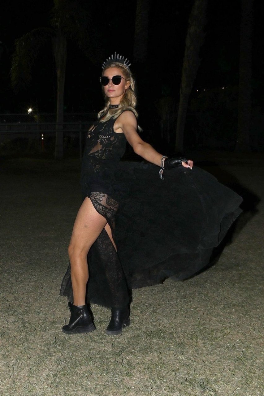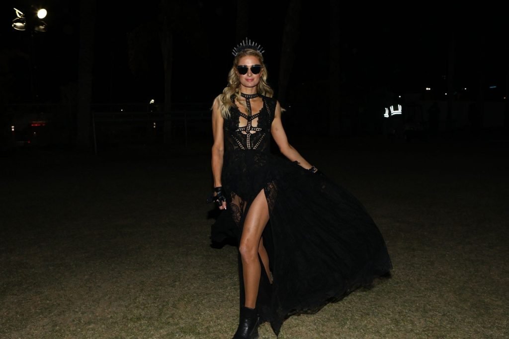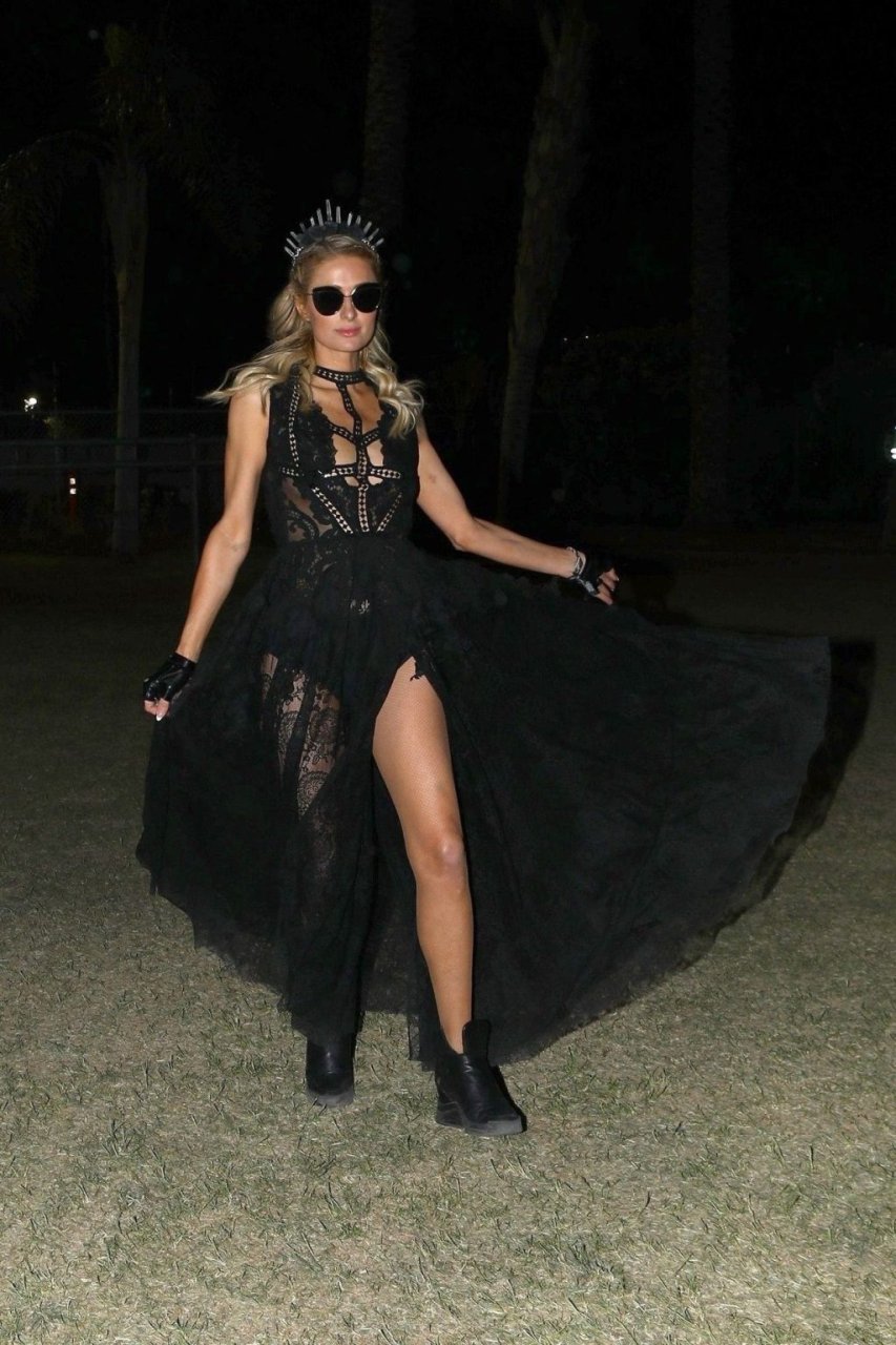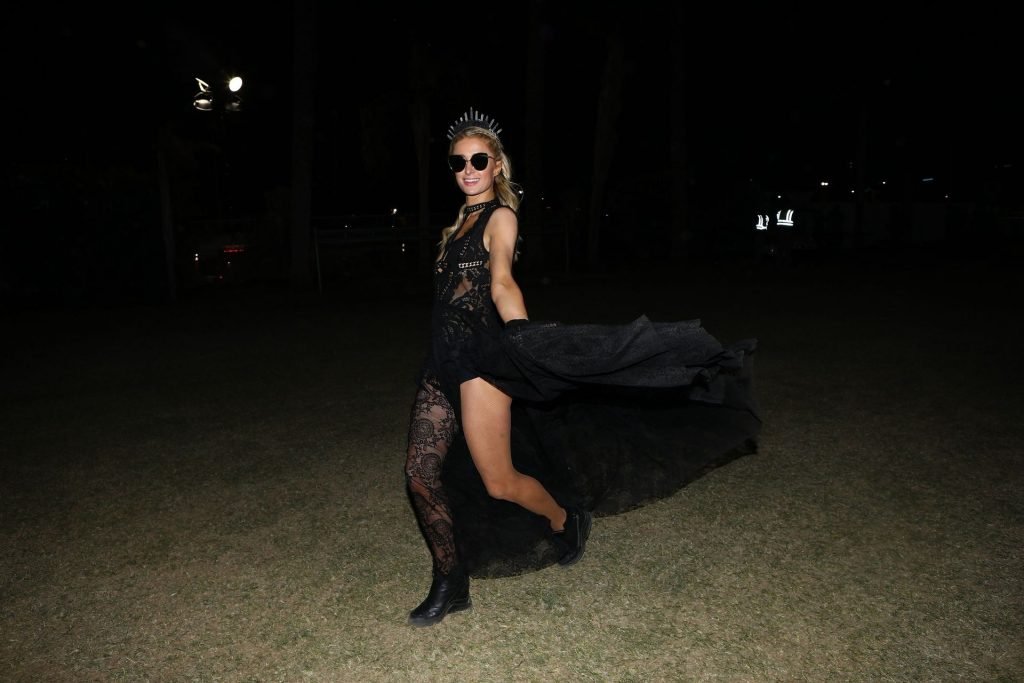 Paris Hilton aux longues jambes opte pour une tenue entièrement noire lors de la troisième nuit du Festival de musique Coachella à Indio, le 14/04/2019.