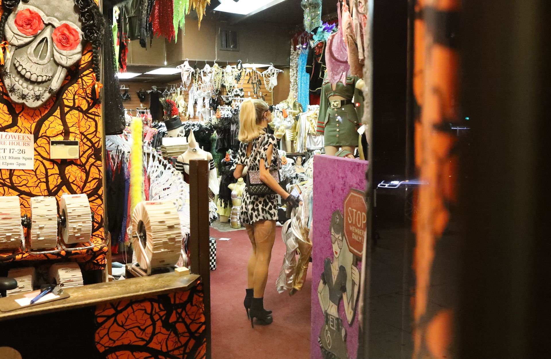 Paris Hilton exhibe sa silhouette incroyablement sexy dans une combinaison super décolletée à imprimé dalmatien, mettant en valeur son décolleté et ses jambes parfaites tout en faisant du shopping pour le costume d’Halloween parfait chez Trashy Lingerie à Hollywood, 03/10/2019.