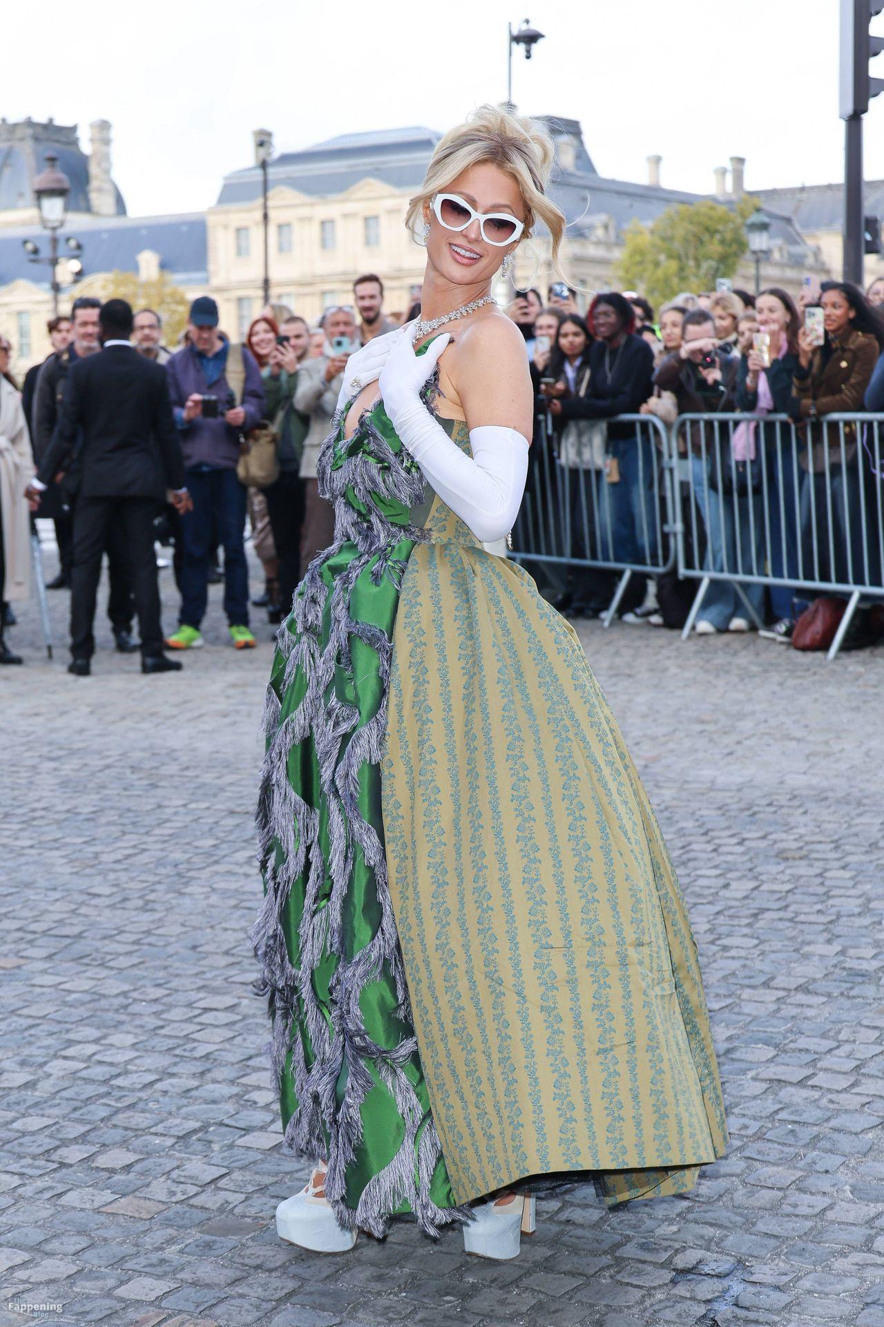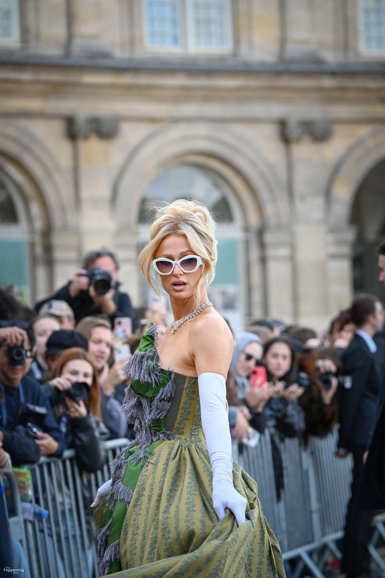 Paris Hilton a dominé la Fashion Week de Paris, arborant une robe verte plongeante de Vivienne Westwood qui laissait entrevoir son décolleté.