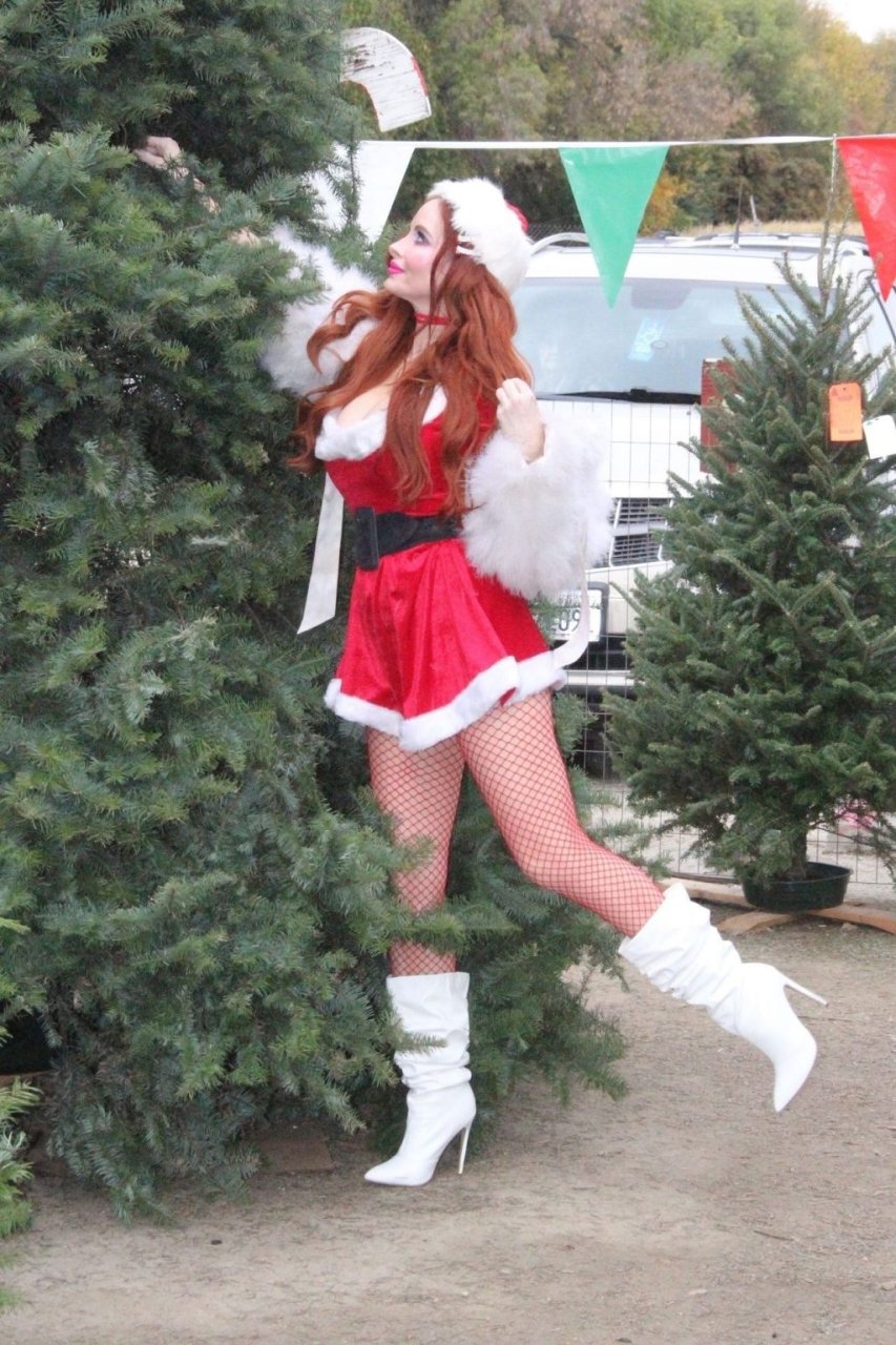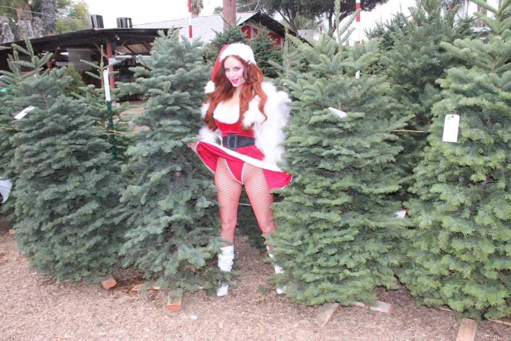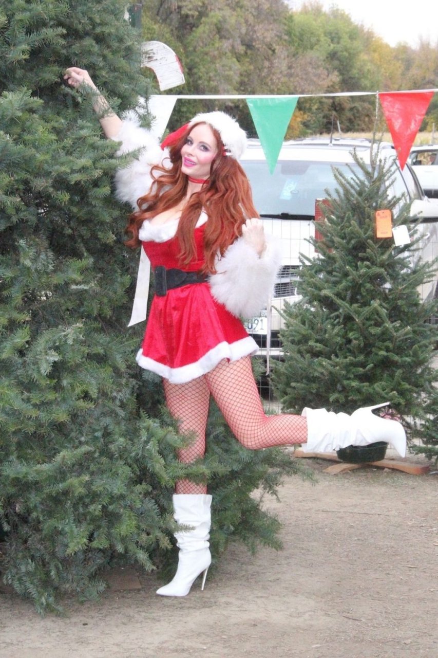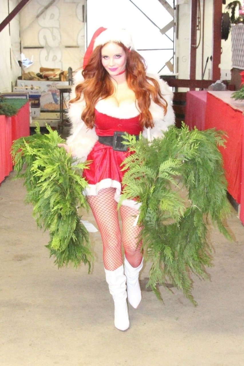 Phoebe Price se met dans l’esprit des fêtes en s’habillant en Père Noël dans une ferme de sapins de Noël à Los Angeles, le 14/12/2018.