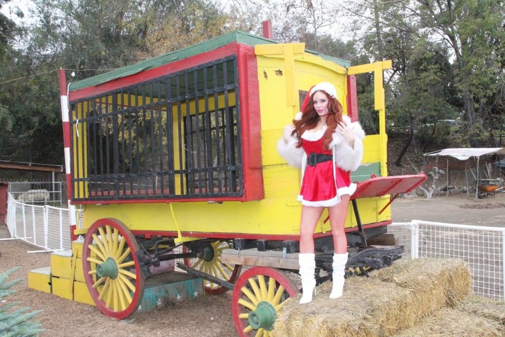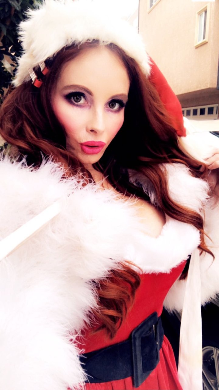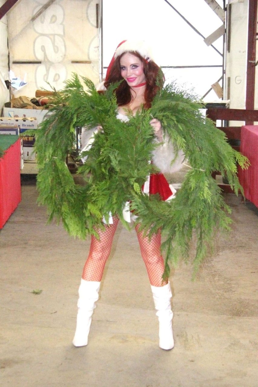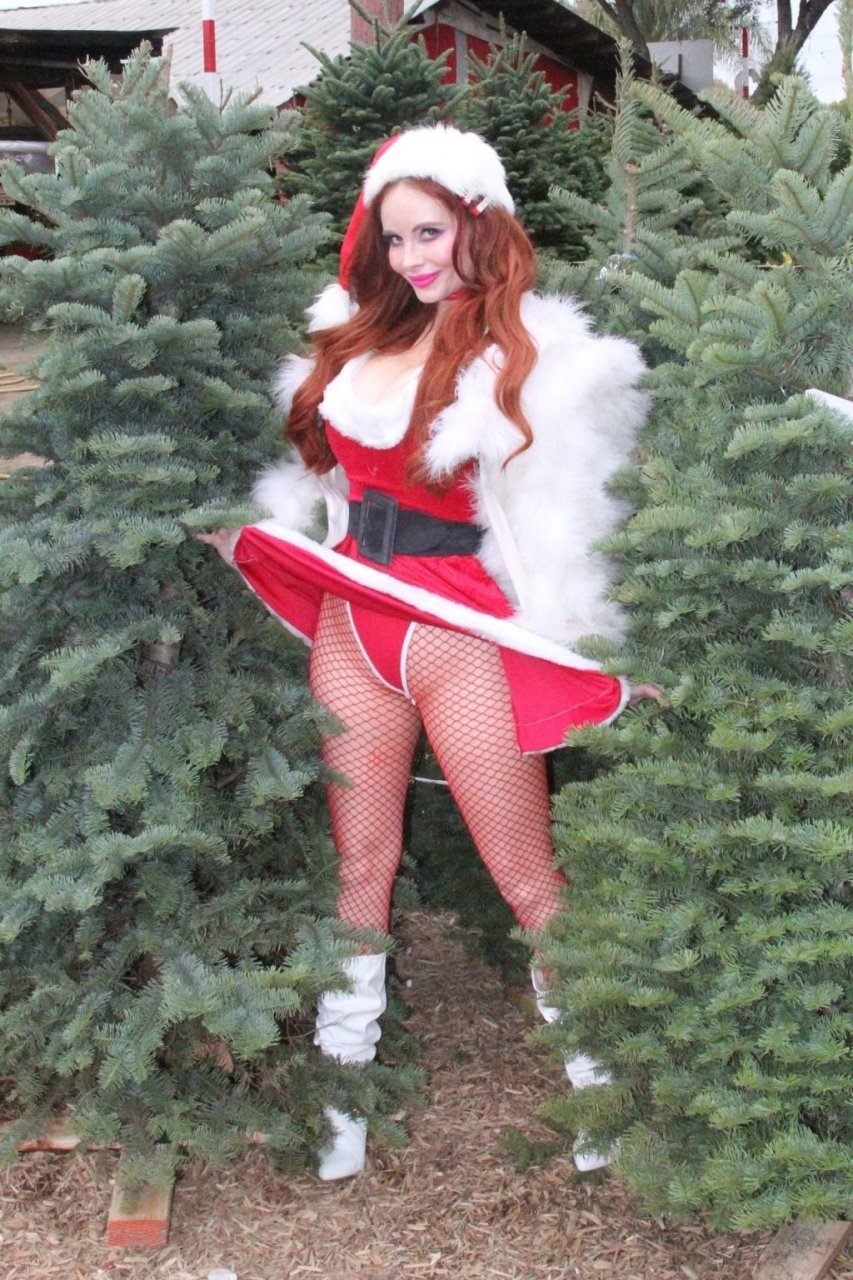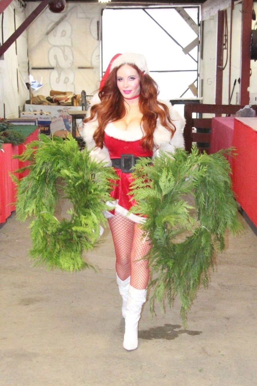 Phoebe Price se met dans l’esprit des fêtes en s’habillant en Père Noël dans une ferme de sapins de Noël à Los Angeles, le 14/12/2018.