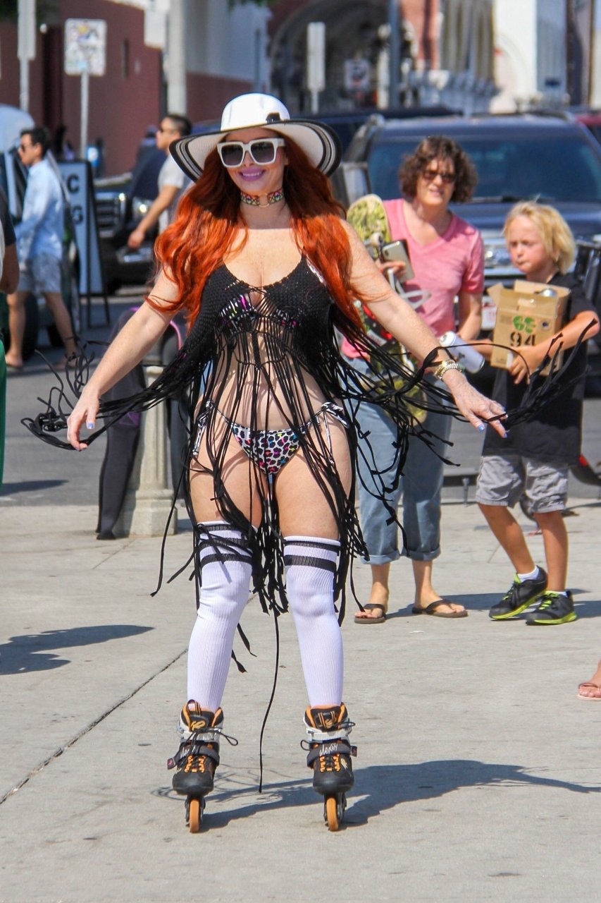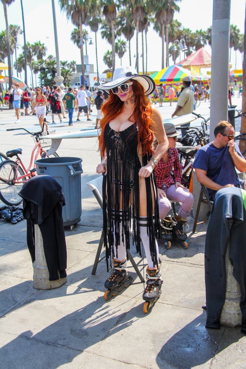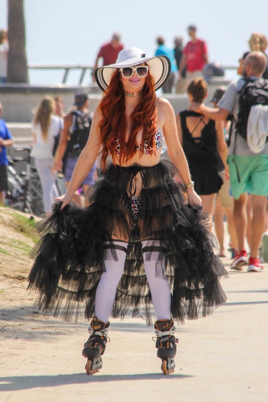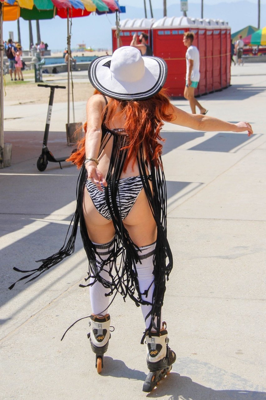 L’ancienne actrice Phoebe Price (45 ans) porte un bikini coloré à imprimé léopard alors qu’elle fait du roller à Venise, le 05/08/2018. En essayant de poser pour la caméra, elle tombe et tente de faire comme si de rien n’était.