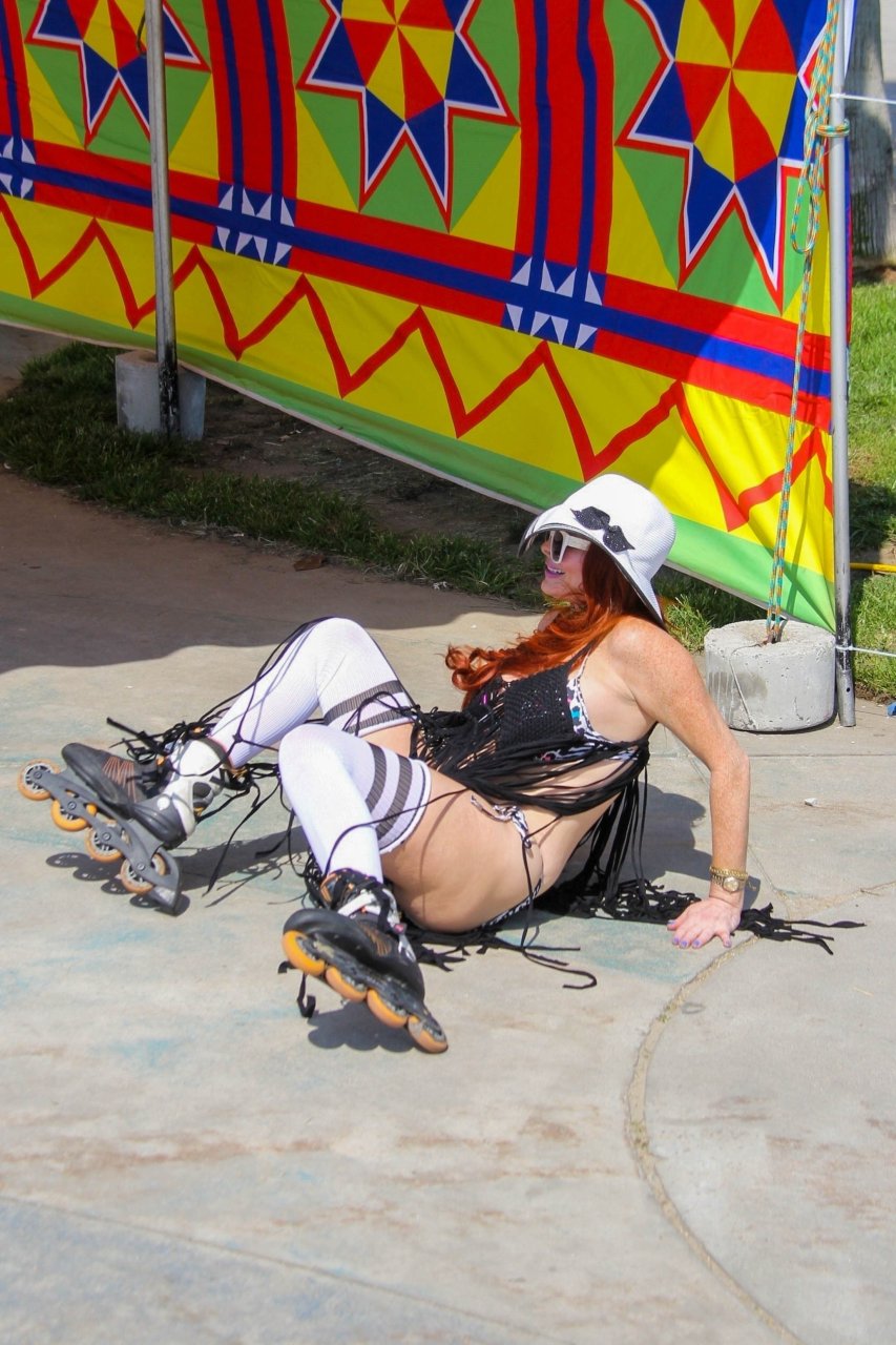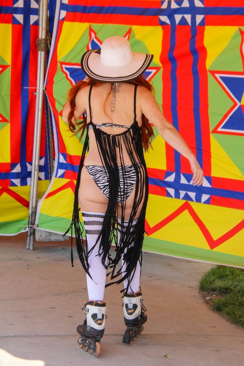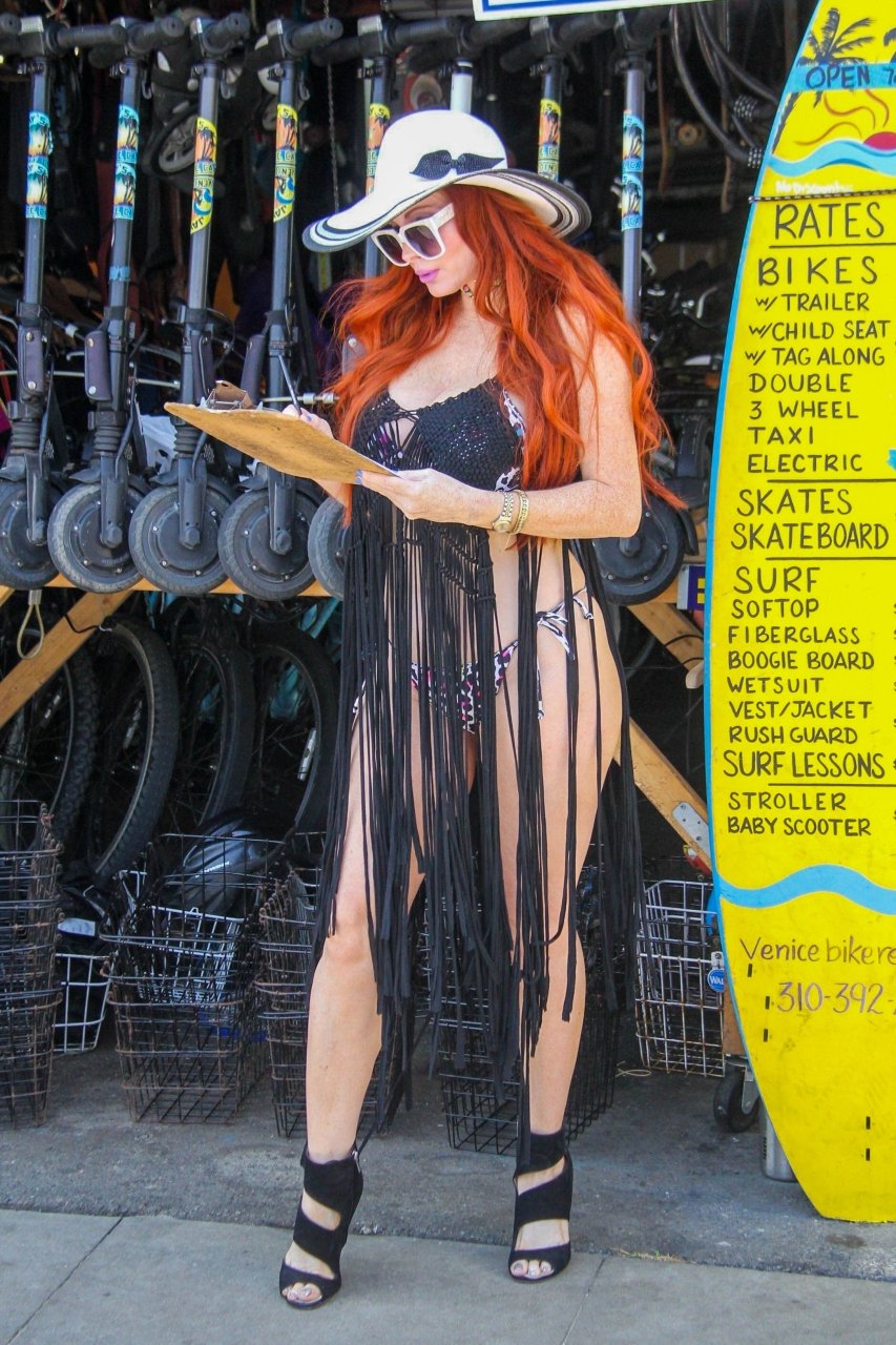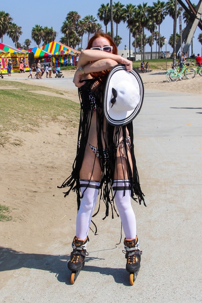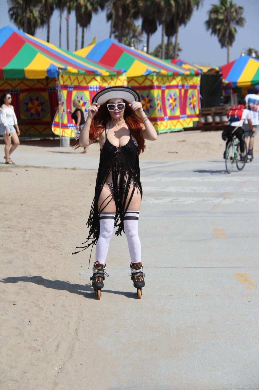 L’ancienne actrice Phoebe Price (45 ans) porte un bikini coloré à imprimé léopard alors qu’elle fait du roller à Venise, le 05/08/2018. En essayant de poser pour la caméra, elle tombe et tente de faire comme si de rien n’était.