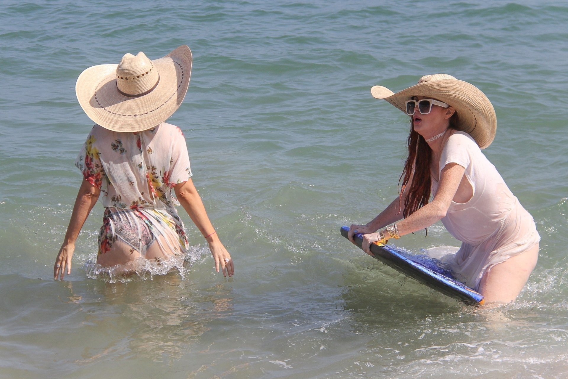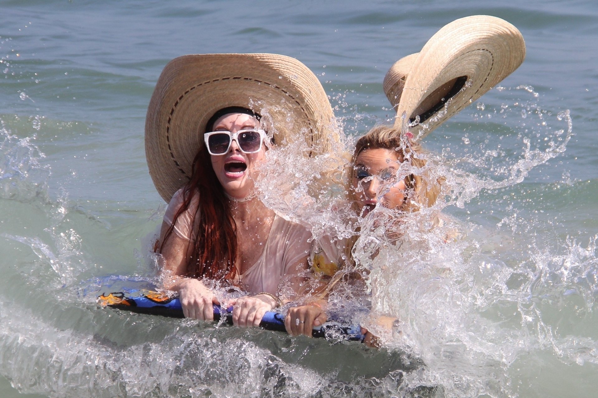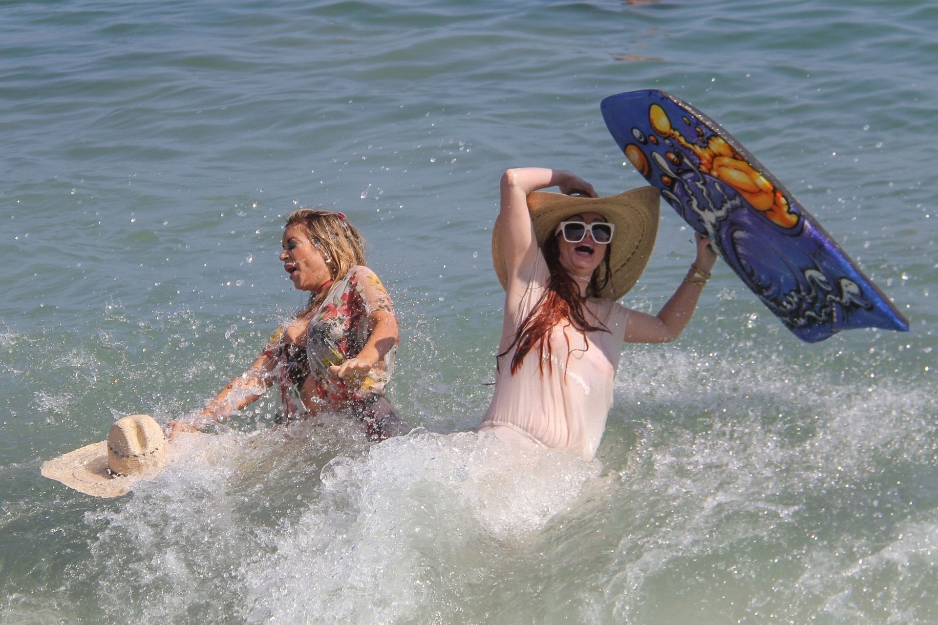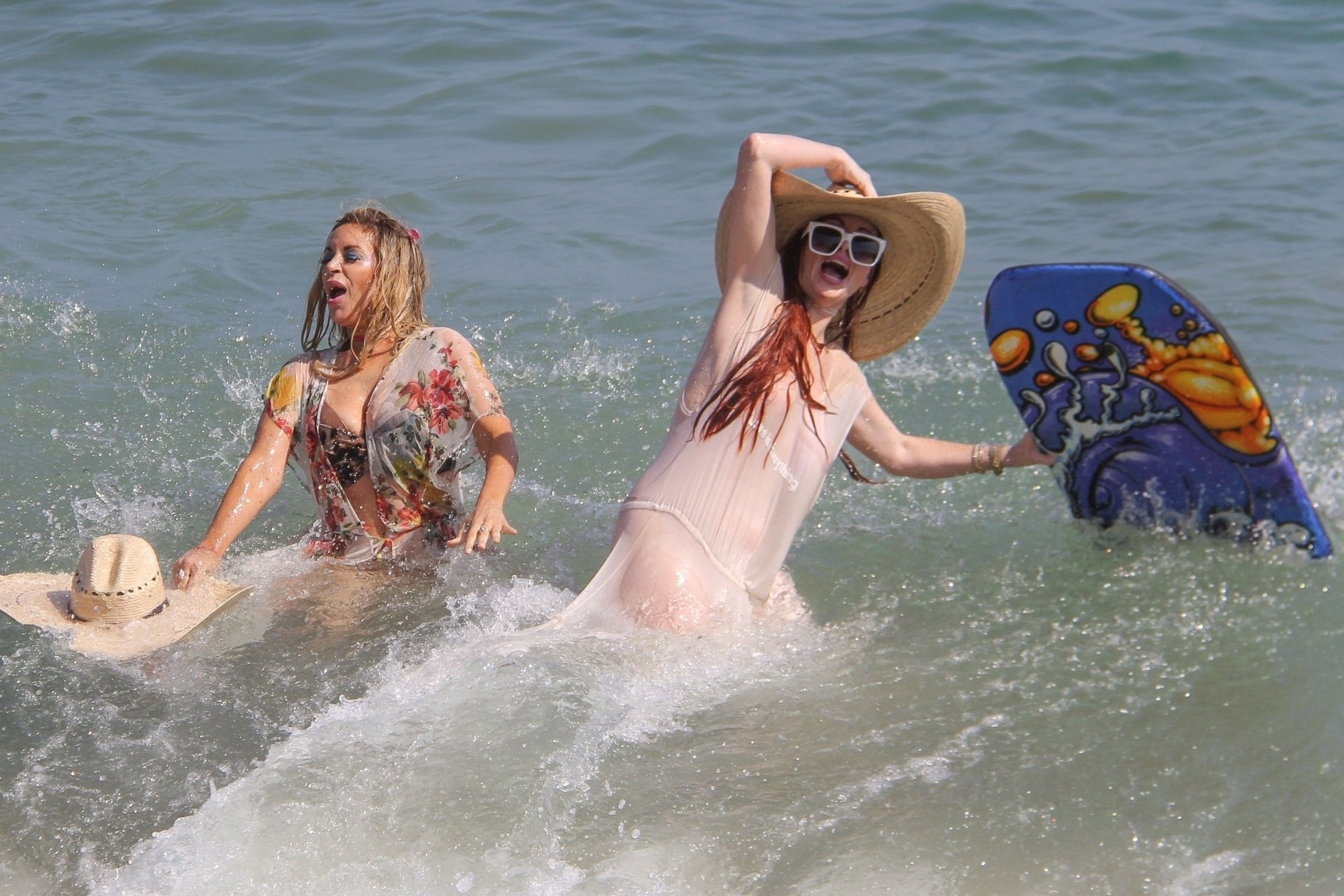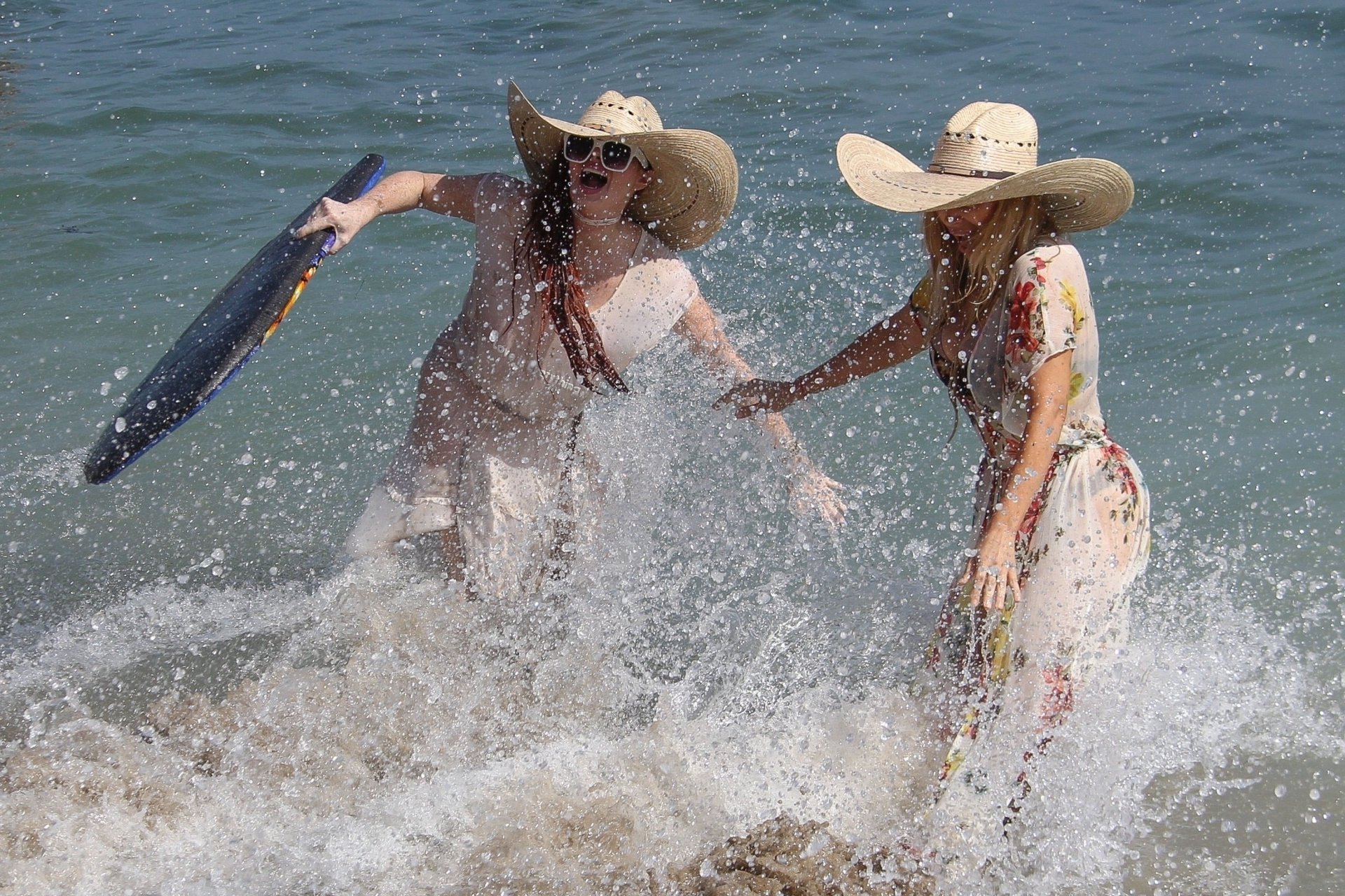 L’actrice Phoebe Price et son amie Marcela Iglesias profitent d’une journée folle à la plage ensemble, 20/08/2018.