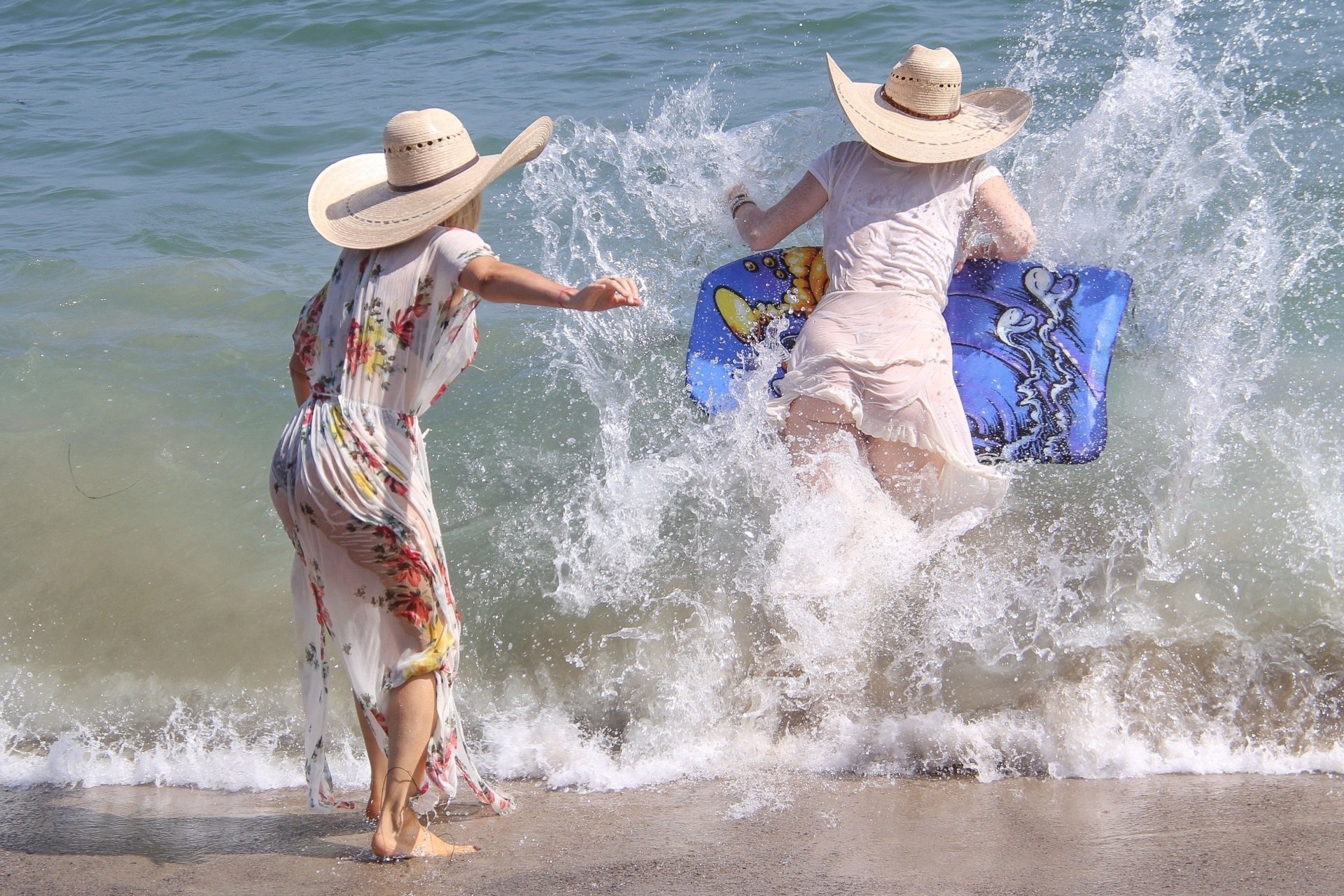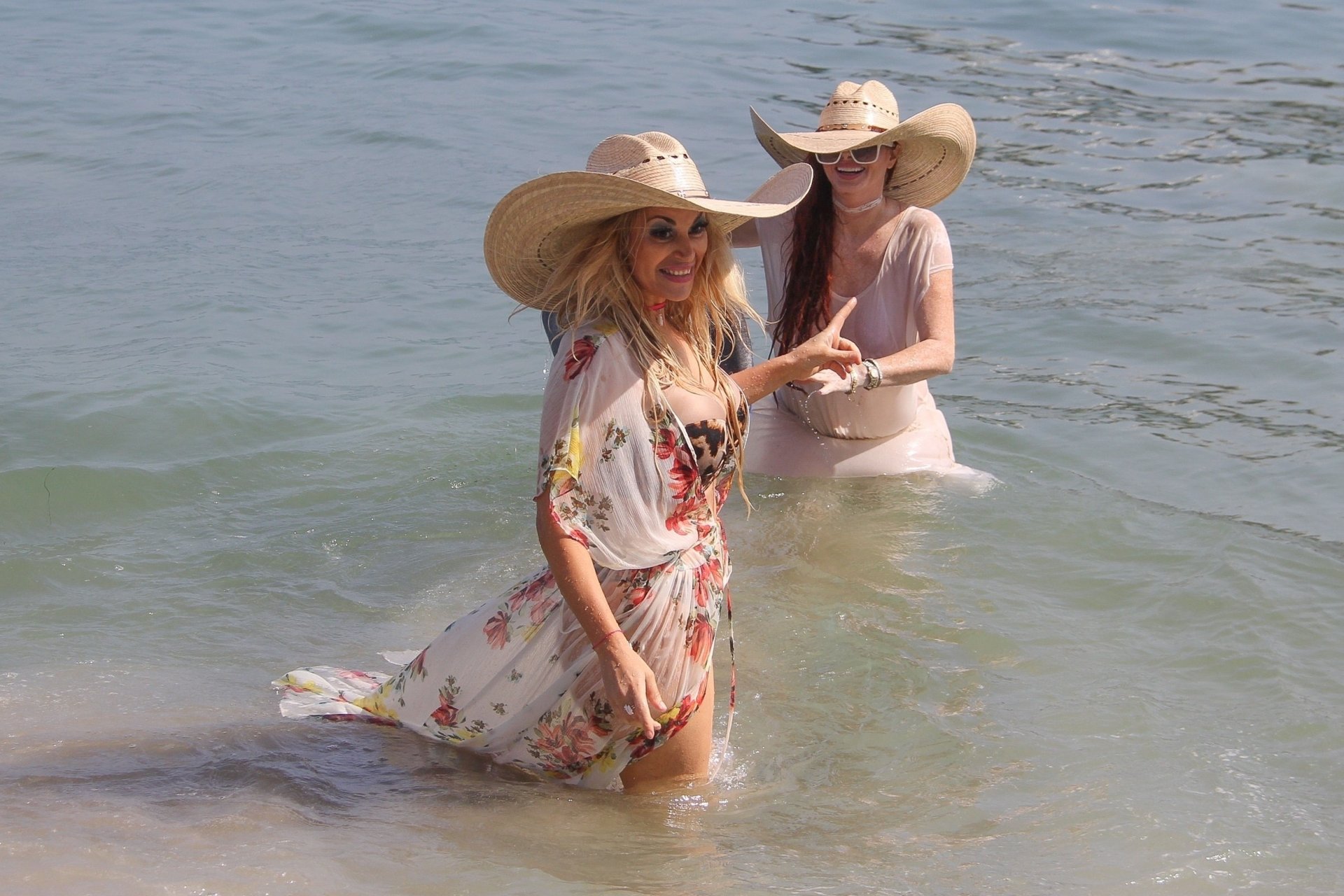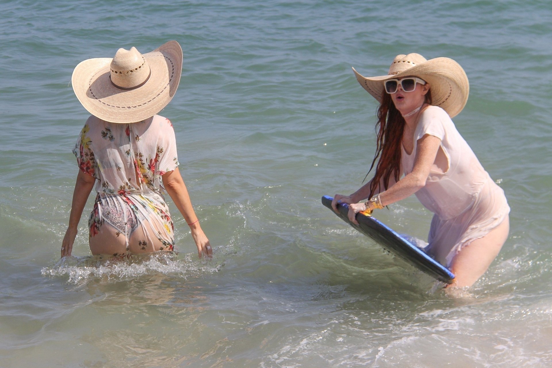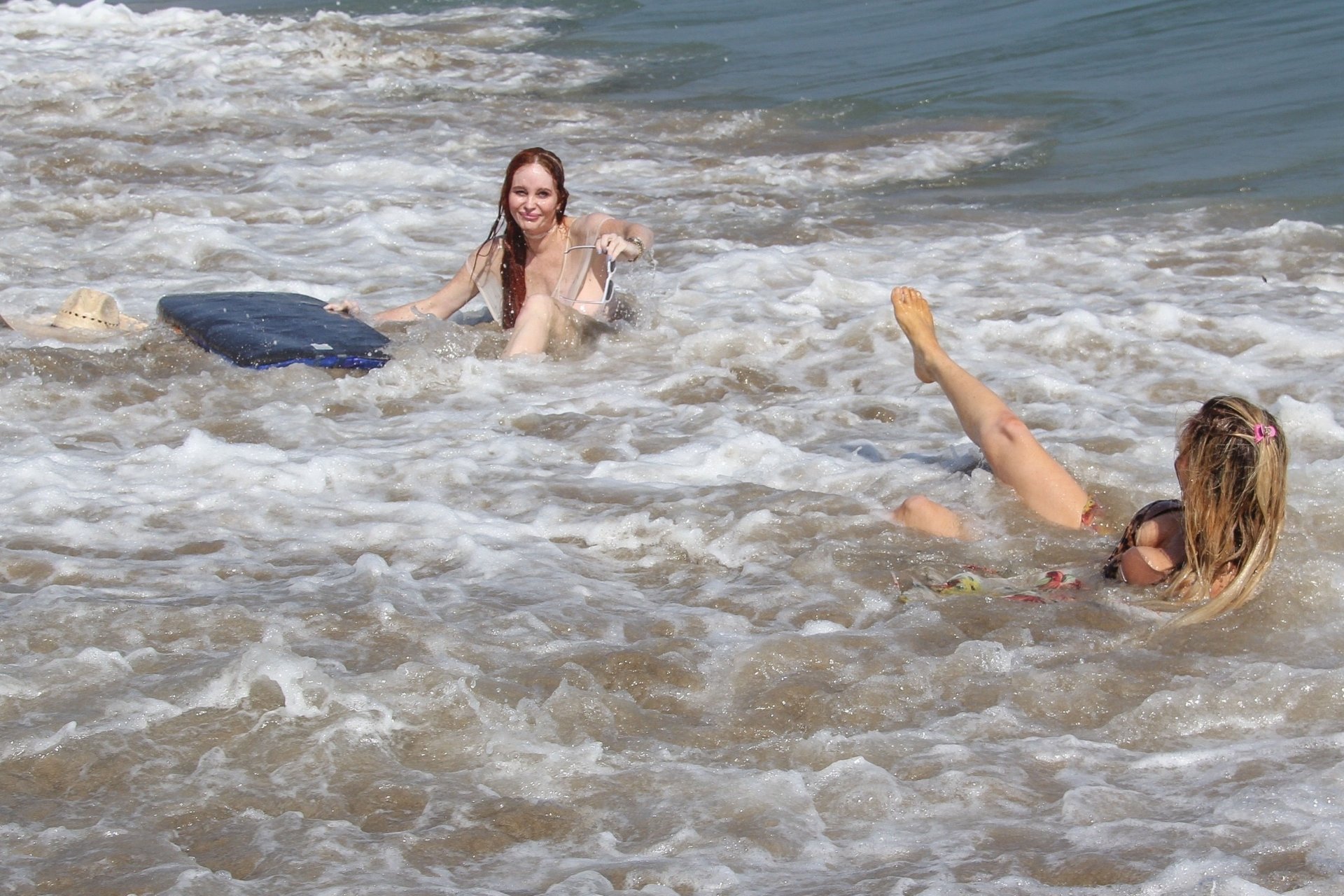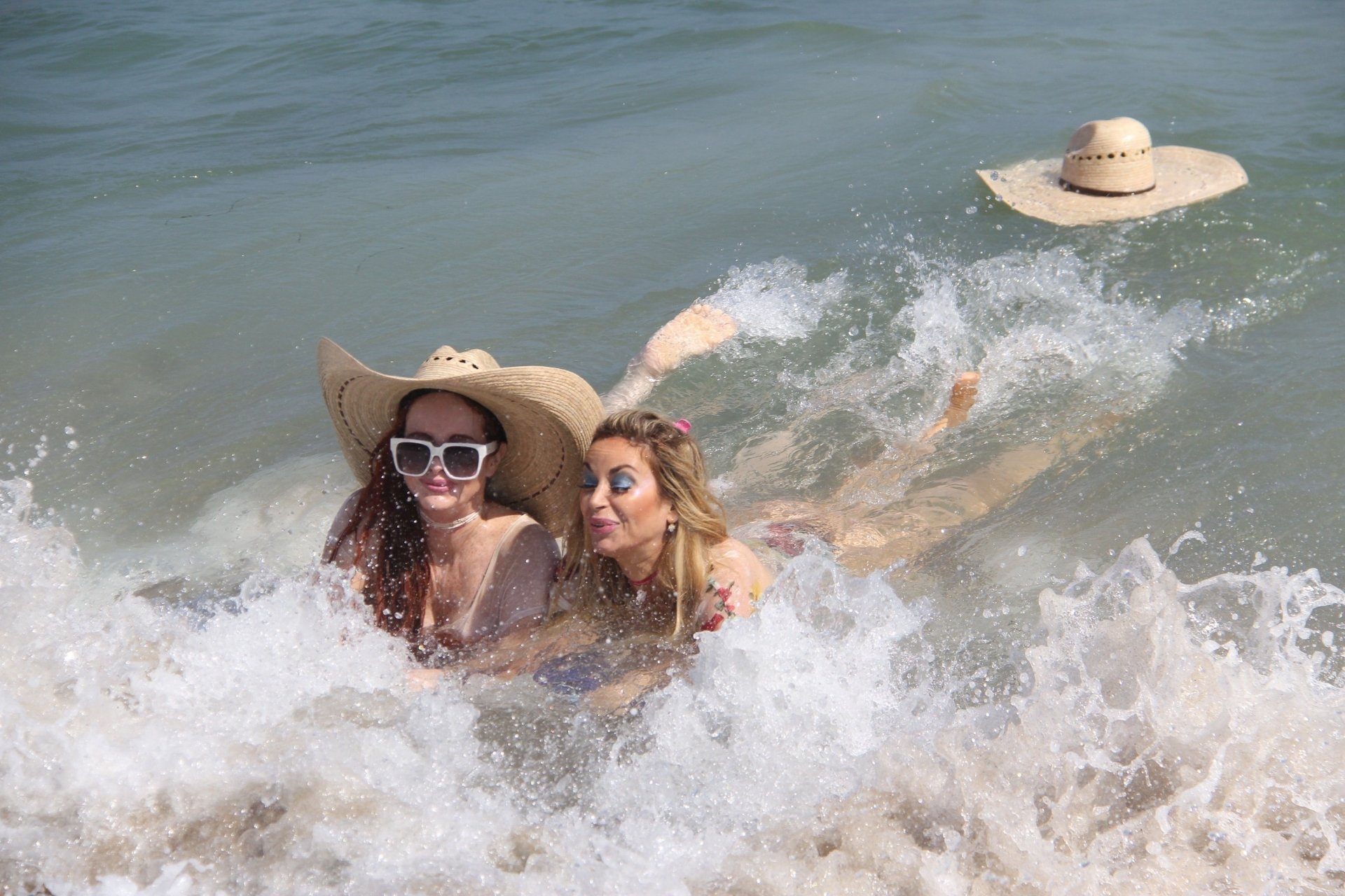 L’actrice Phoebe Price et son amie Marcela Iglesias profitent d’une journée folle à la plage ensemble, 20/08/2018.
