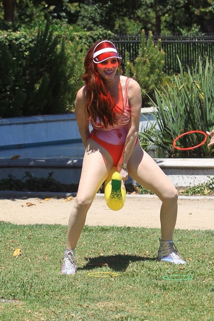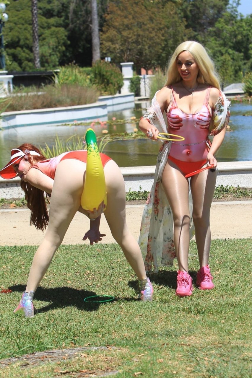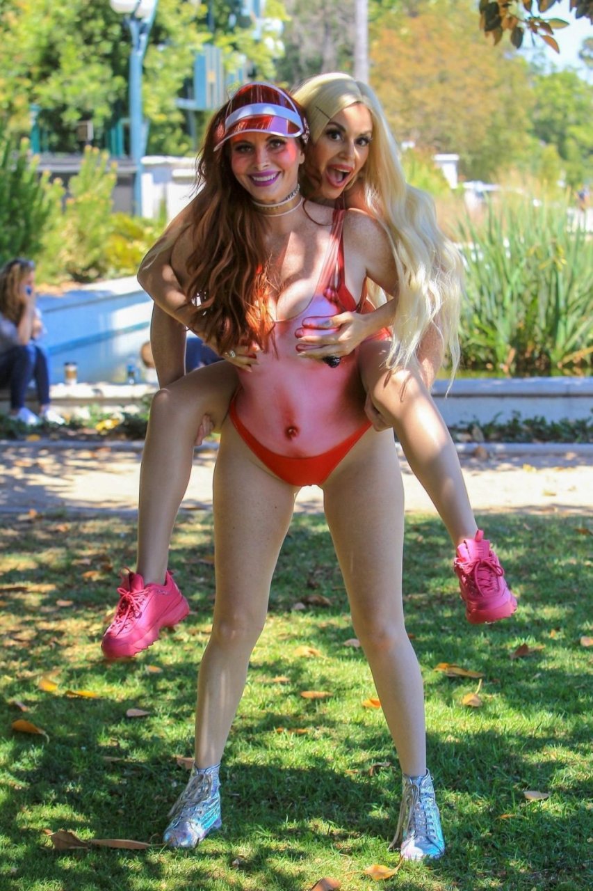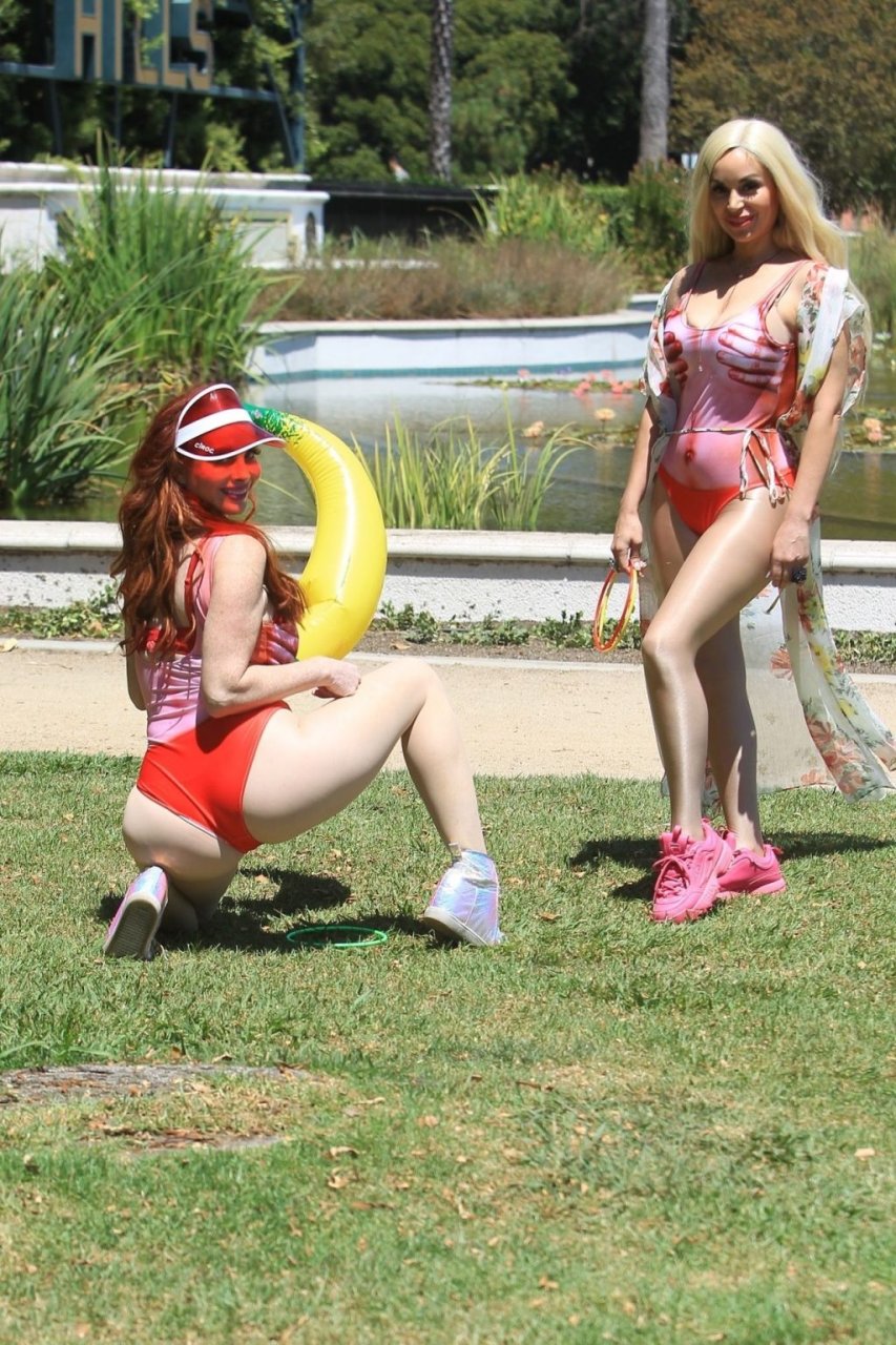 Phoebe Price et Marcela Iglesias s’amusent au parc à Beverly Hills et offrent un spectacle audacieux en justaucorps rouges, 15/08/2019. Phoebe, il est temps de jouer avec une banane “normale” !