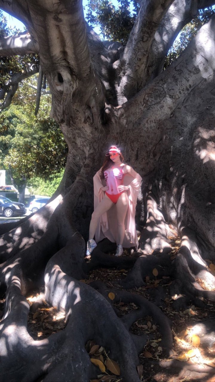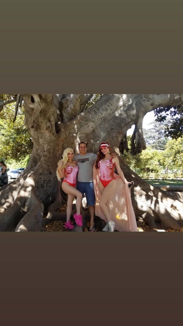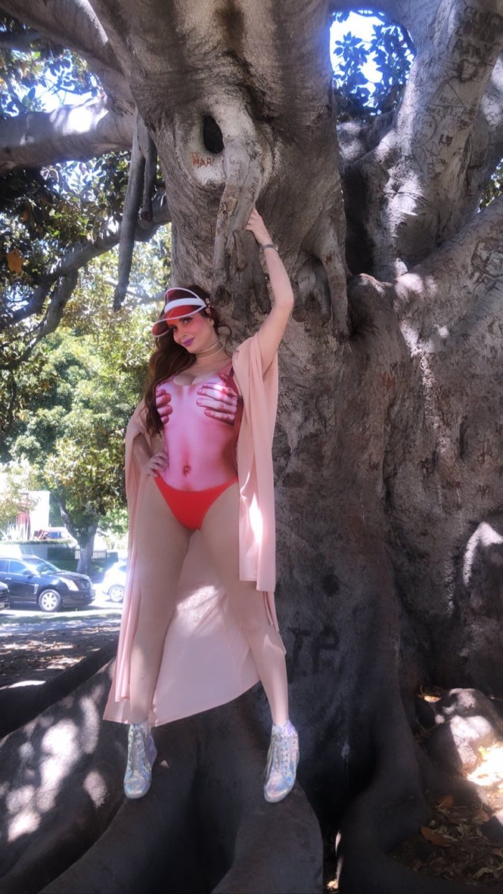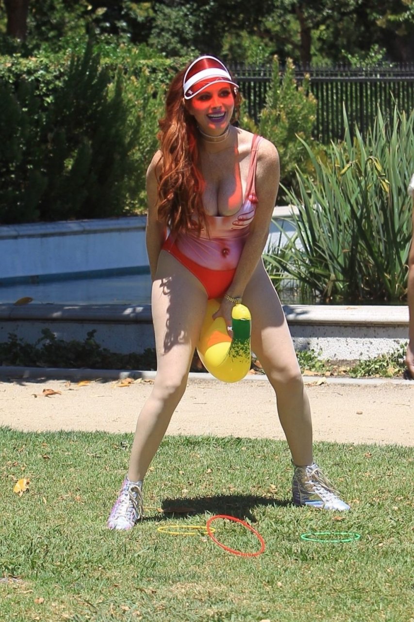 Phoebe Price et Marcela Iglesias s’amusent au parc à Beverly Hills et offrent un spectacle audacieux en justaucorps rouges, 15/08/2019. Phoebe, il est temps de jouer avec une banane “normale” !