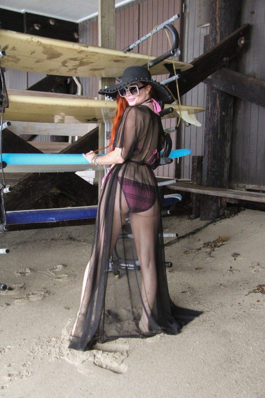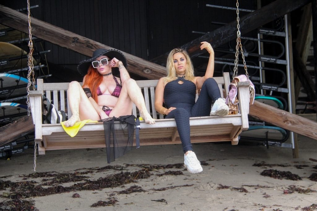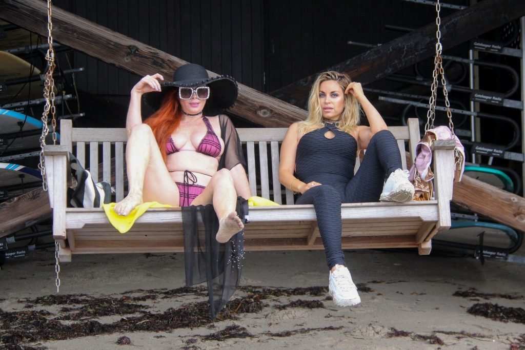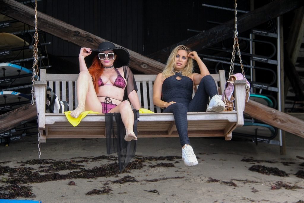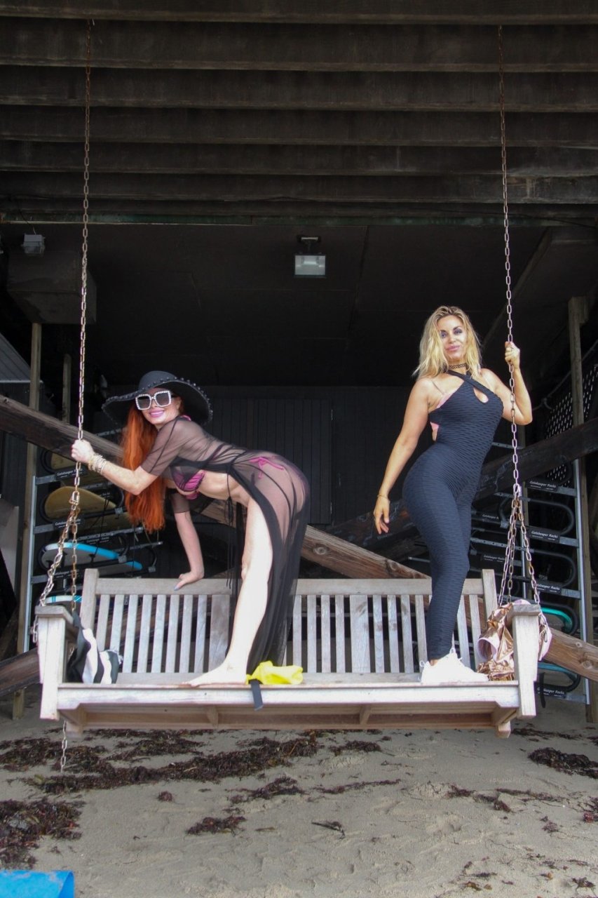 Phoebe Price (45 ans) profite d’un après-midi à traîner avec son amie actrice Marcela Iglesias sur la plage de Malibu, portant un bikini noir et violet avec un manteau transparent, 18/07/2018. Les deux posent et s’assoient sur une balançoire en attendant que le soleil se montre.