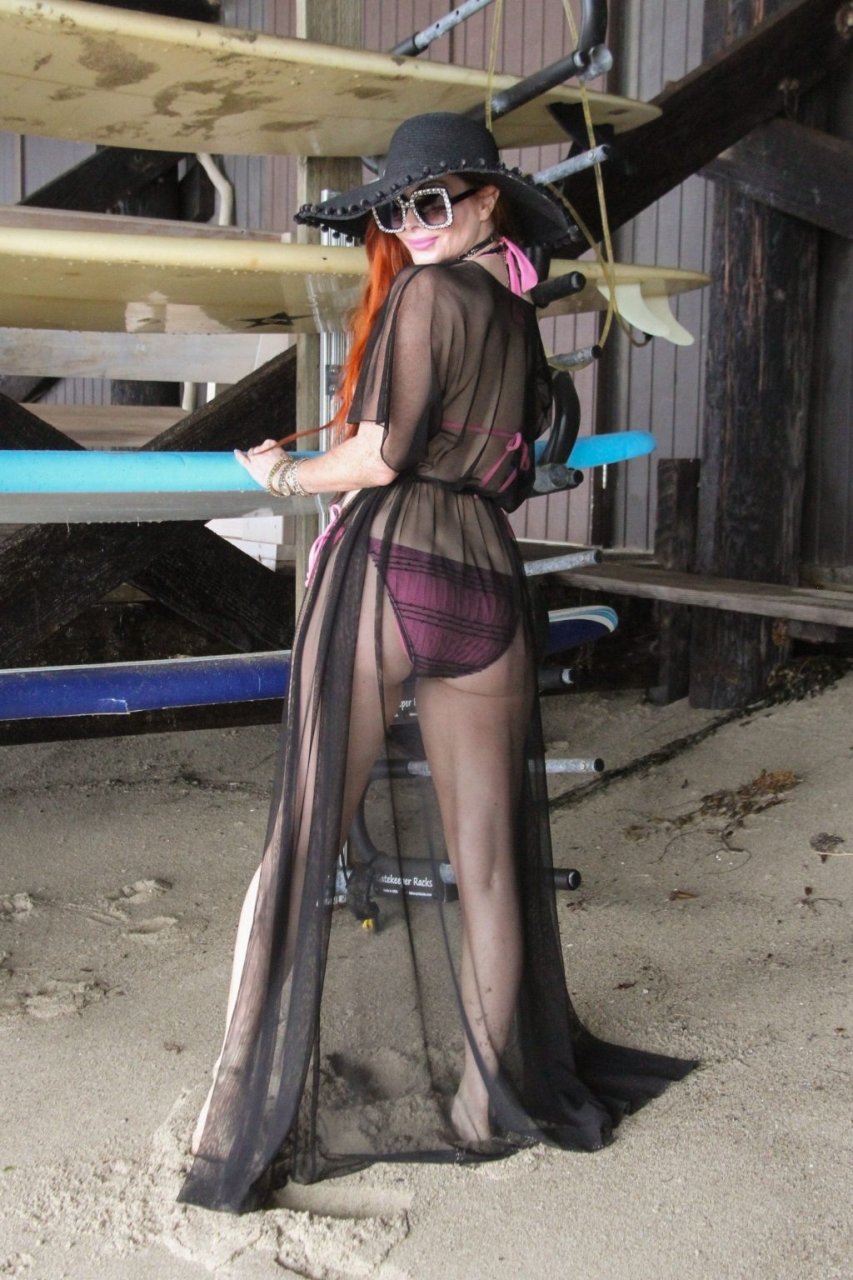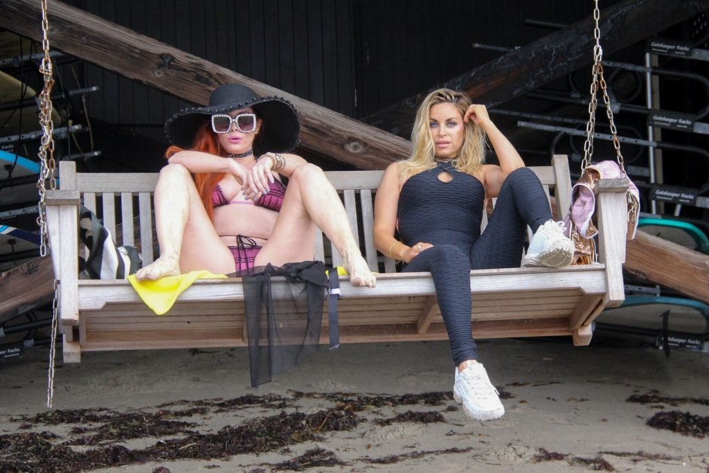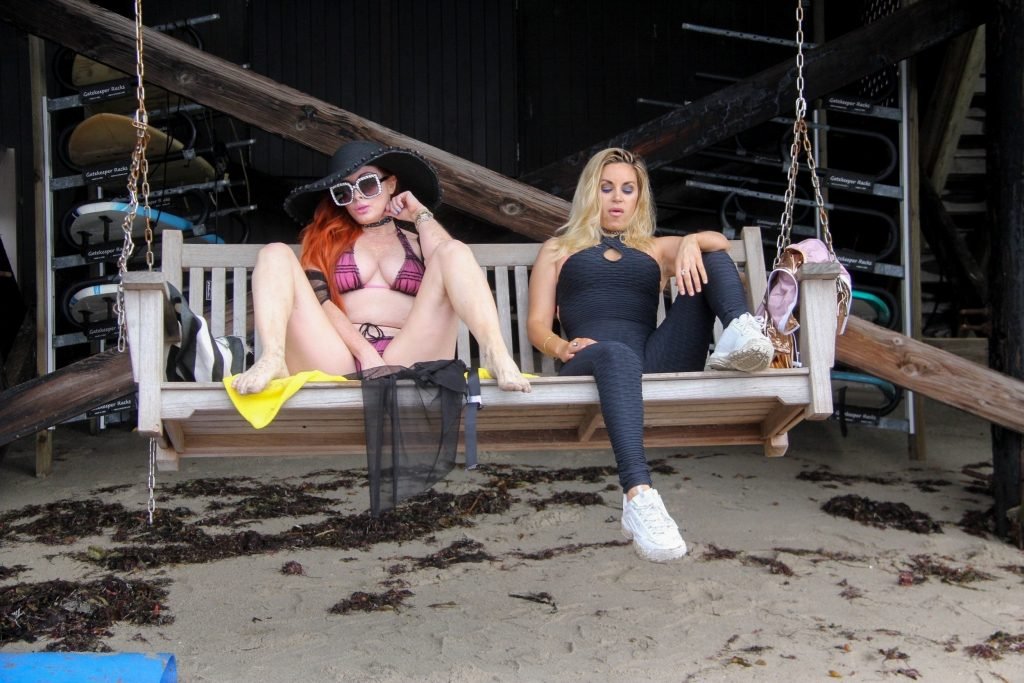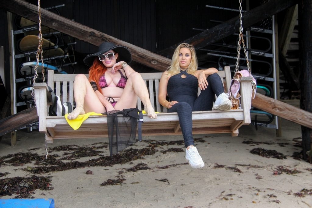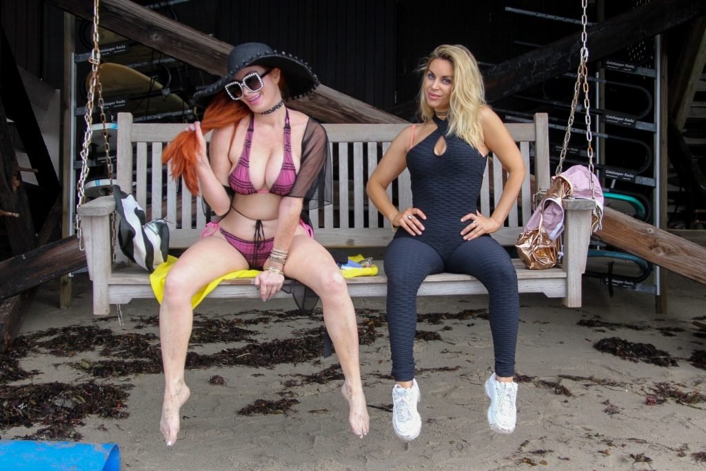 Phoebe Price (45 ans) profite d’un après-midi à traîner avec son amie actrice Marcela Iglesias sur la plage de Malibu, portant un bikini noir et violet avec un manteau transparent, 18/07/2018. Les deux posent et s’assoient sur une balançoire en attendant que le soleil se montre.