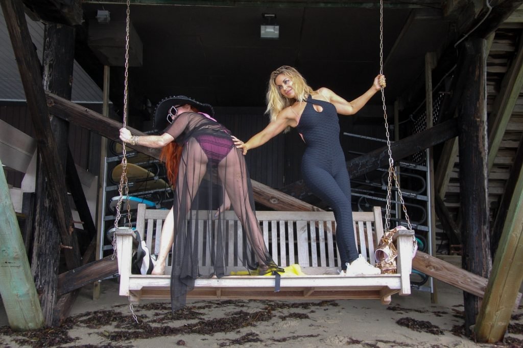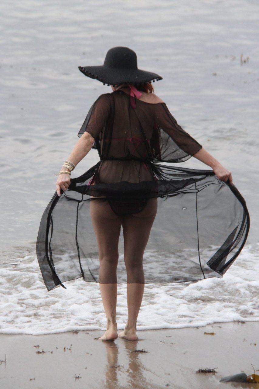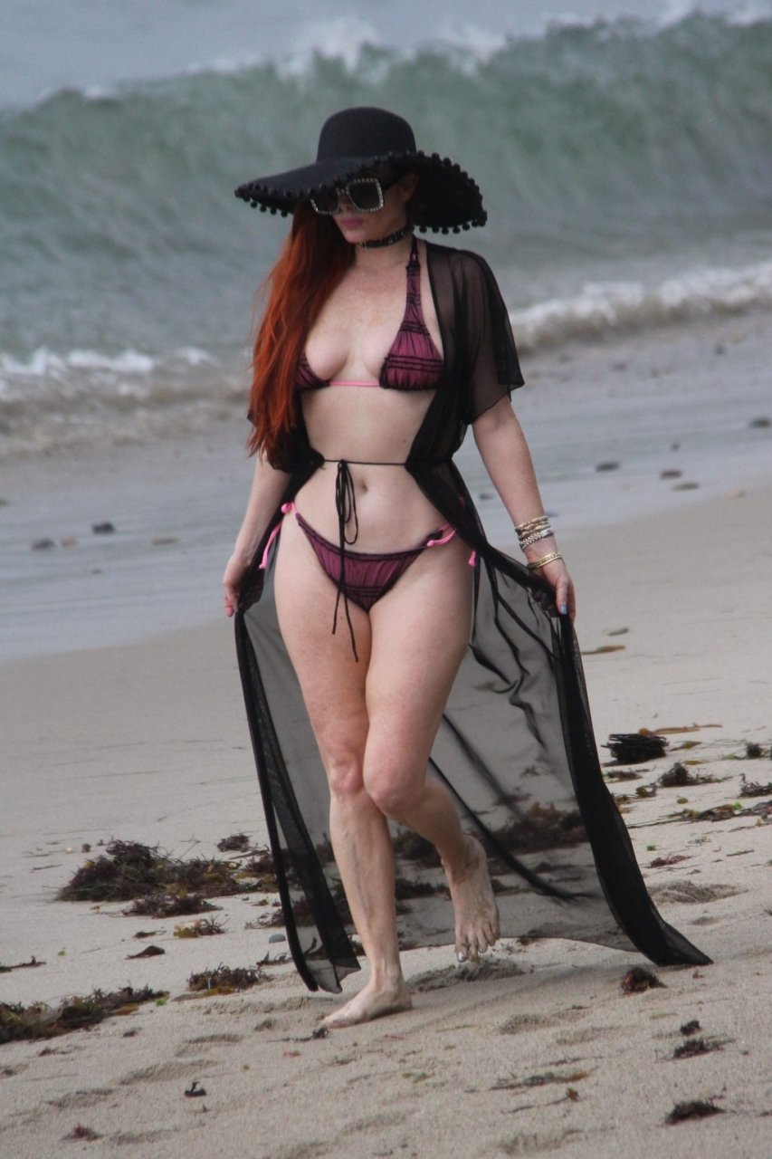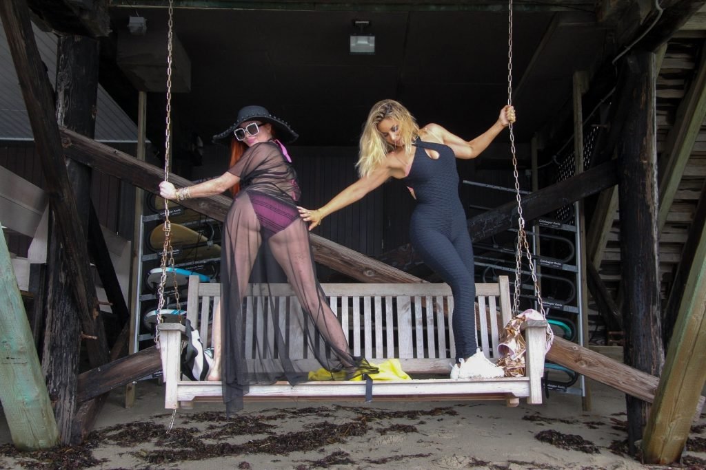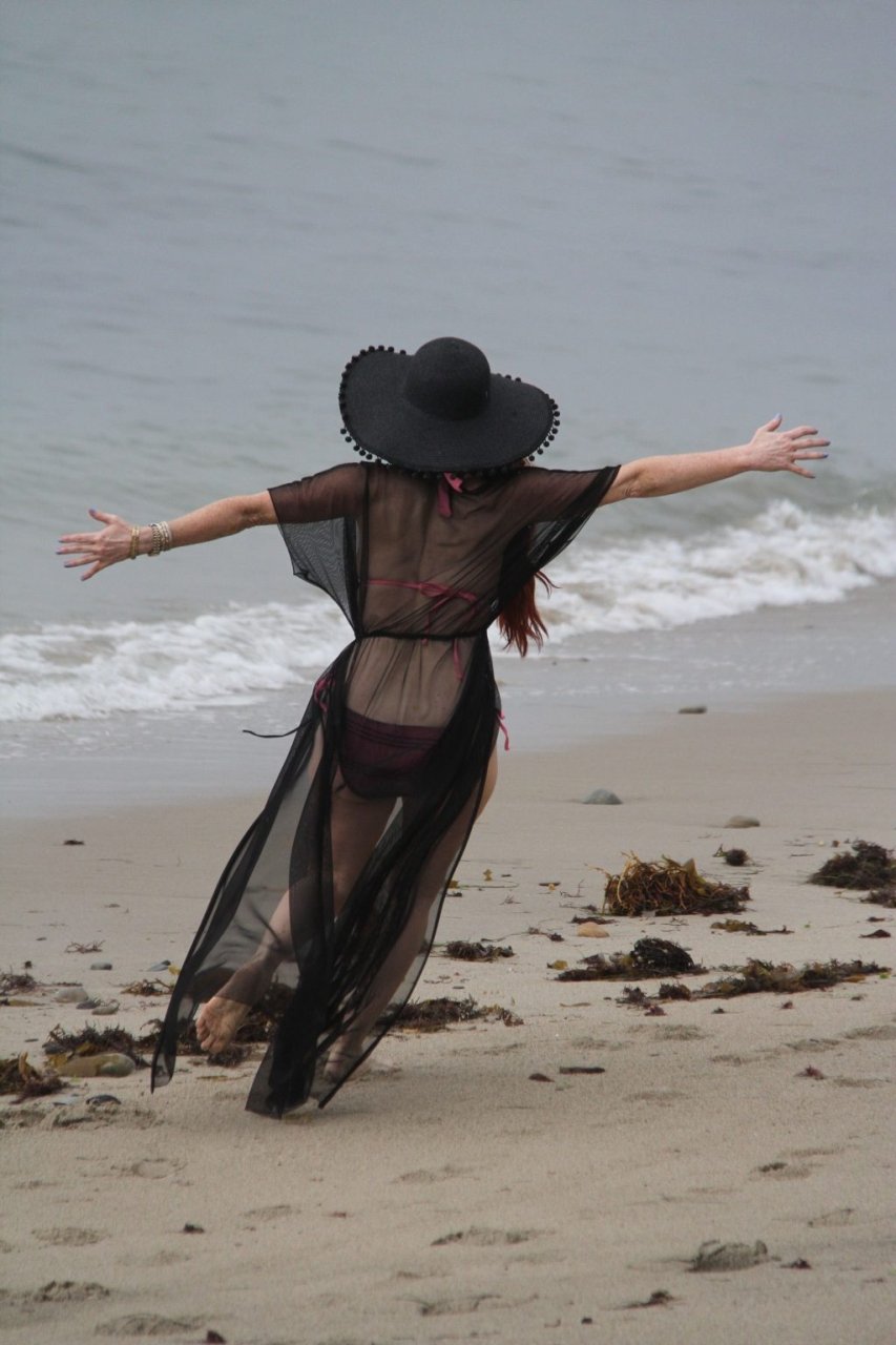 Phoebe Price (45 ans) profite d’un après-midi à traîner avec son amie actrice Marcela Iglesias sur la plage de Malibu, portant un bikini noir et violet avec un manteau transparent, 18/07/2018. Les deux posent et s’assoient sur une balançoire en attendant que le soleil se montre.