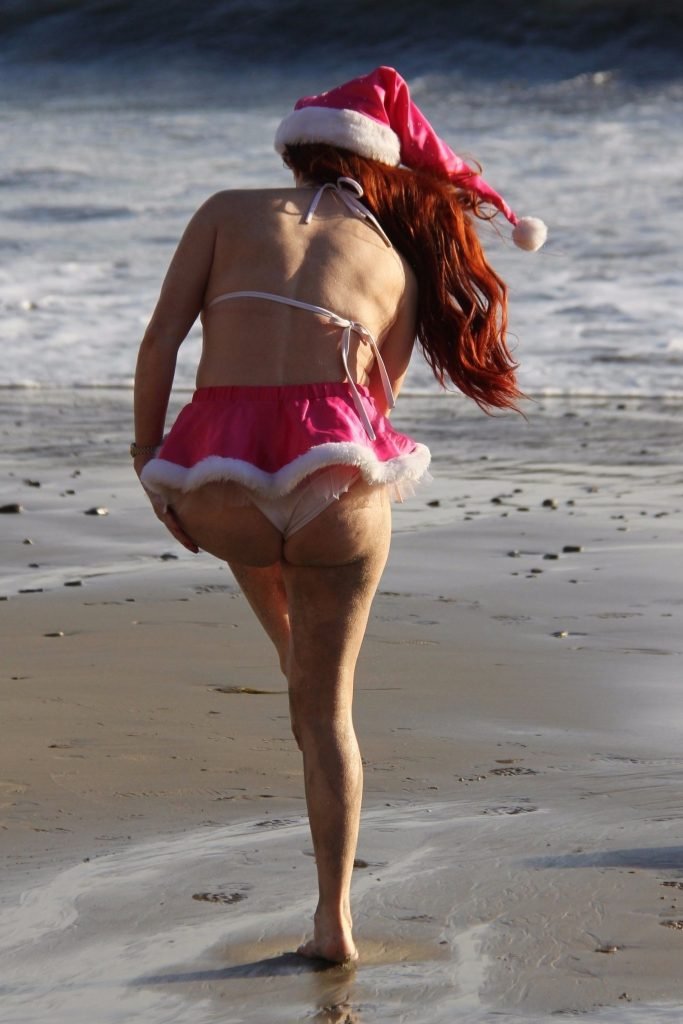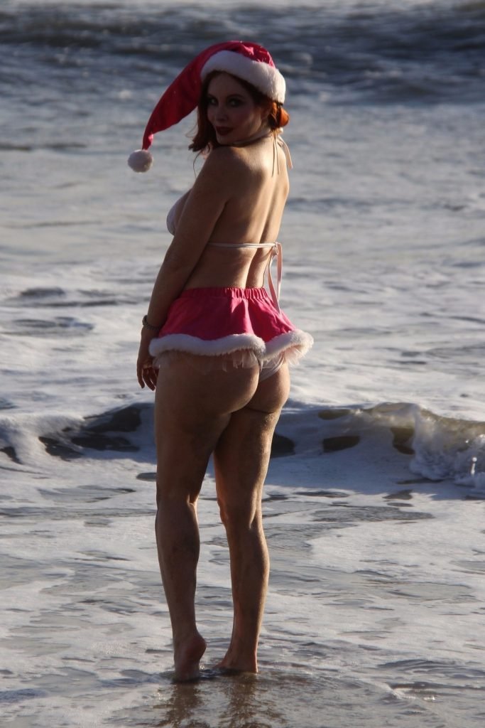 Sandy Clause ! Phoebe Price se rend à la plage de Malibu avec un chapeau de Père Noël, 12/04/2017. Phoebe Price est une actrice américaine (Le Secret de Botticelli, 2017). Âge – 45.