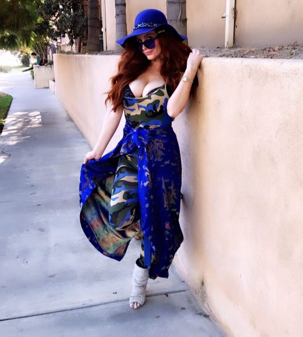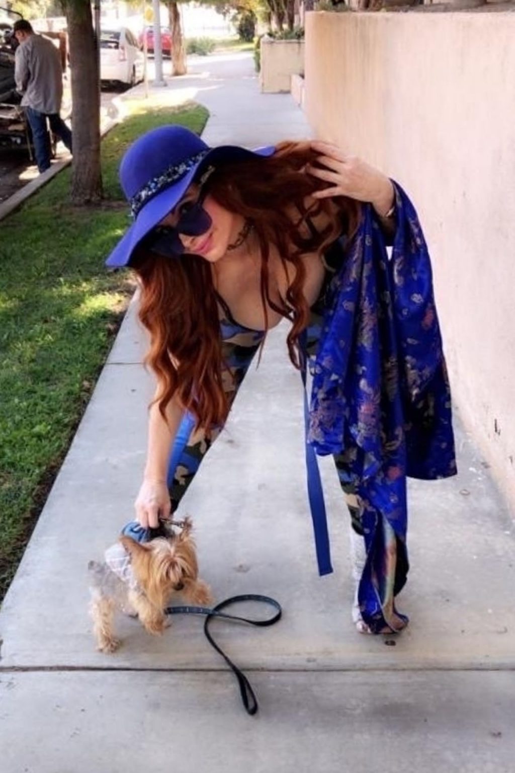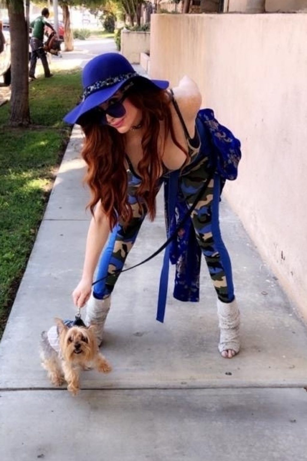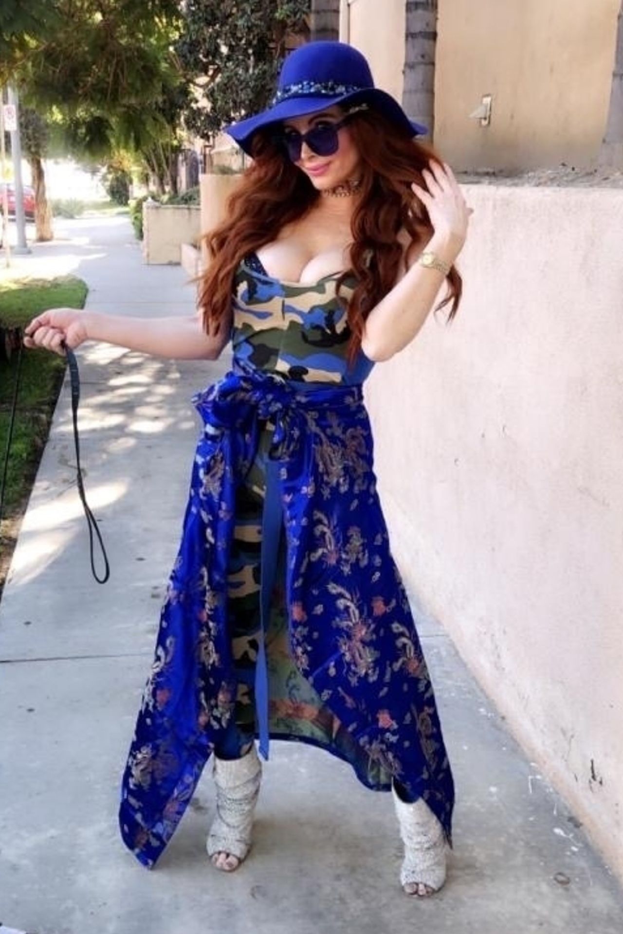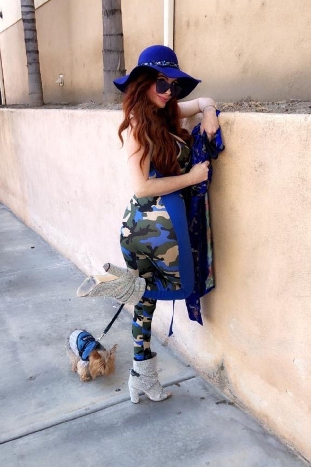 L’actrice Phoebe Price porte un ensemble camouflage bleu en promenant son chien à Beverly Hills, le 18/11/2019.