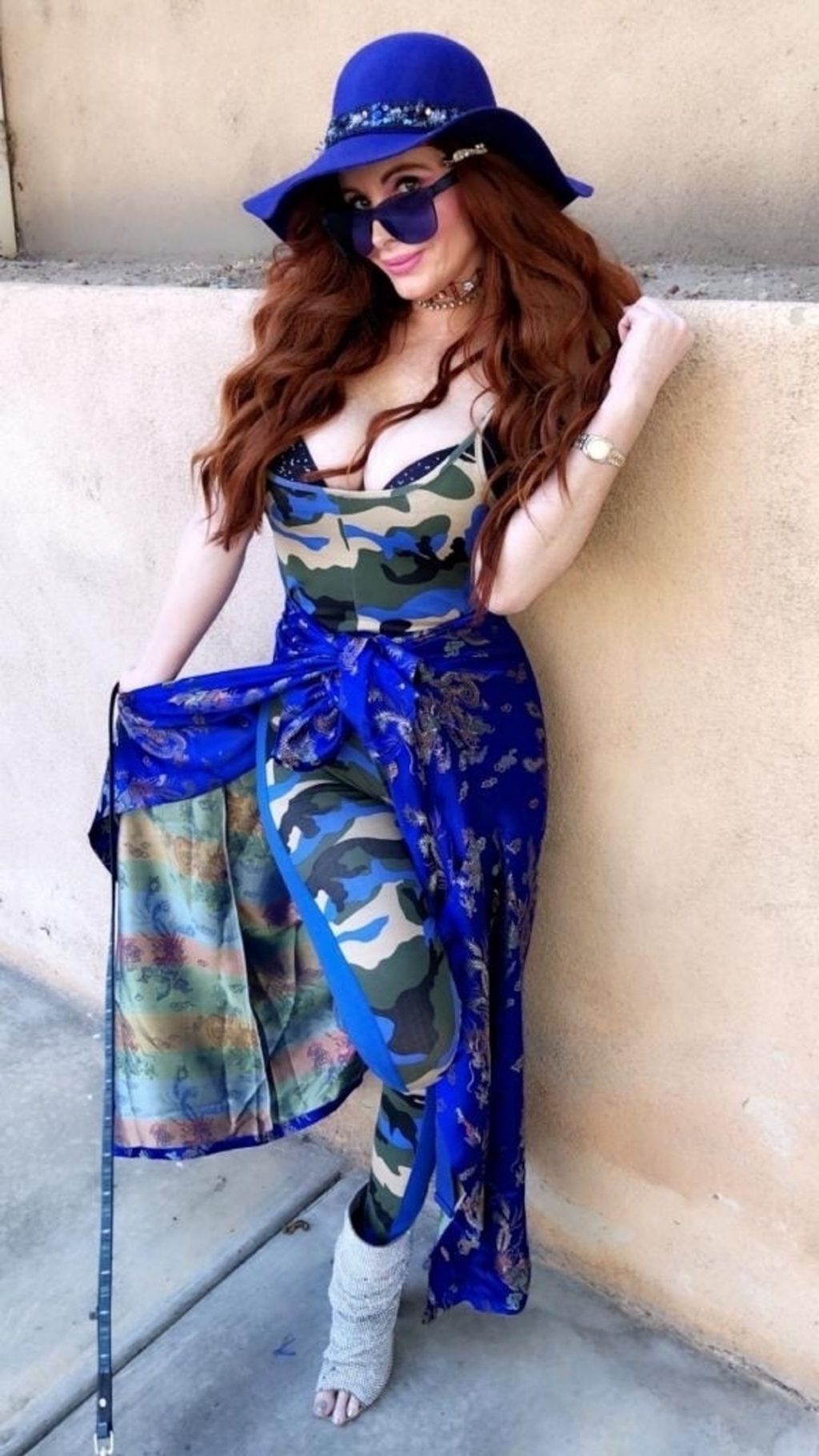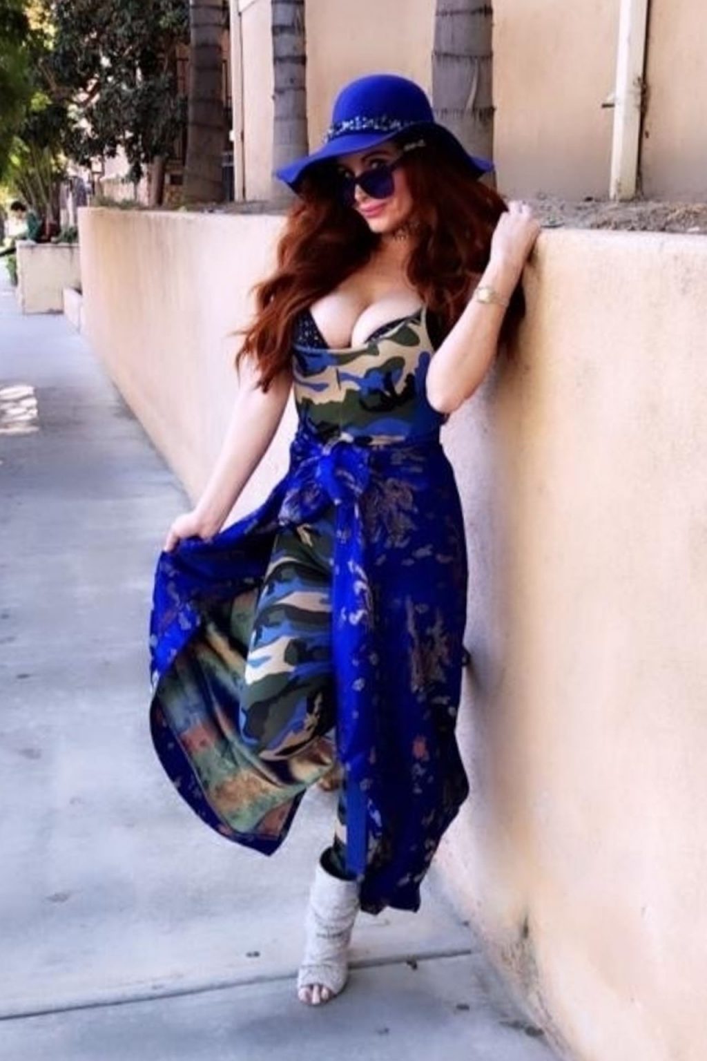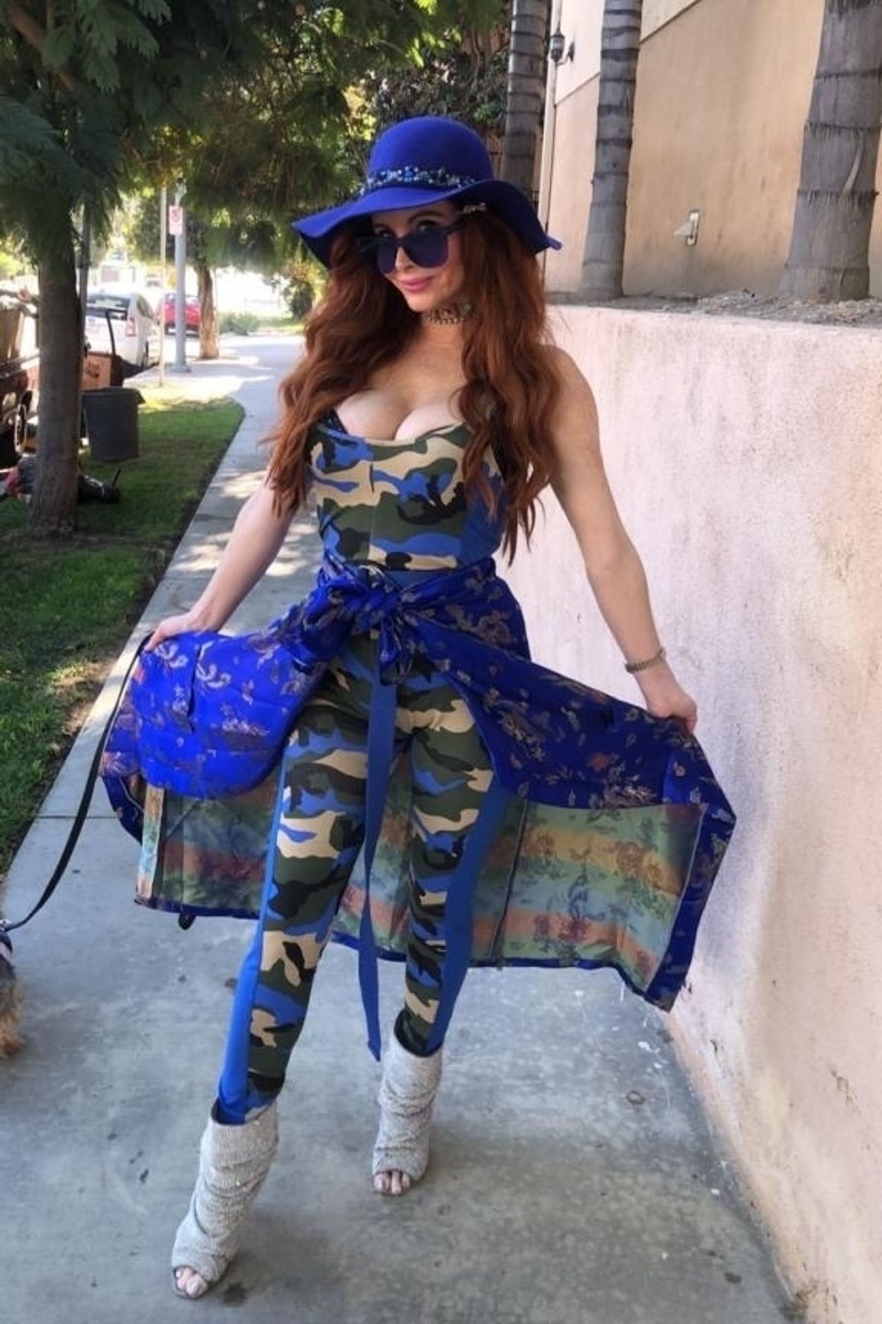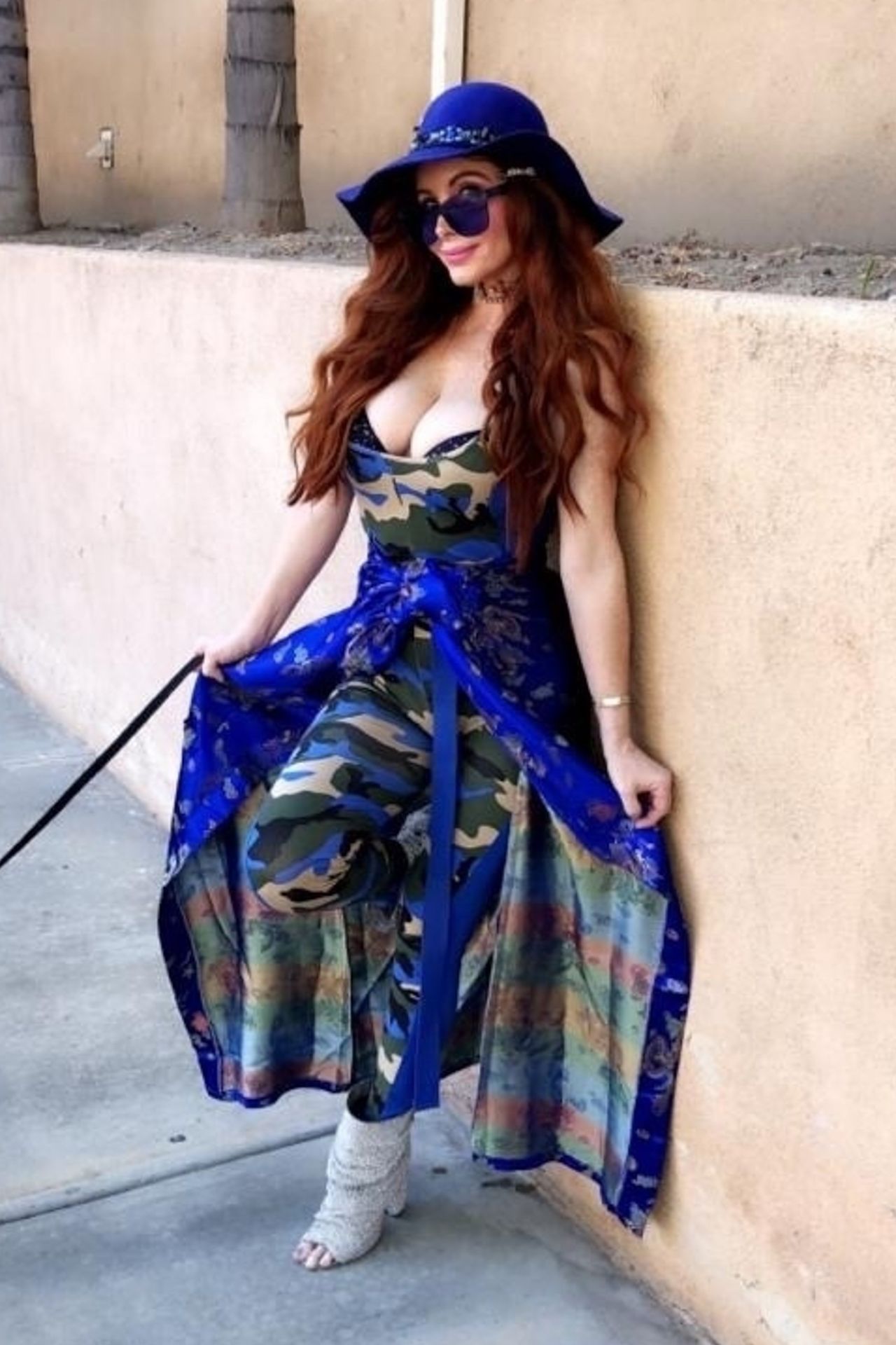 L’actrice Phoebe Price porte un ensemble camouflage bleu en promenant son chien à Beverly Hills, le 18/11/2019.