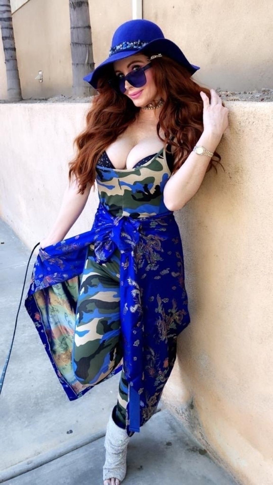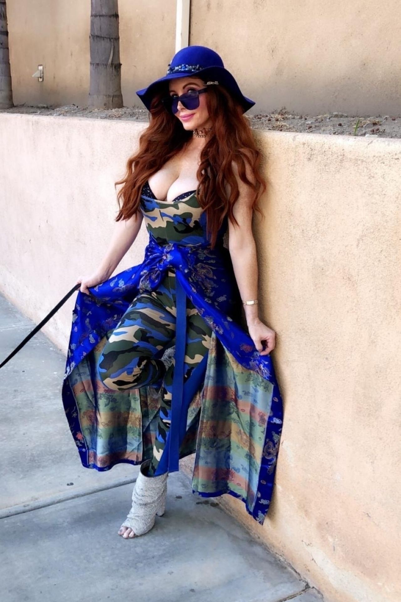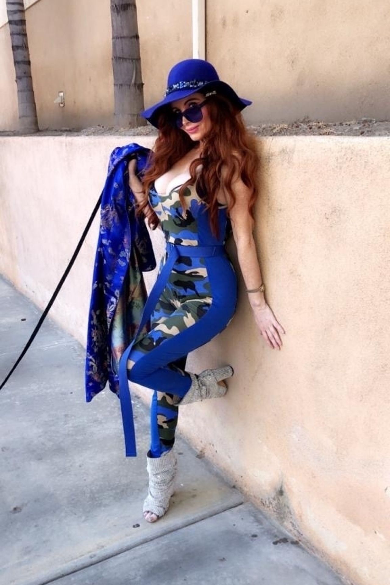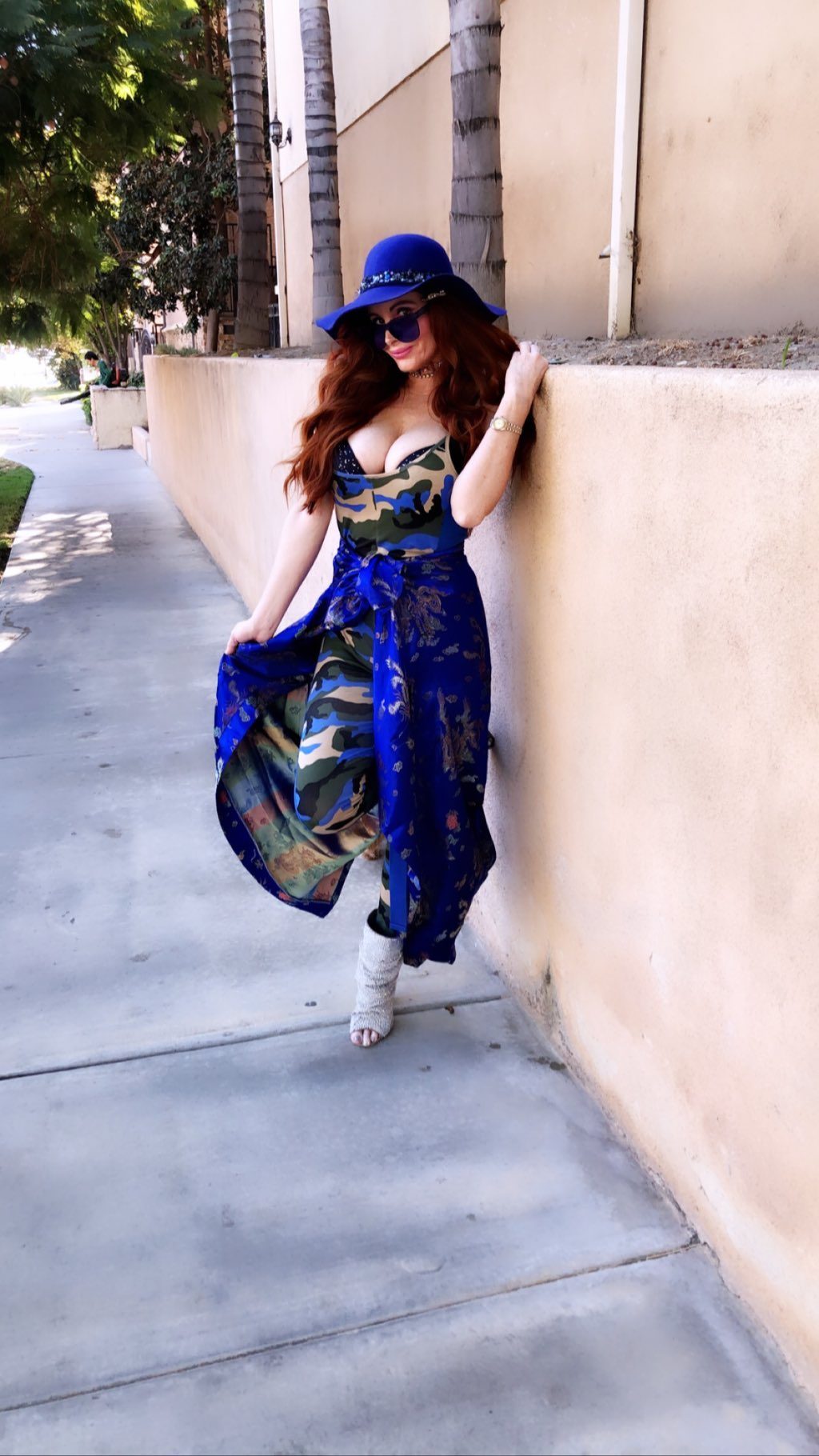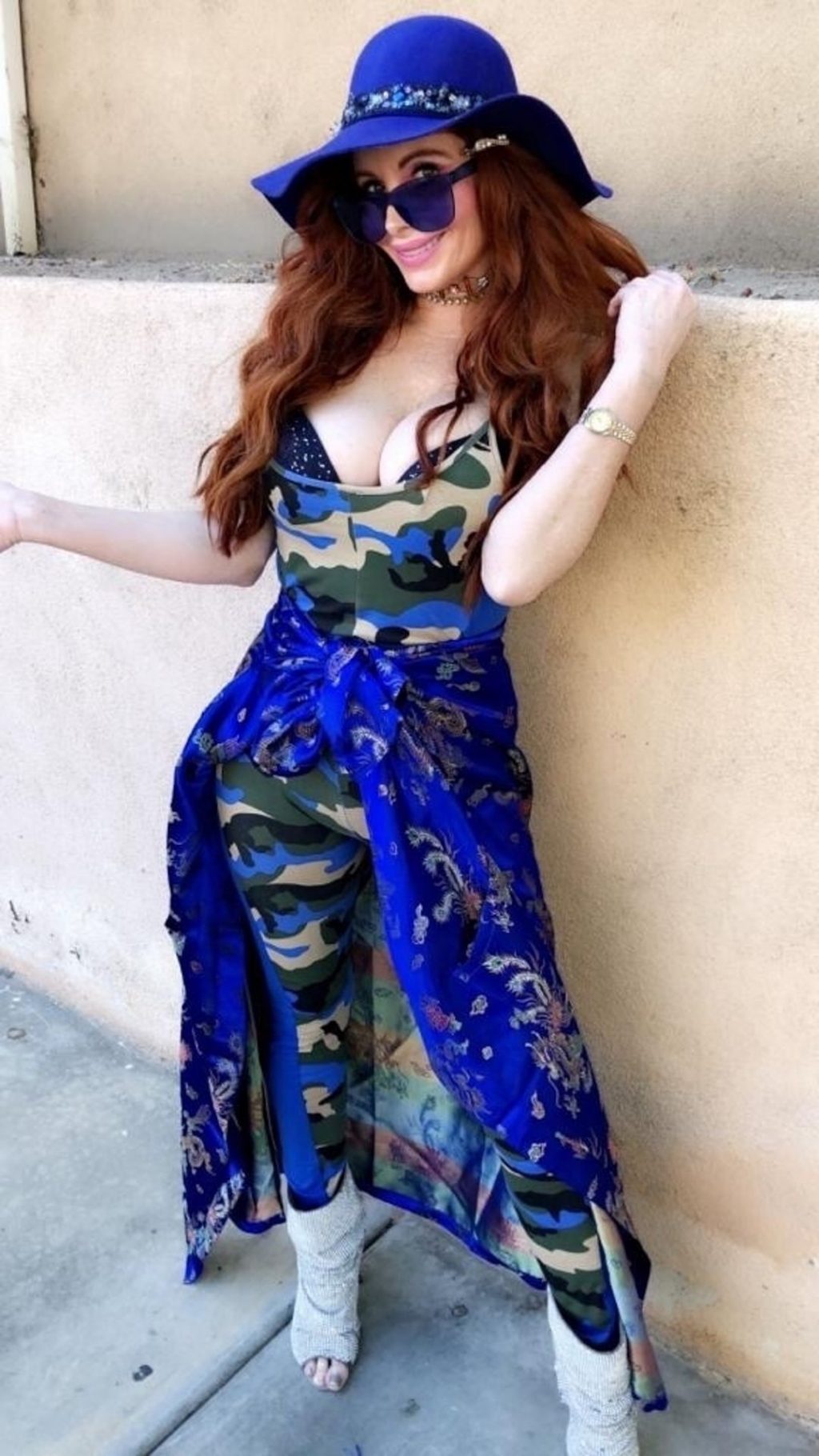 L’actrice Phoebe Price porte un ensemble camouflage bleu en promenant son chien à Beverly Hills, le 18/11/2019.