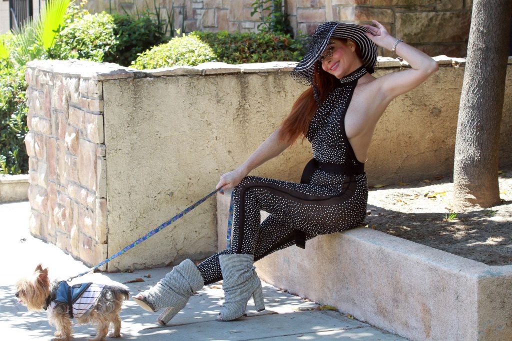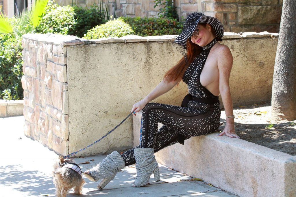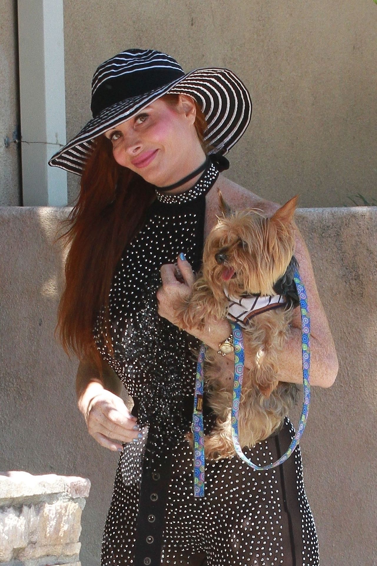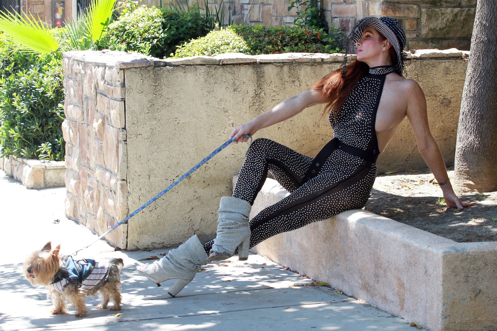 L’actrice Phoebe Price porte une tenue scintillante lors d’une sortie avec son chien samedi (août 2020).