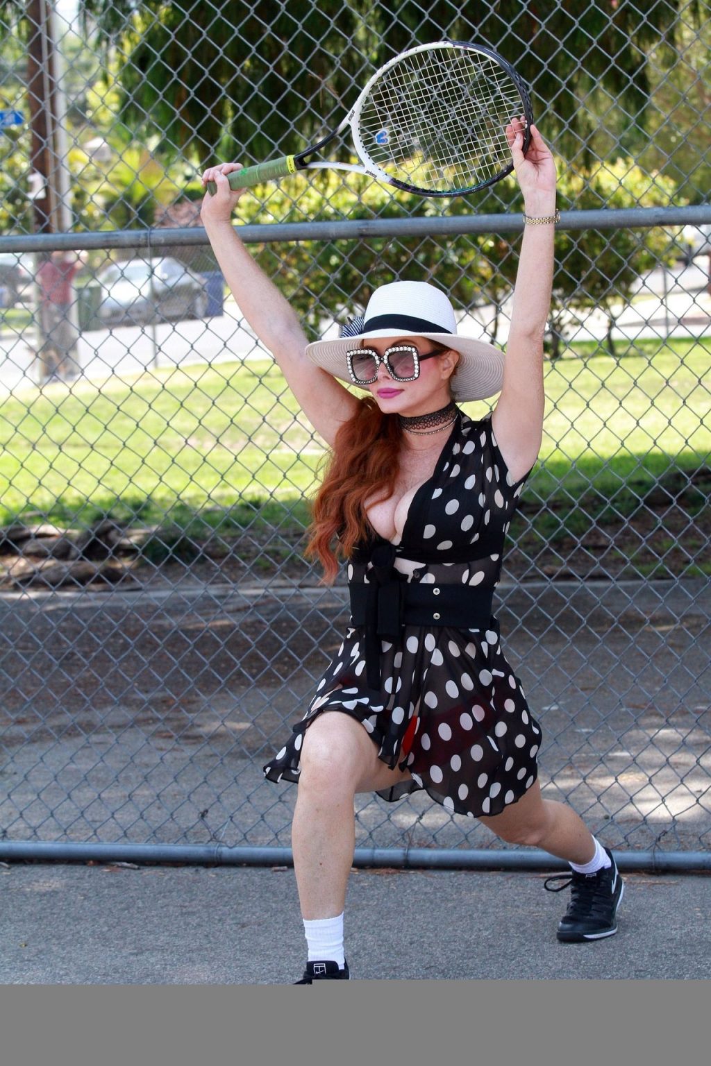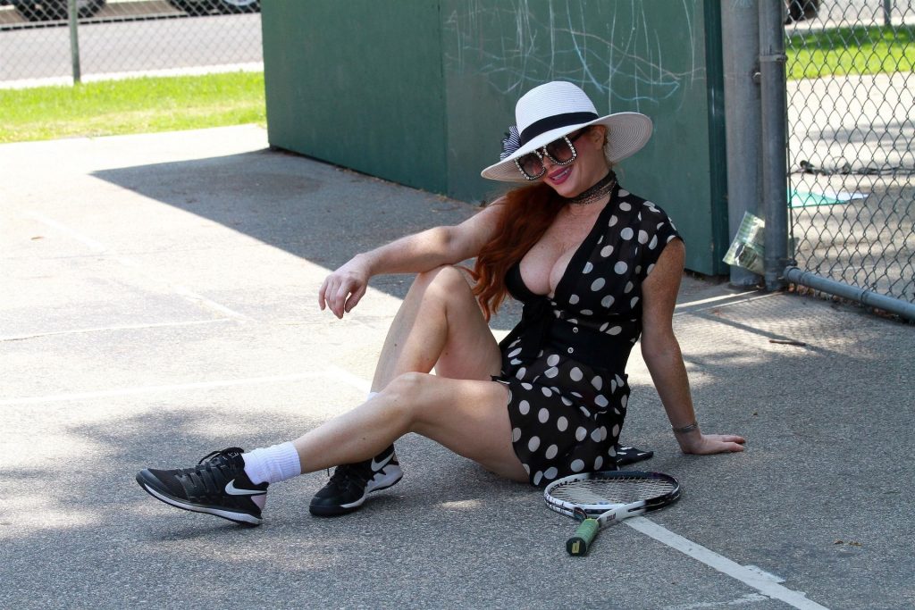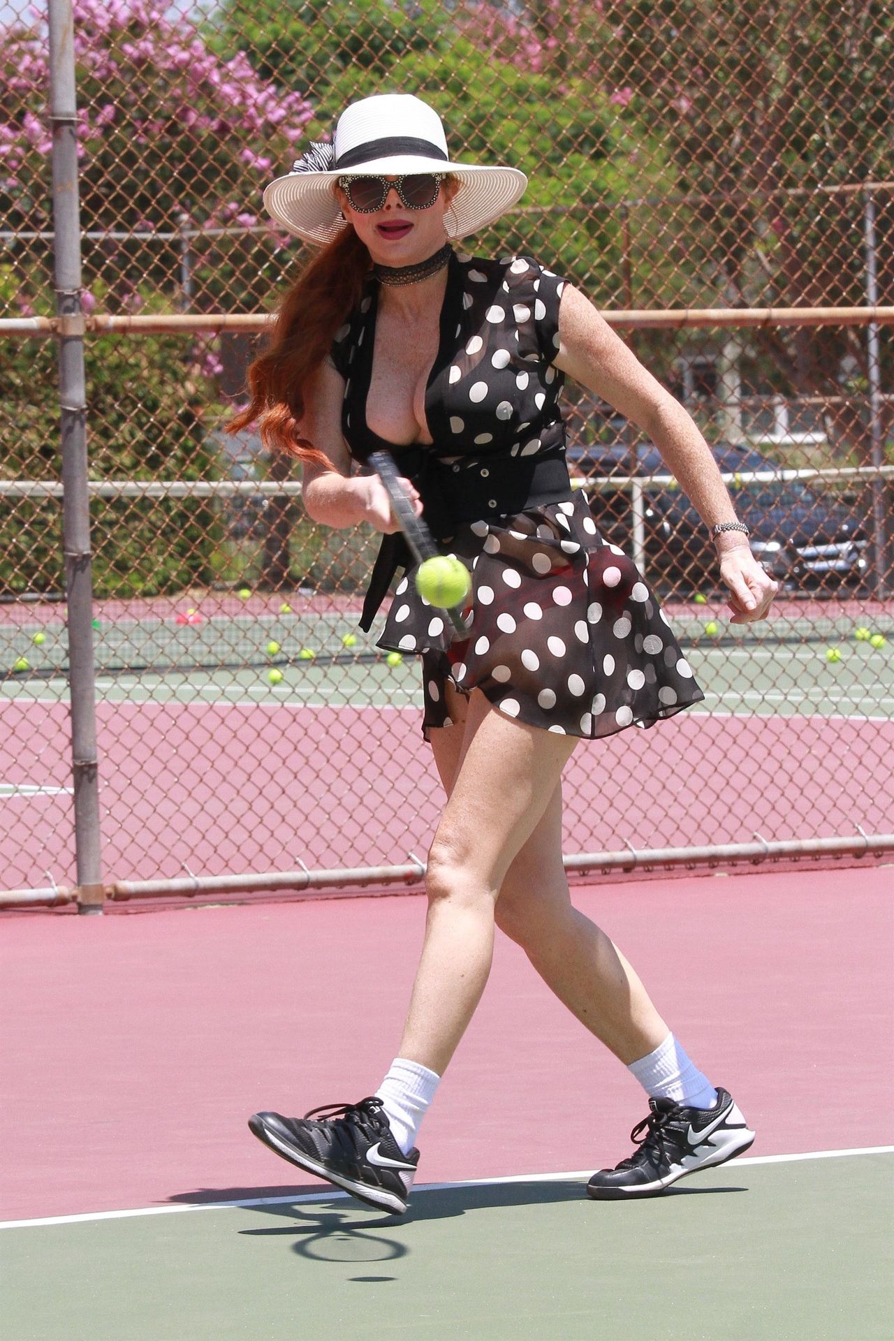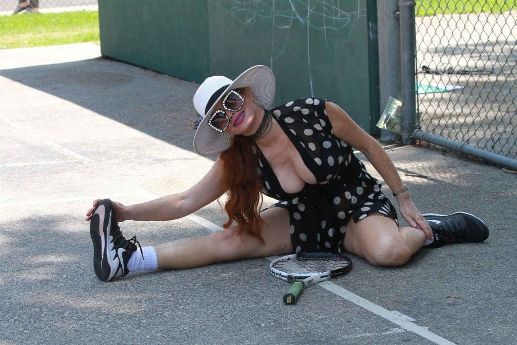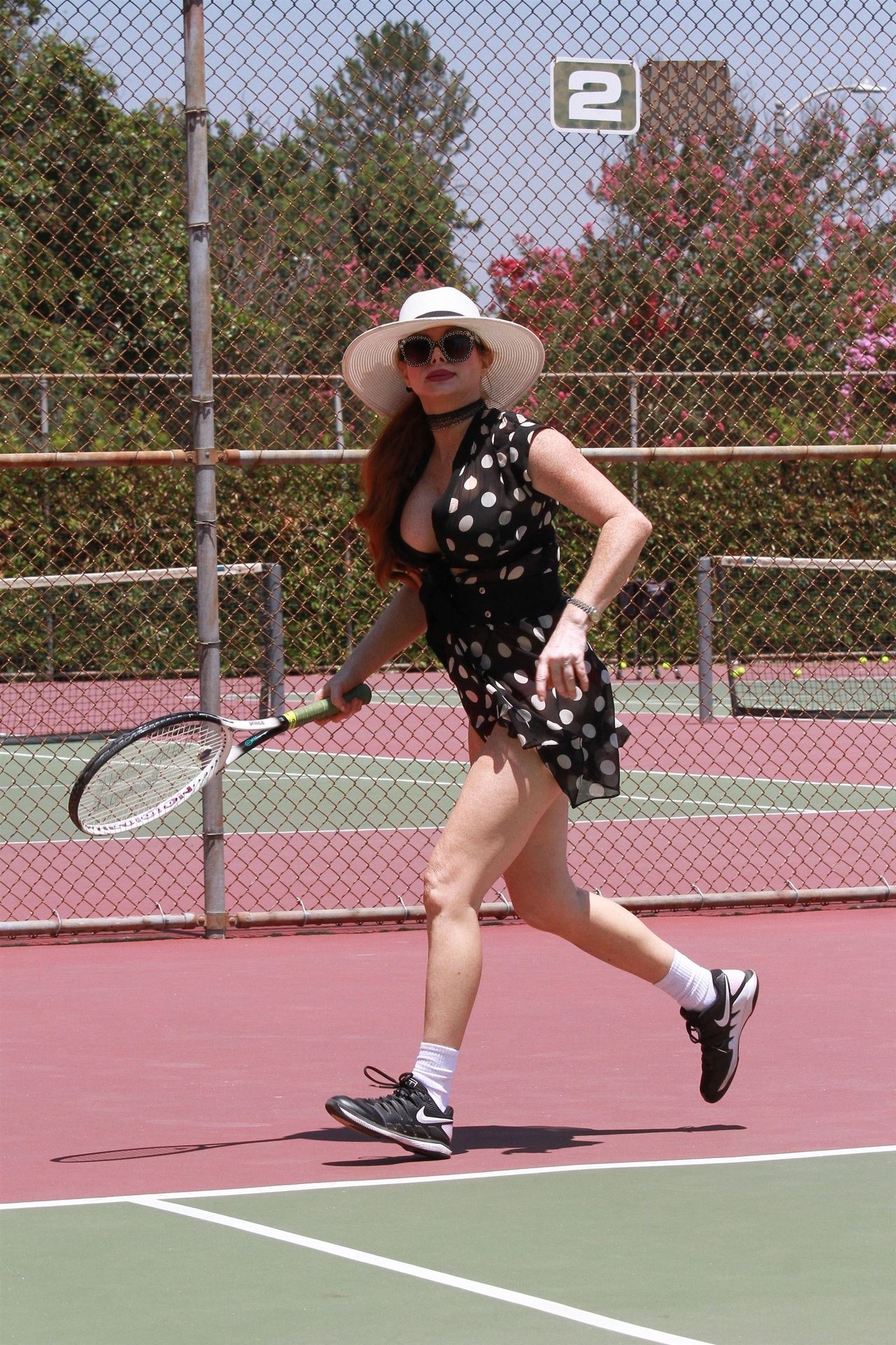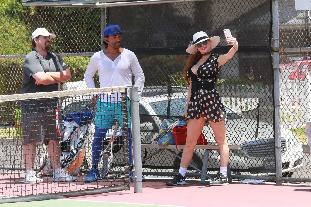 L’actrice exhibe une nouvelle tenue pour les courts et un décolleté prononcé. Elle s’amuse à frapper des balles et fait son entraînement.