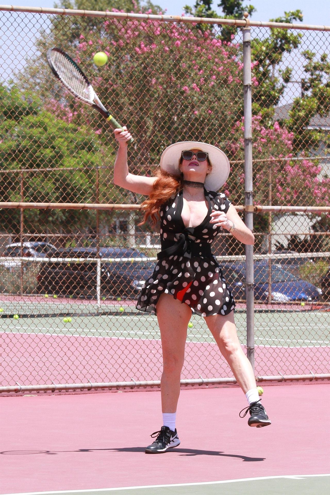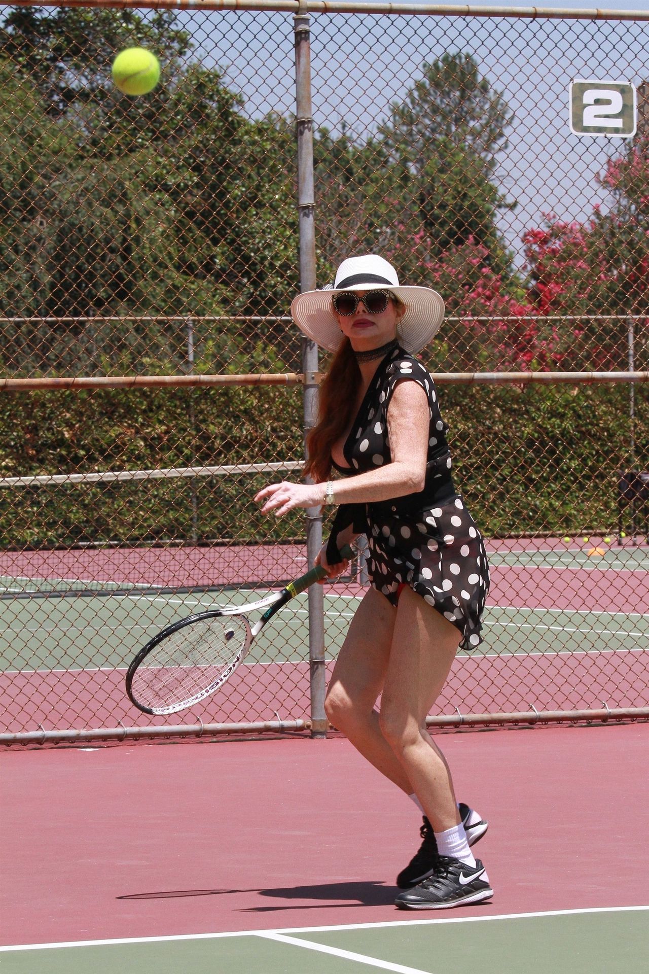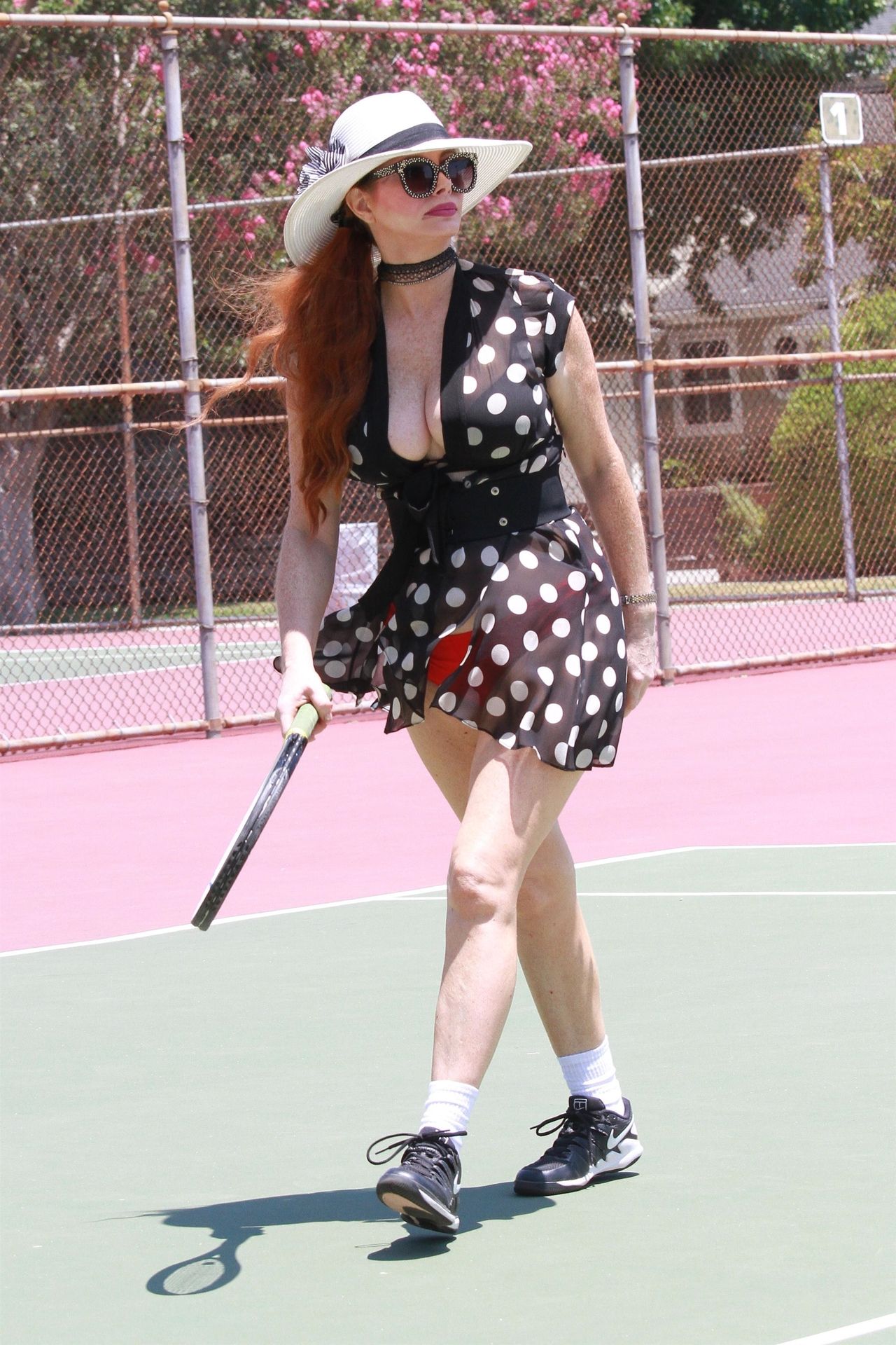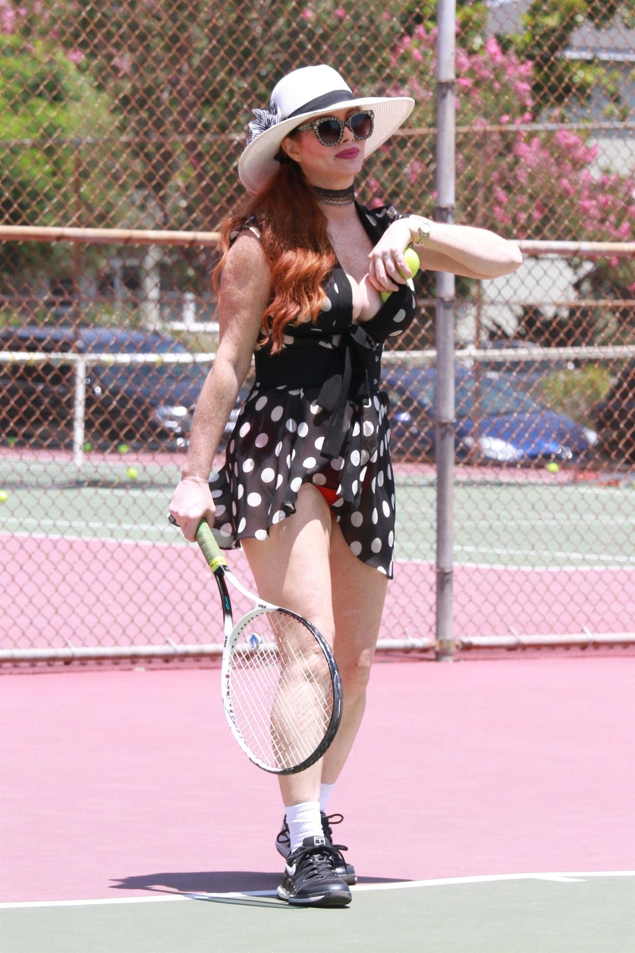 L’actrice exhibe une nouvelle tenue pour les courts et un décolleté prononcé. Elle s’amuse à frapper des balles et fait son entraînement.