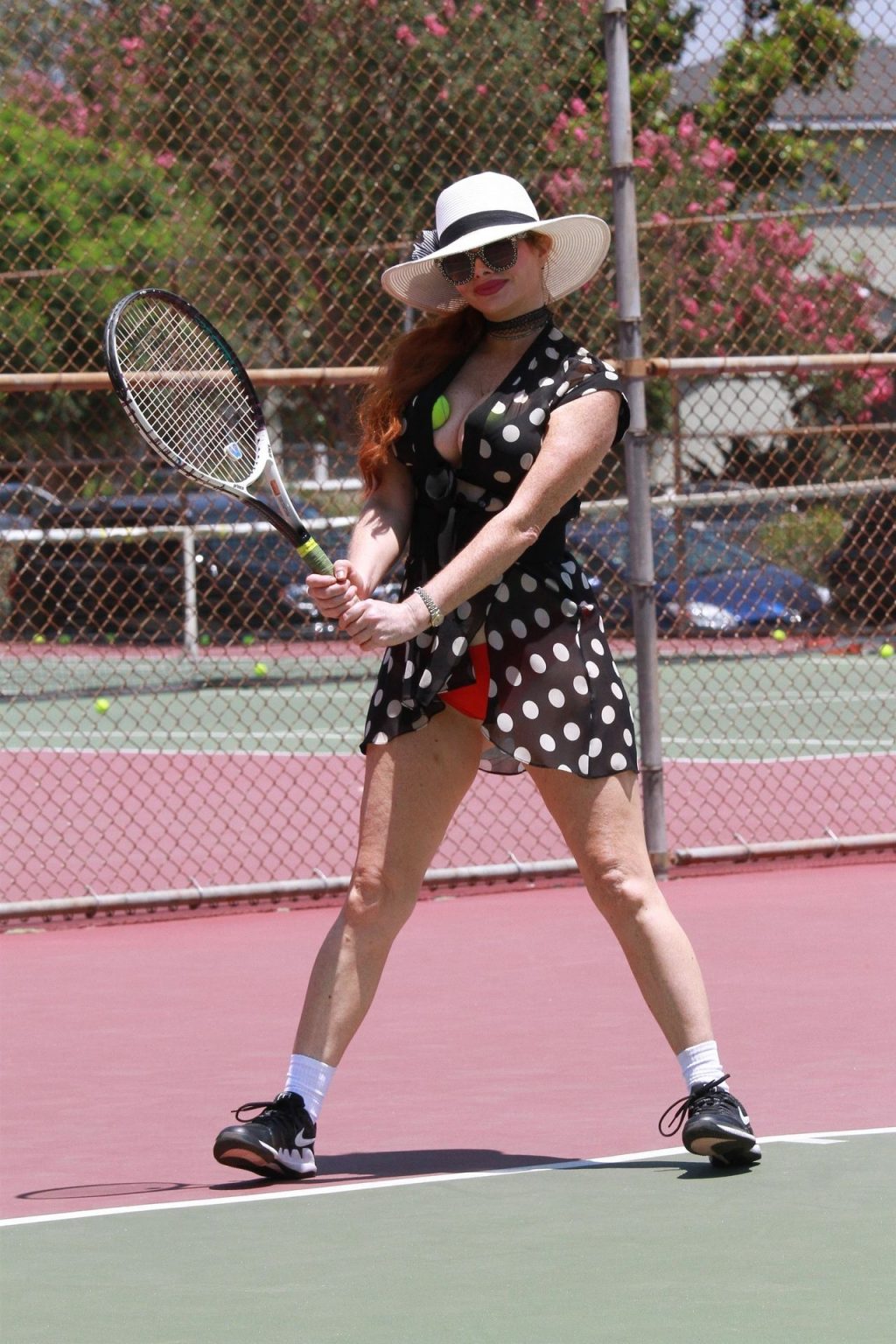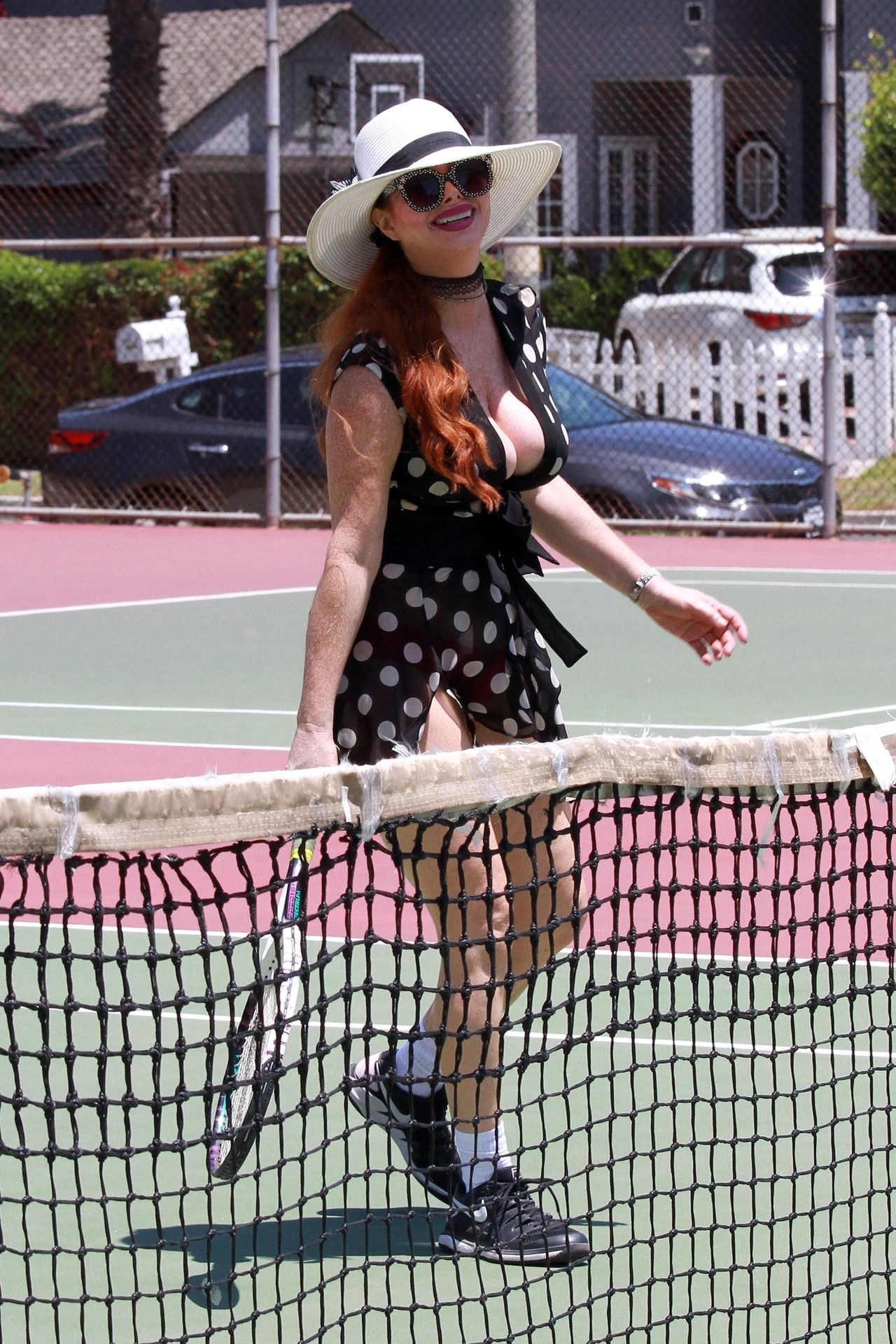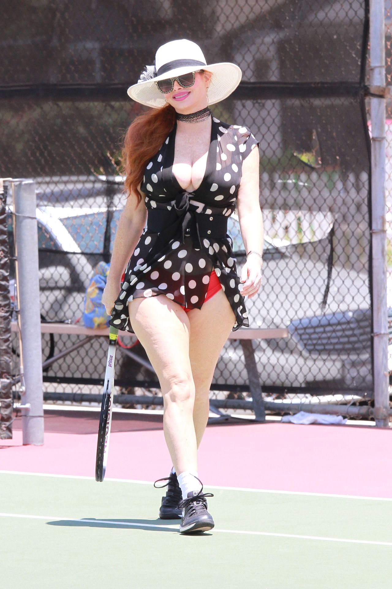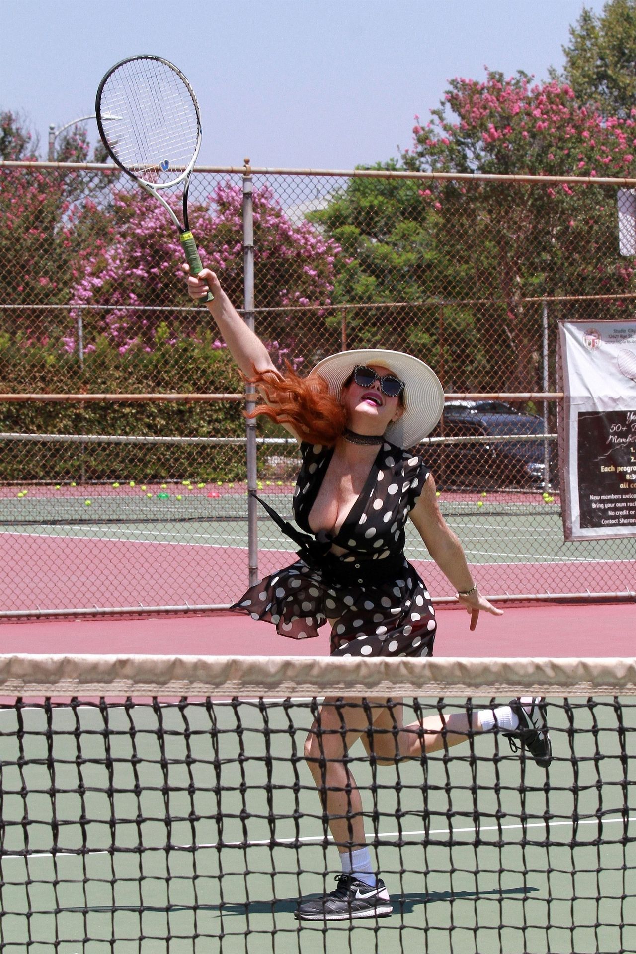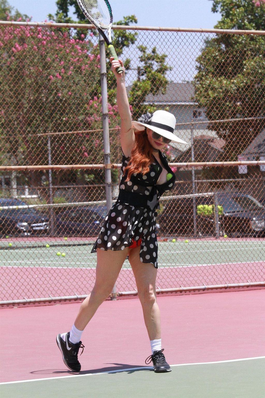 L’actrice exhibe une nouvelle tenue pour les courts et un décolleté prononcé. Elle s’amuse à frapper des balles et fait son entraînement.