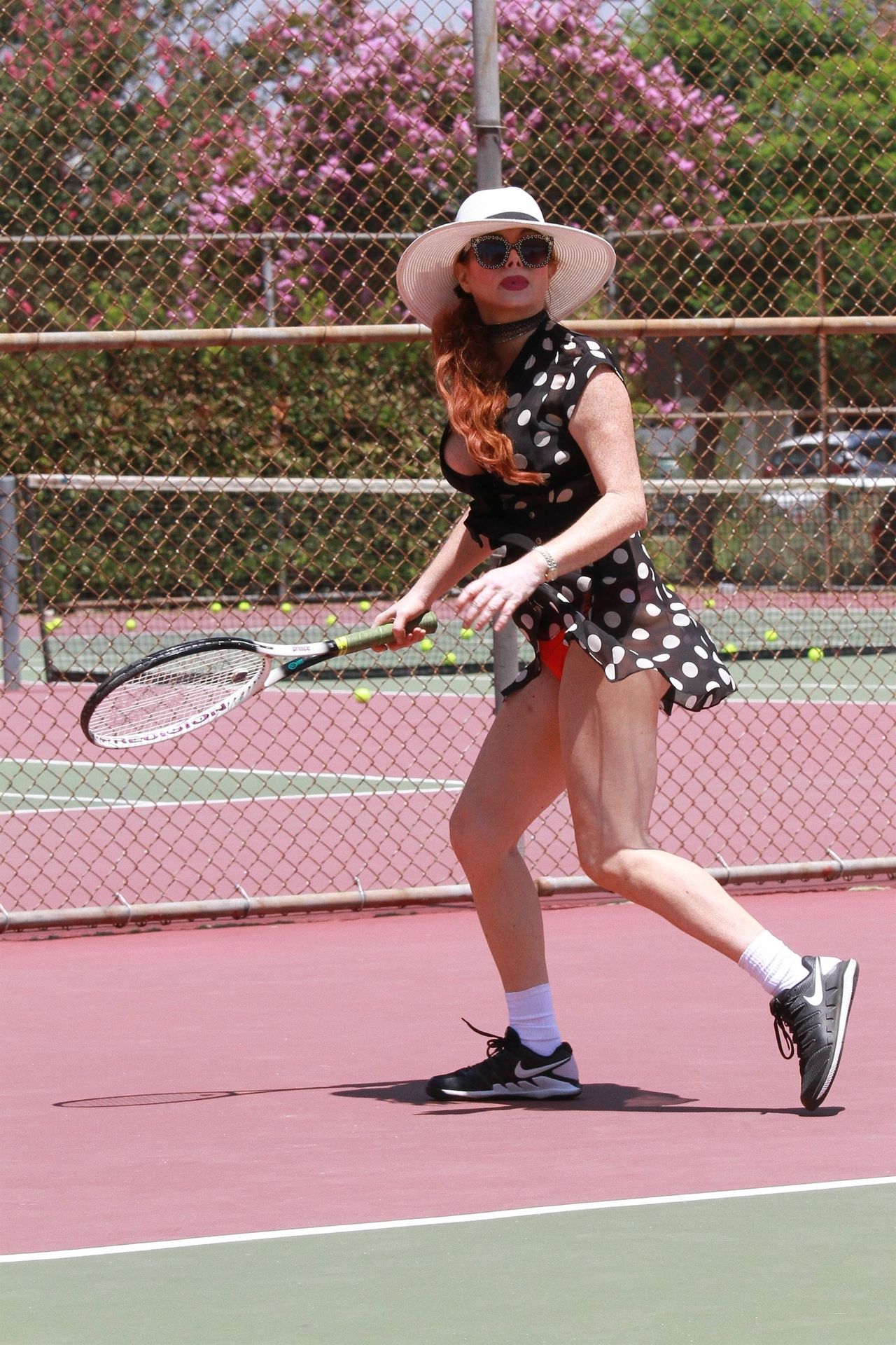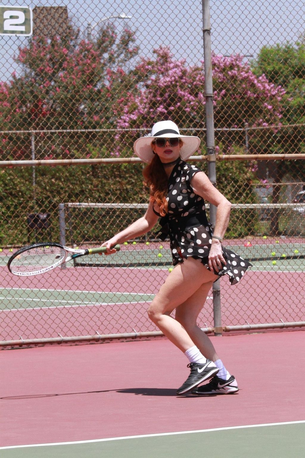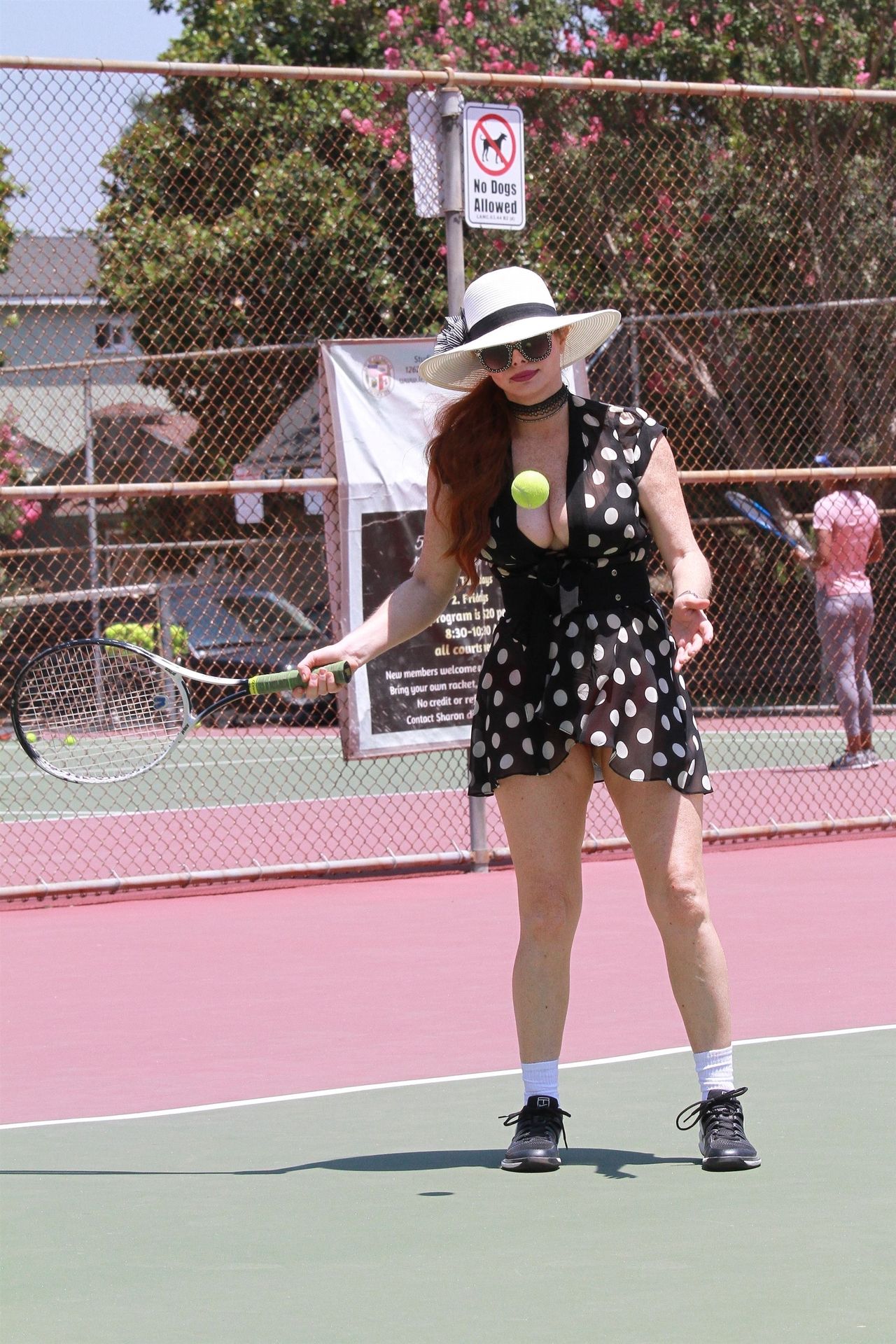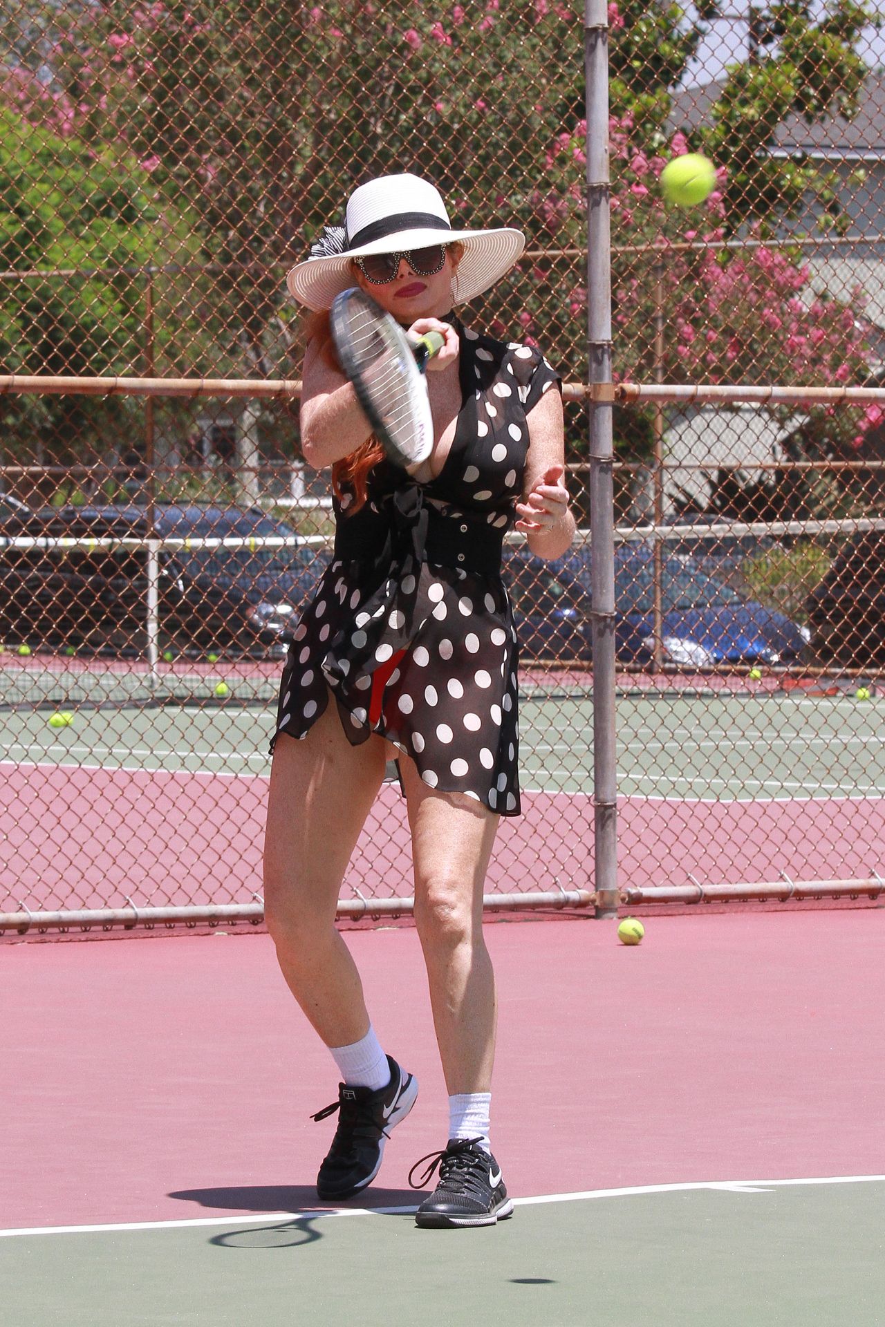L’actrice exhibe une nouvelle tenue pour les courts et un décolleté prononcé. Elle s’amuse à frapper des balles et fait son entraînement.