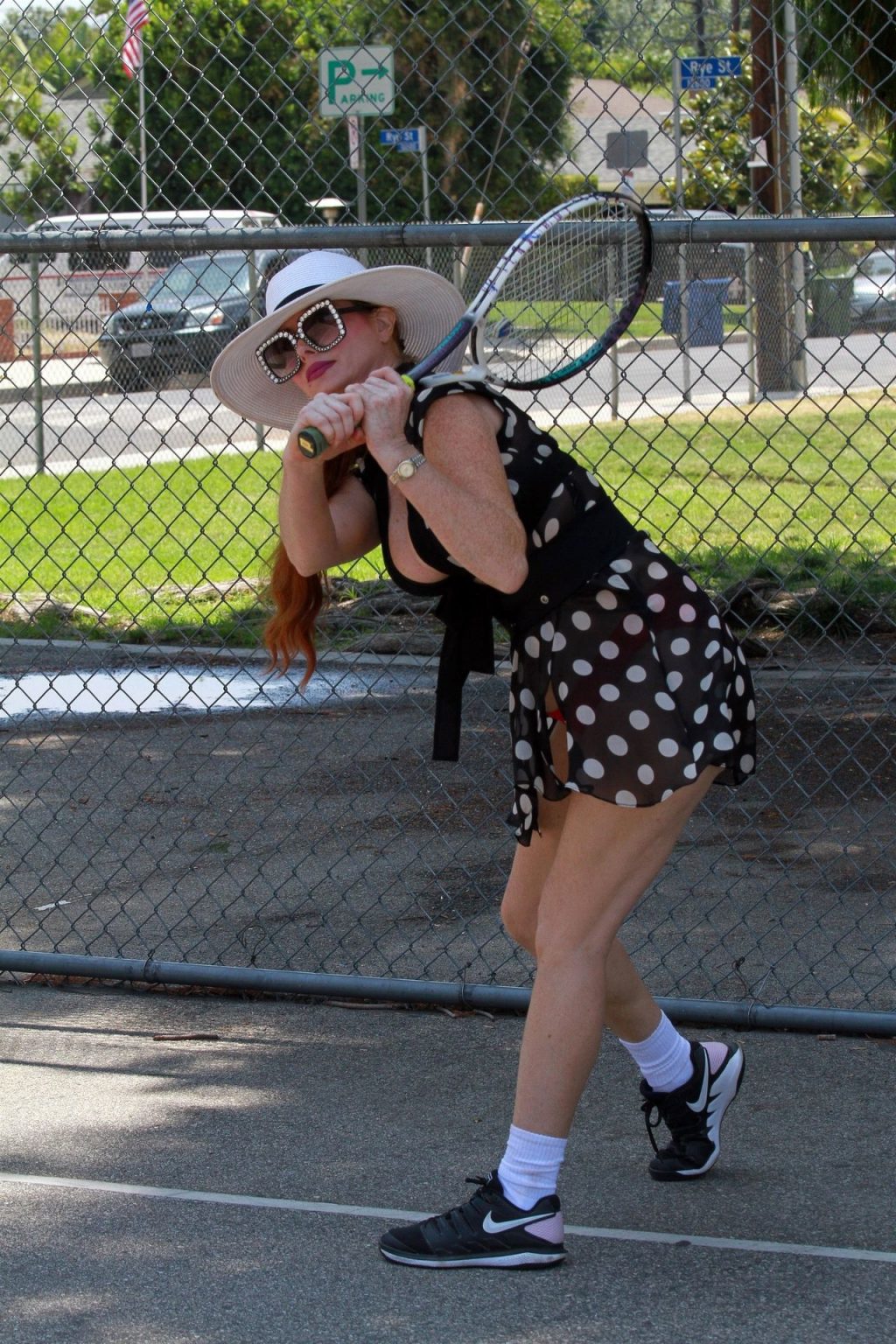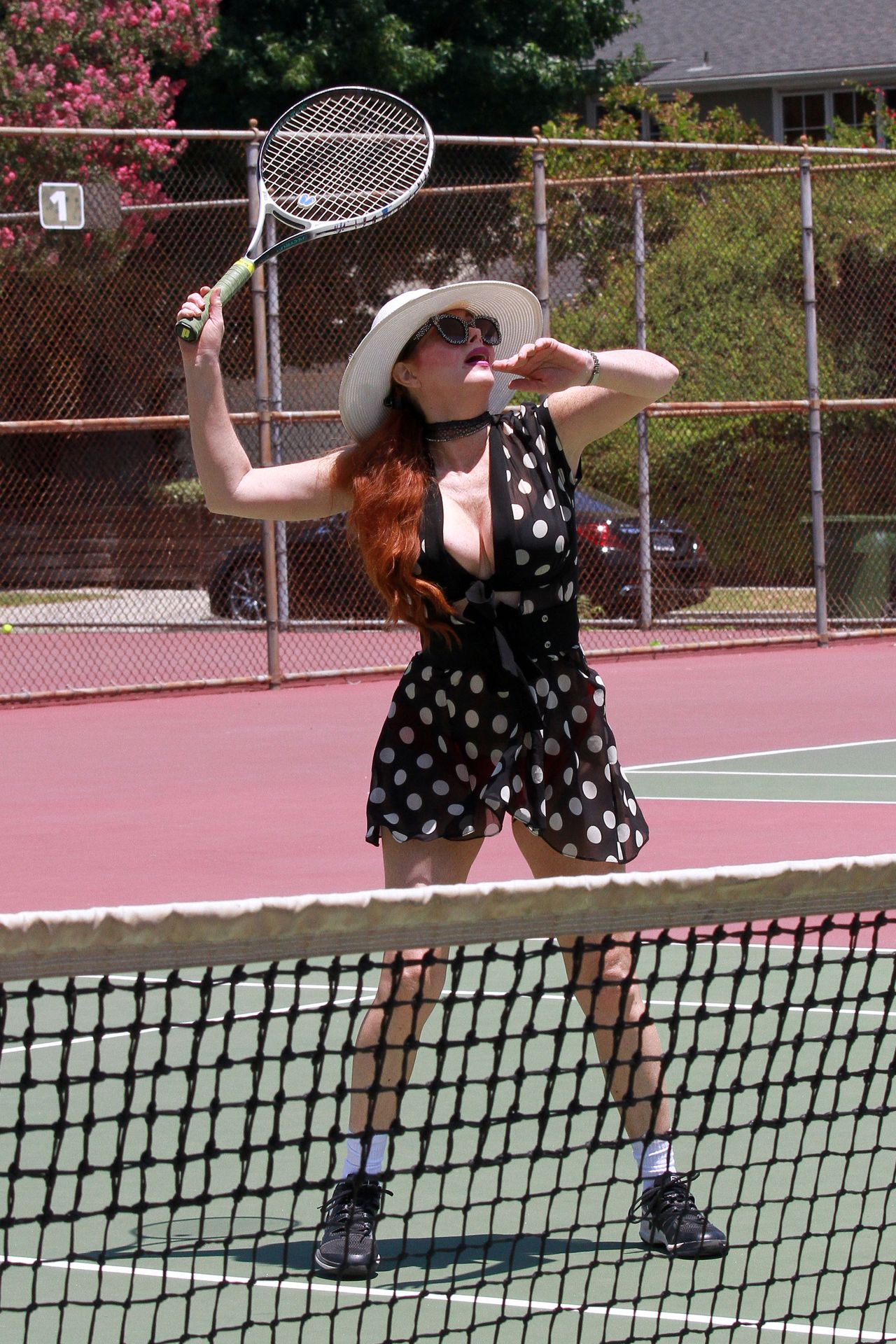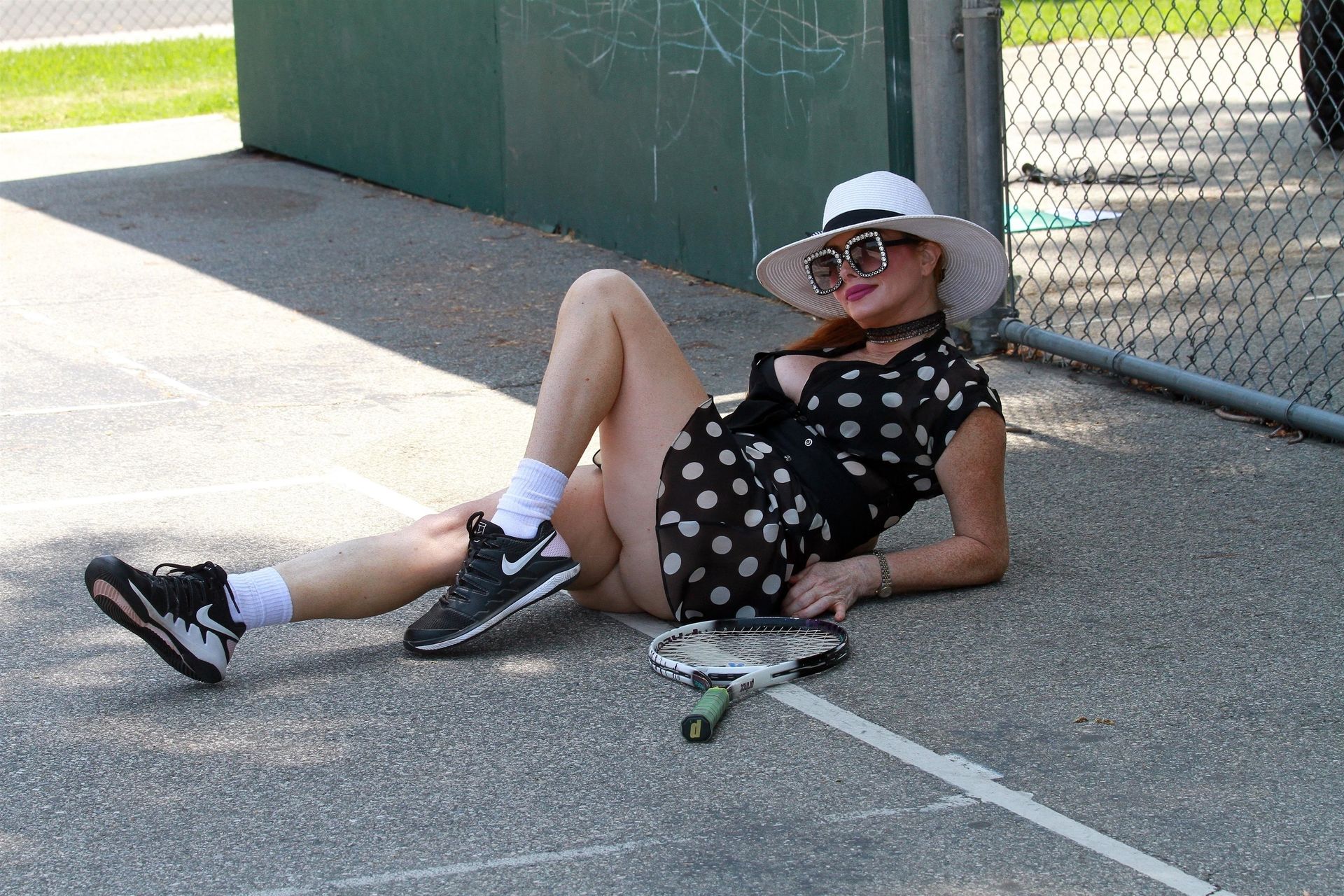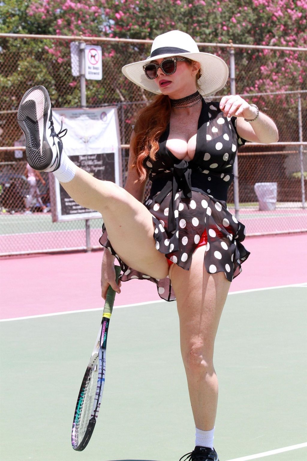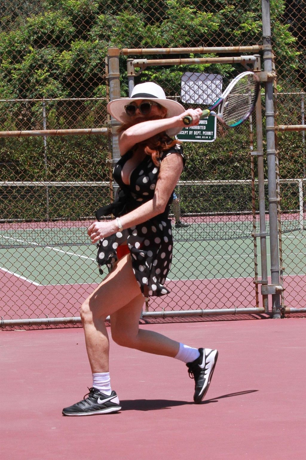 L’actrice exhibe une nouvelle tenue pour les courts et un décolleté prononcé. Elle s’amuse à frapper des balles et fait son entraînement.