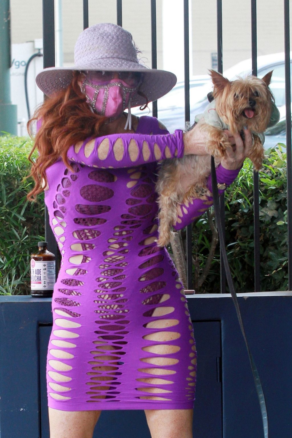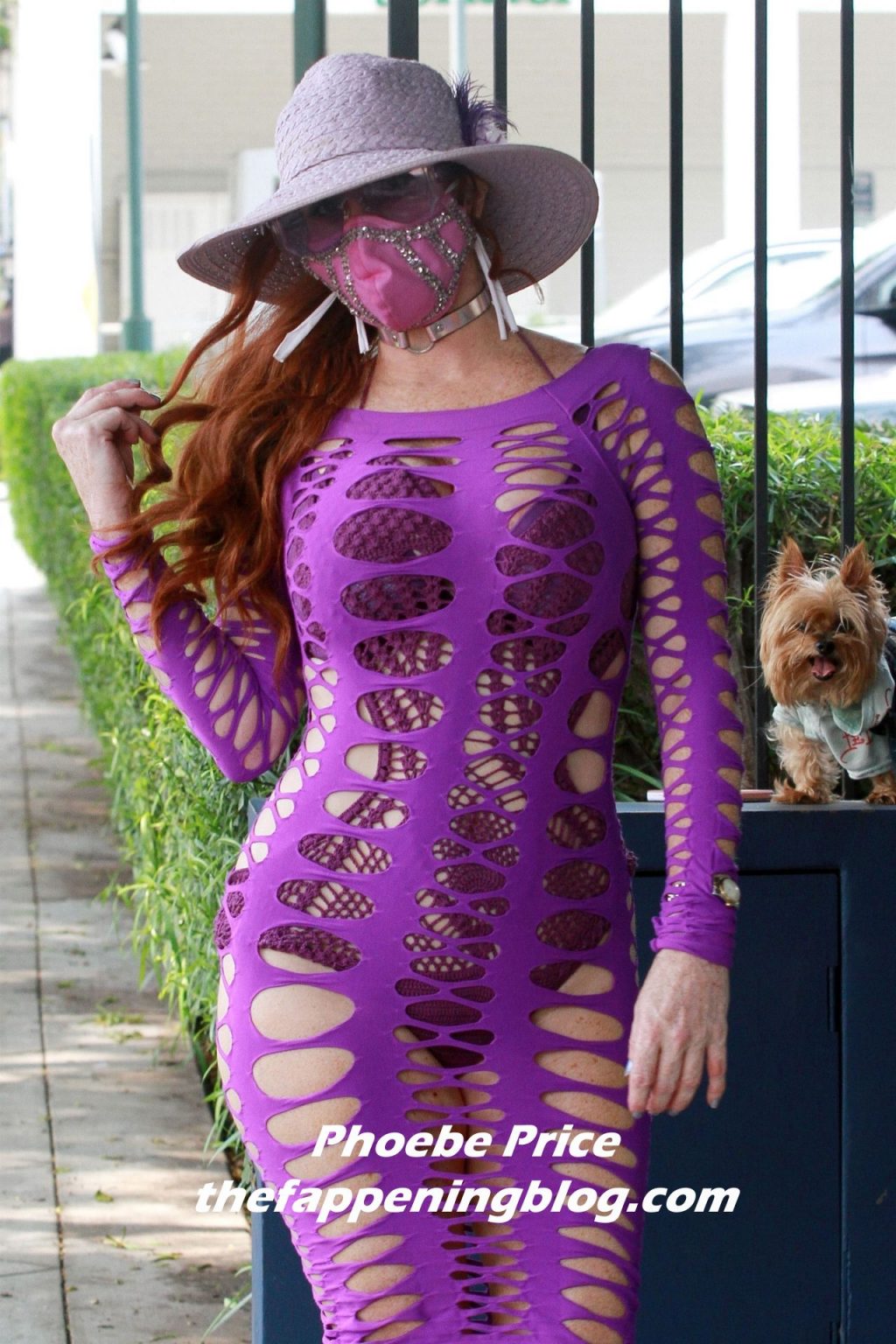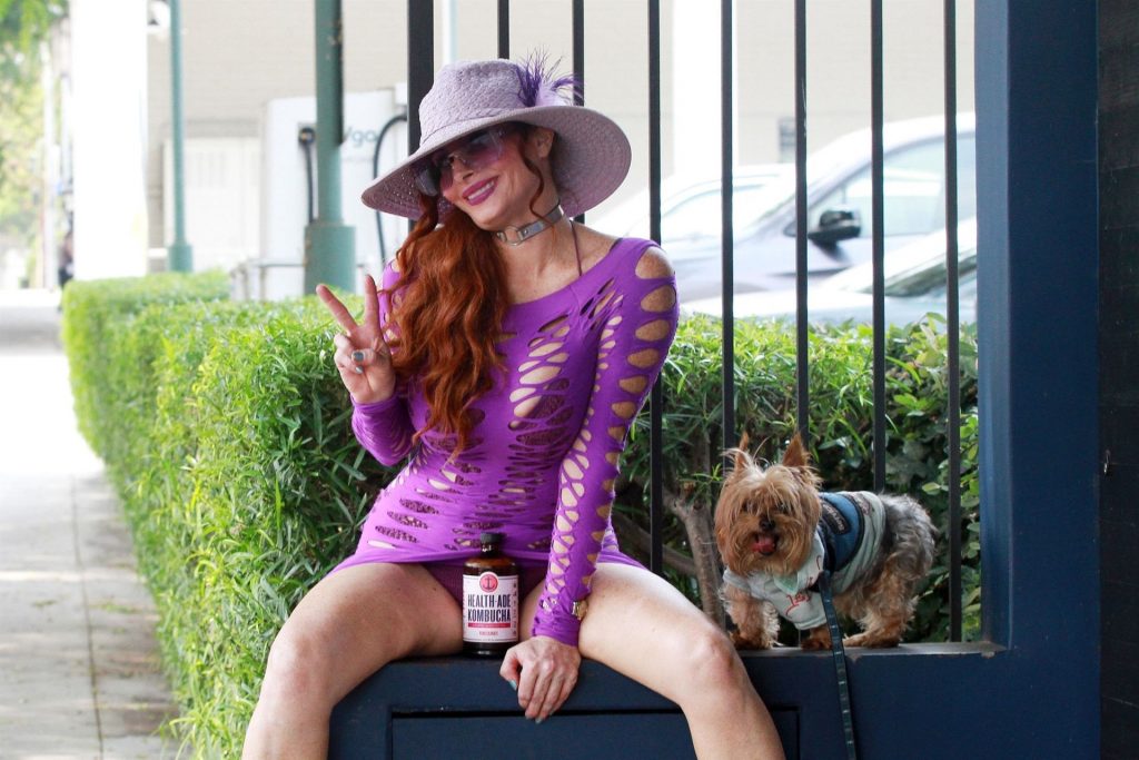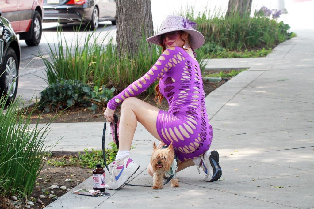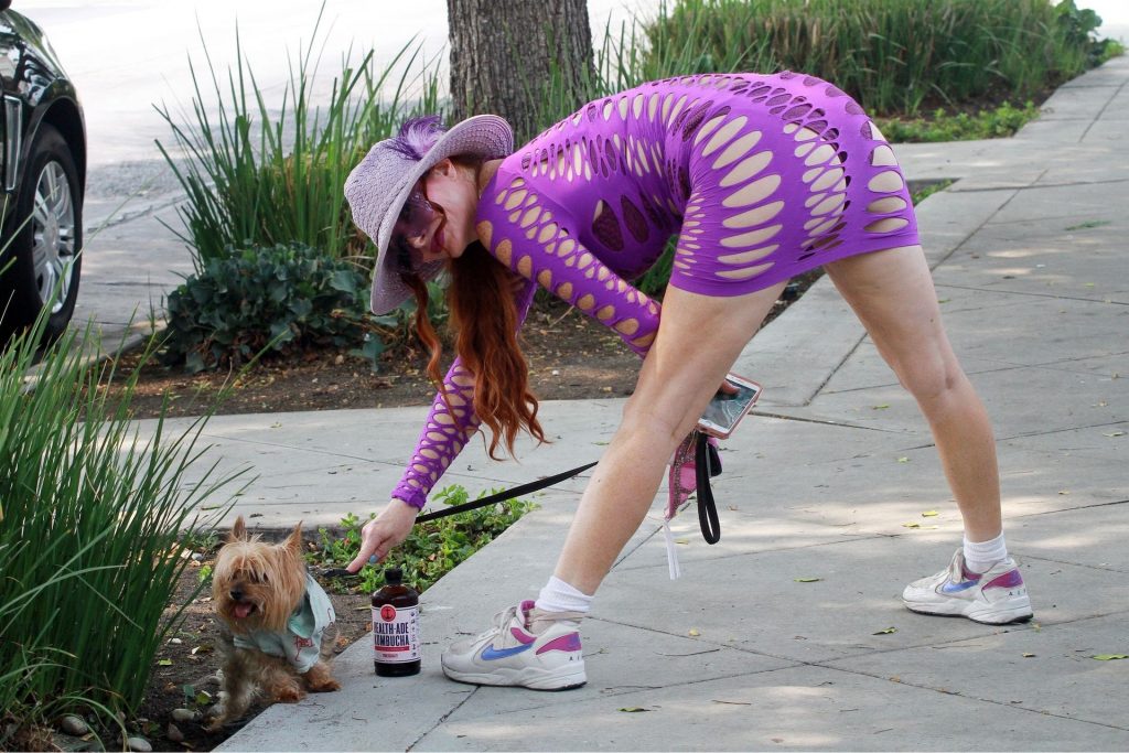 L’actrice Phoebe Price est vue en train de promener son chien et de boire du Kombucha à Los Angeles, le 25/08/2020. Elle porte une tenue violette laissant peu de place à l’imagination.