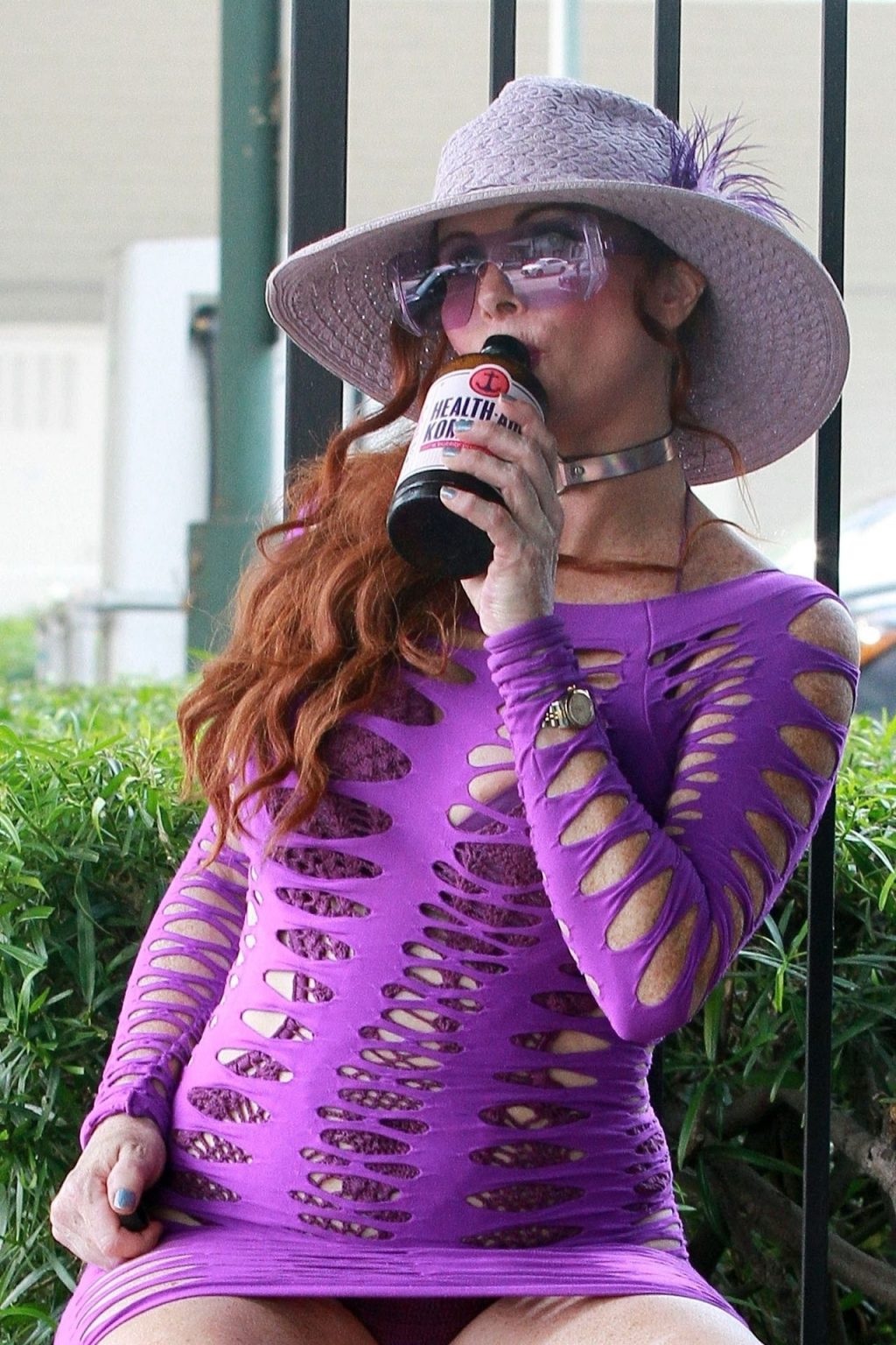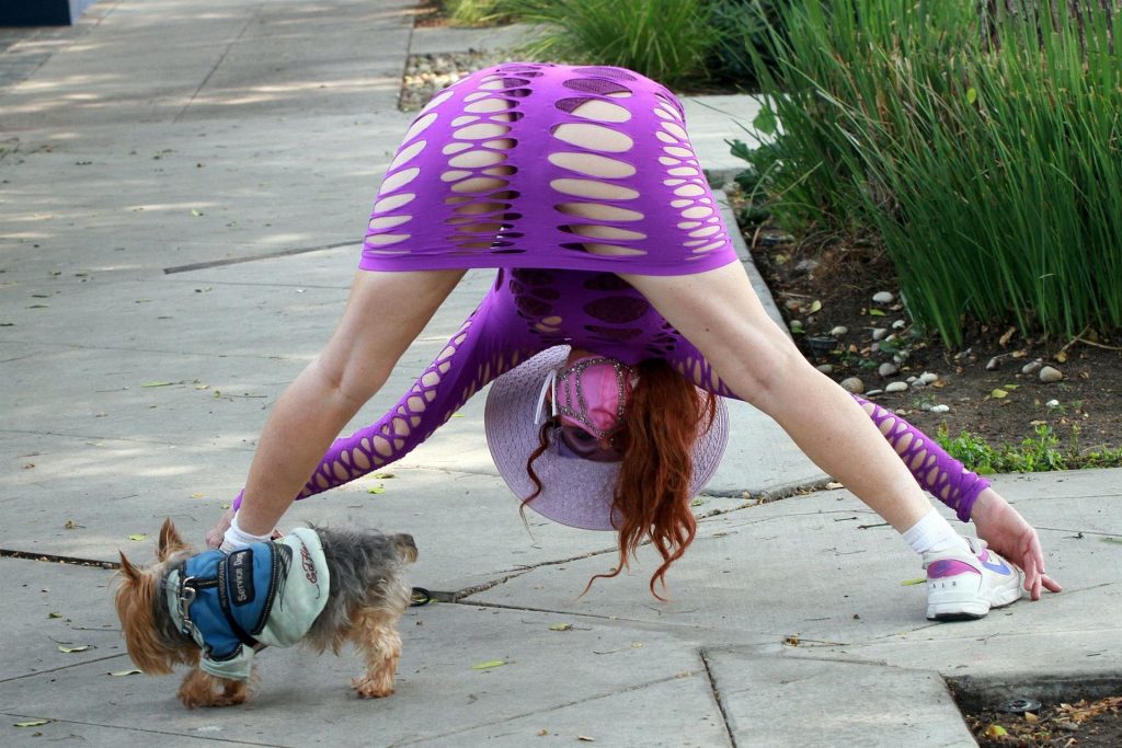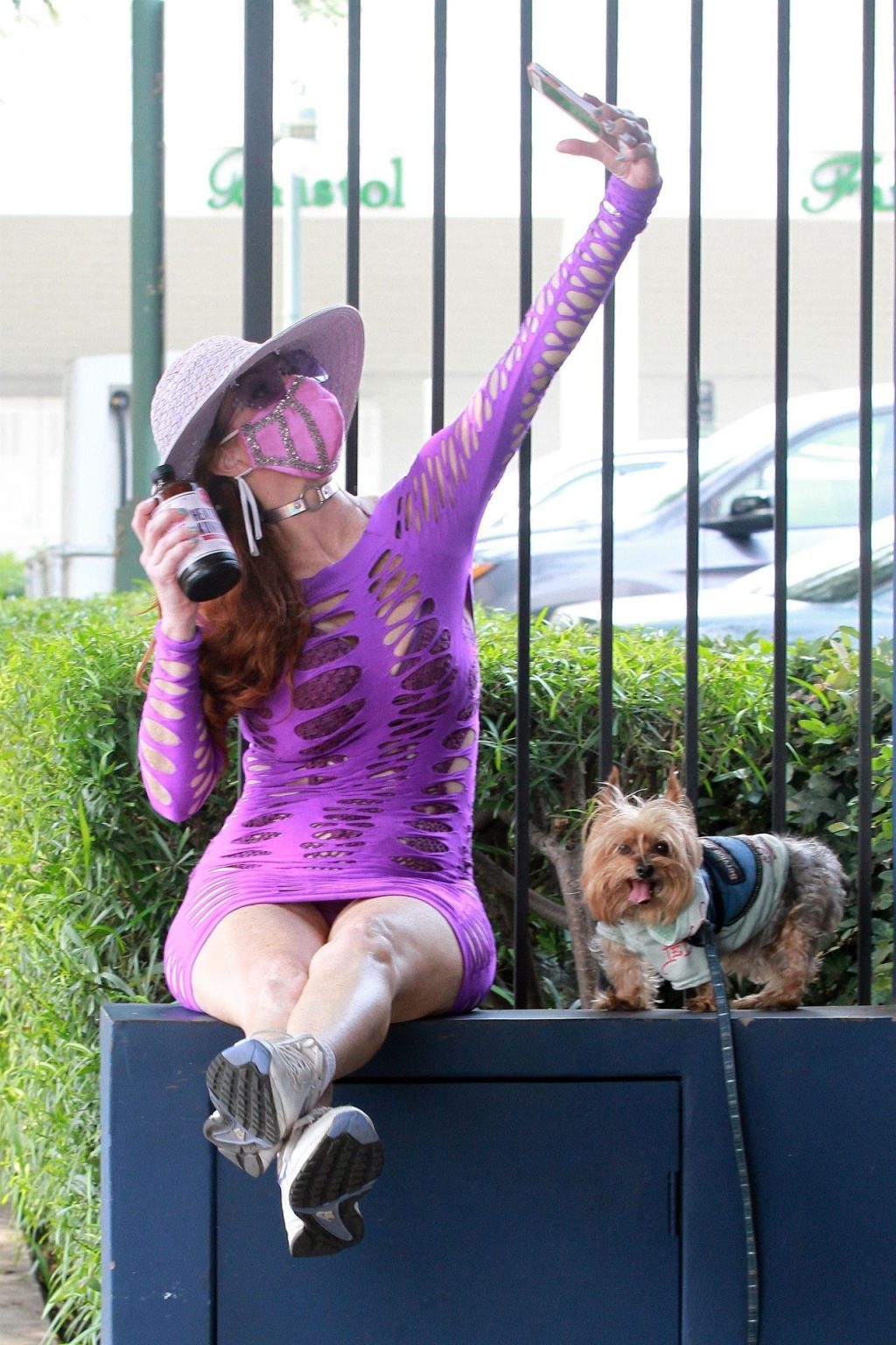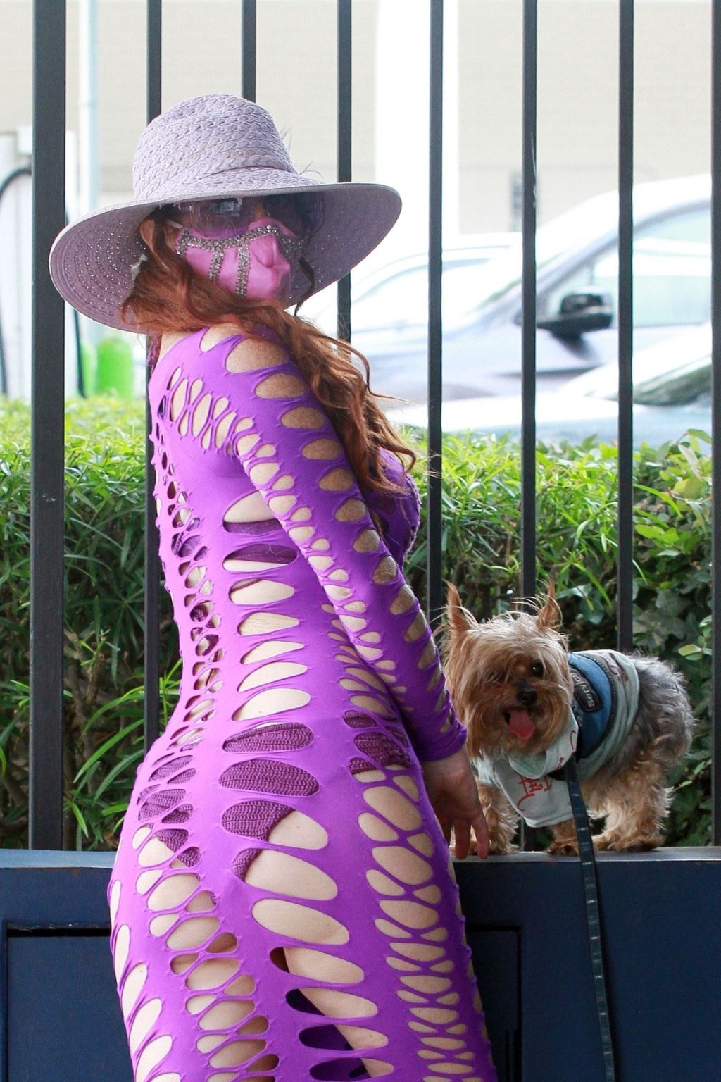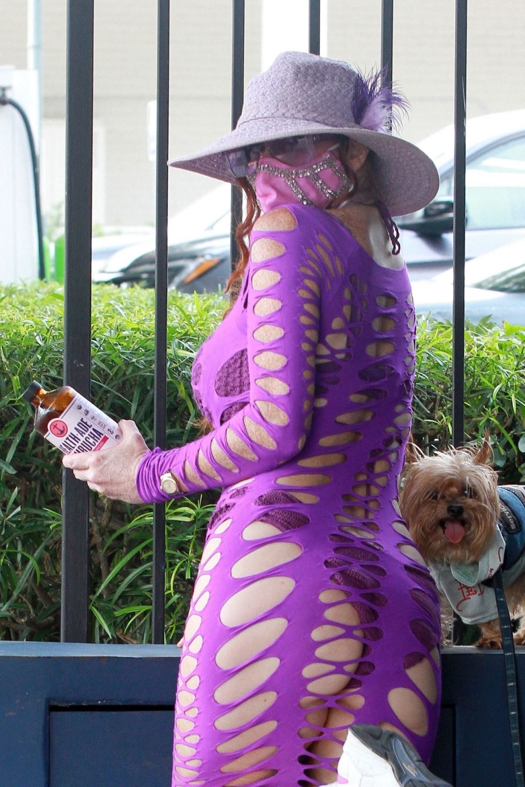 L’actrice Phoebe Price est vue en train de promener son chien et de boire du Kombucha à Los Angeles, le 25/08/2020. Elle porte une tenue violette laissant peu de place à l’imagination.