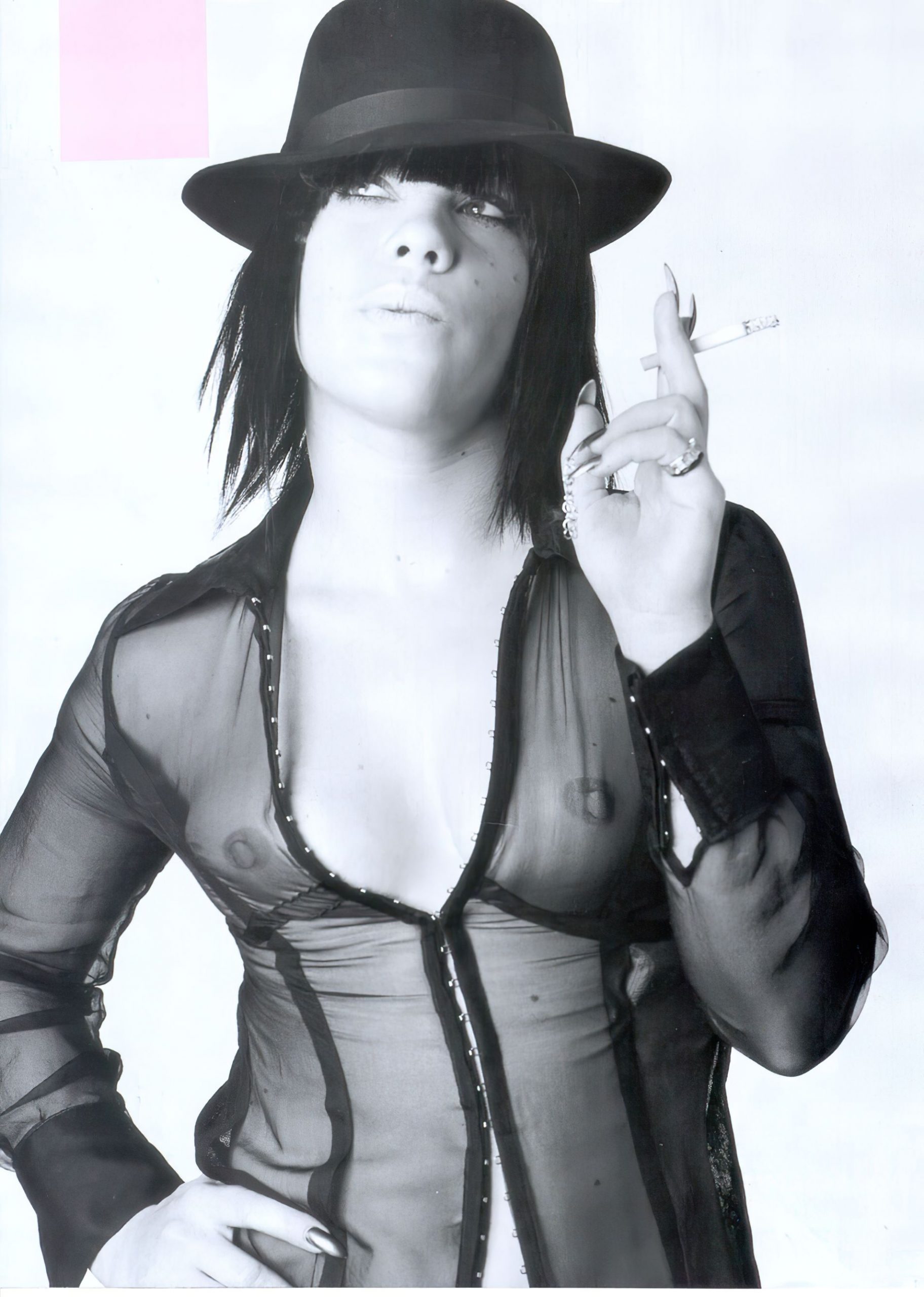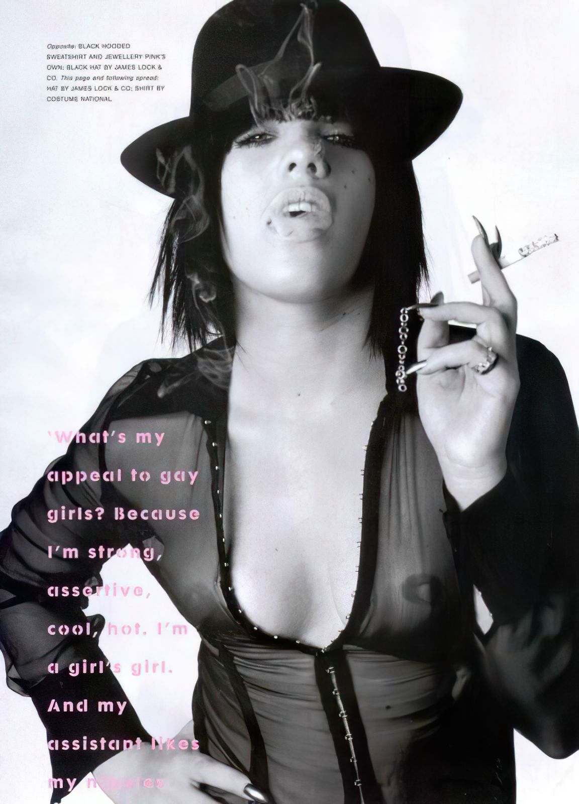 La chanteuse américaine Alecia Beth Moore (alias Pink) a été photographiée dans un chemisier transparent, fumant et montrant ses petits seins pour le magazine “The Face” (2006).