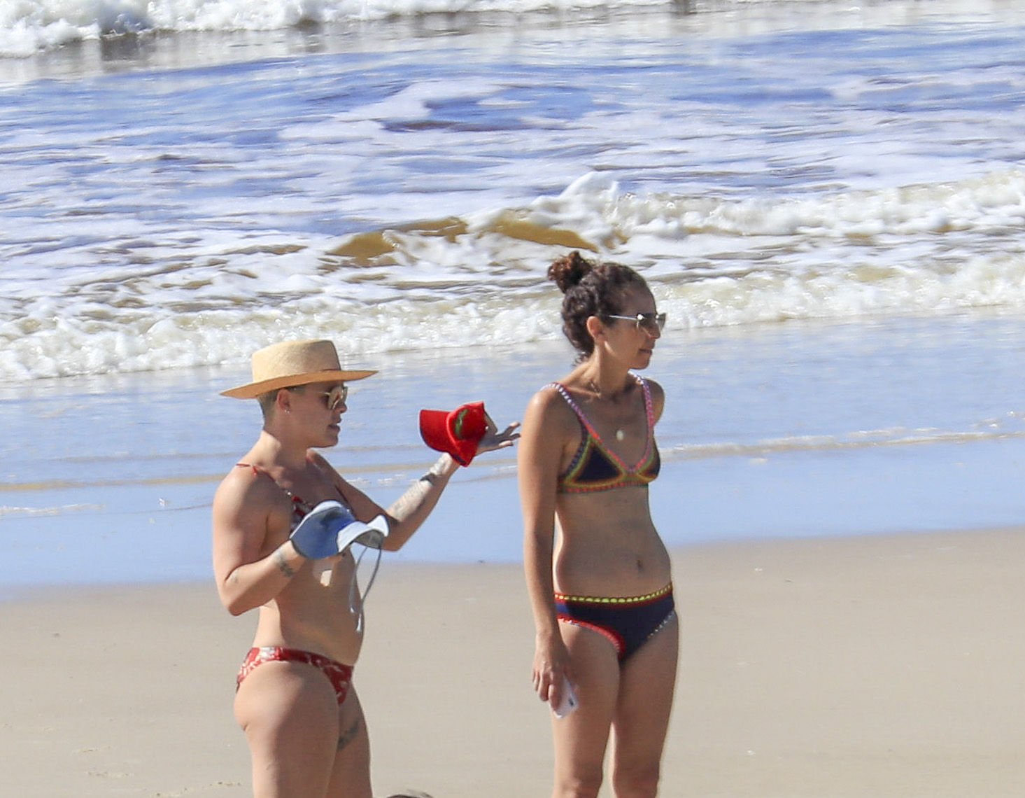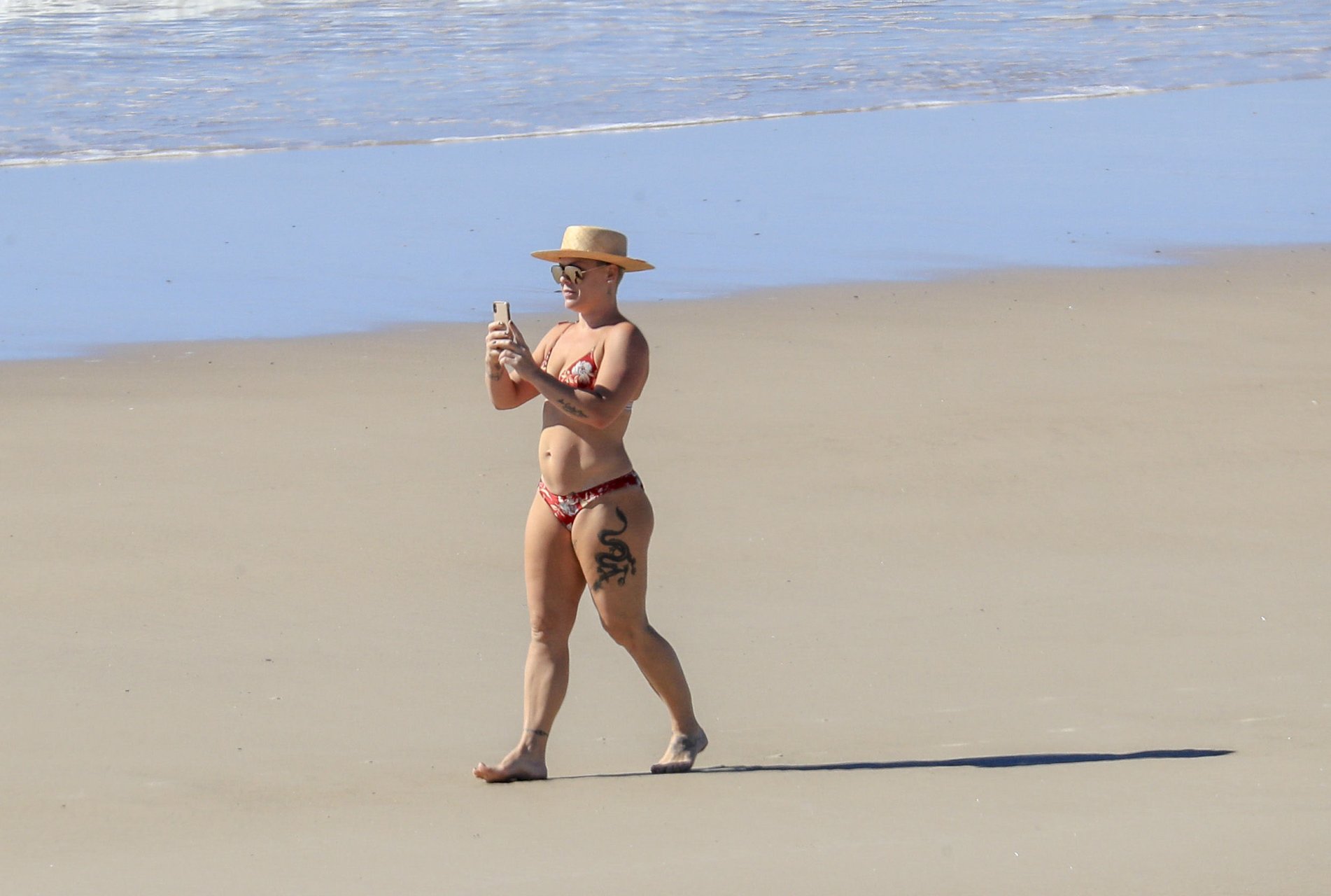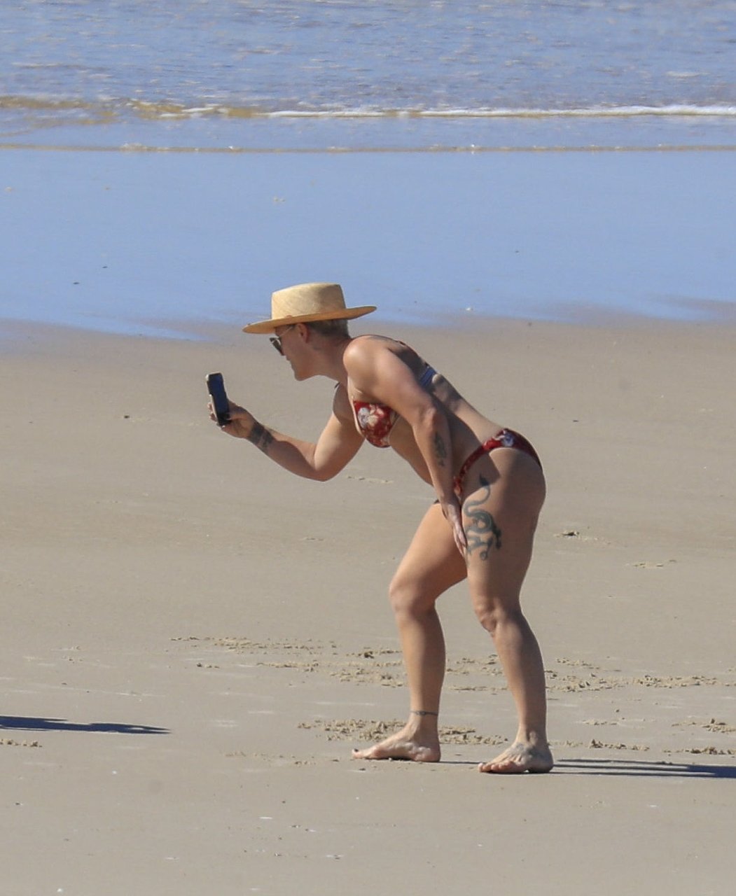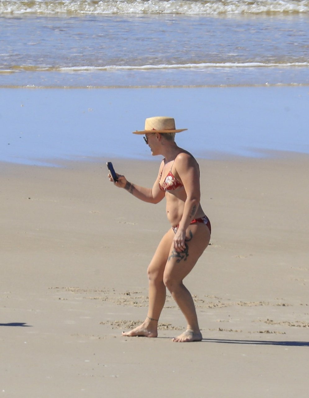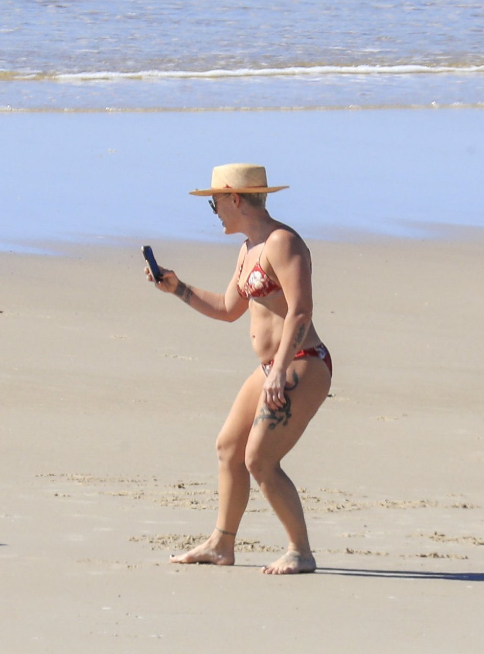 La pop-star Pink (Alecia Moore) profite du soleil en bikini, tout en savourant une pause au bord de la plage lors de sa tournée australienne, à Byron Bay, le 30/07/2018. P!nk (38 ans) était accompagnée de son mari, Carey Hart, et de leur famille lors de leurs vacances à la plage.