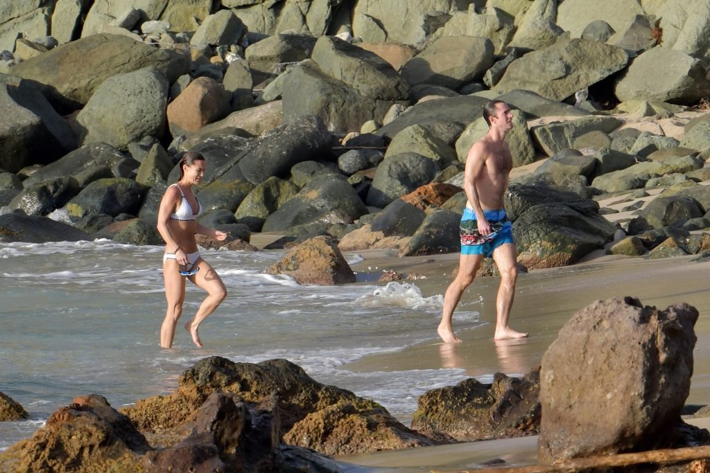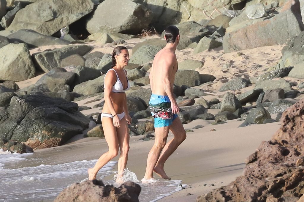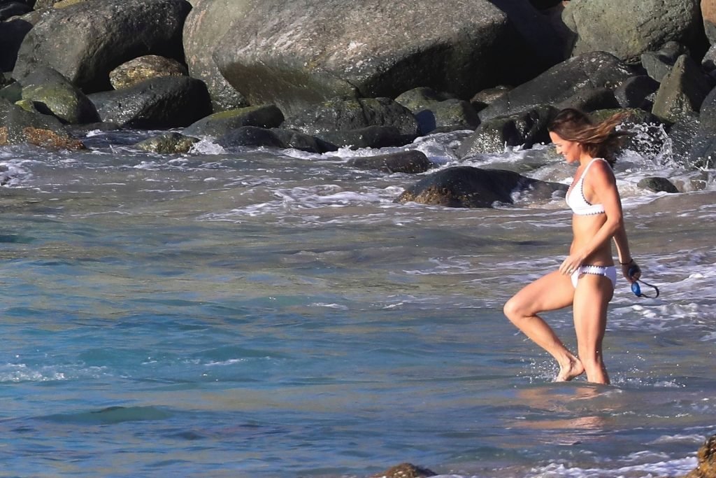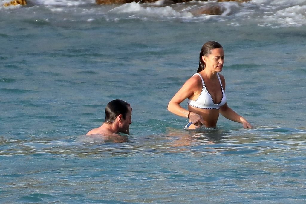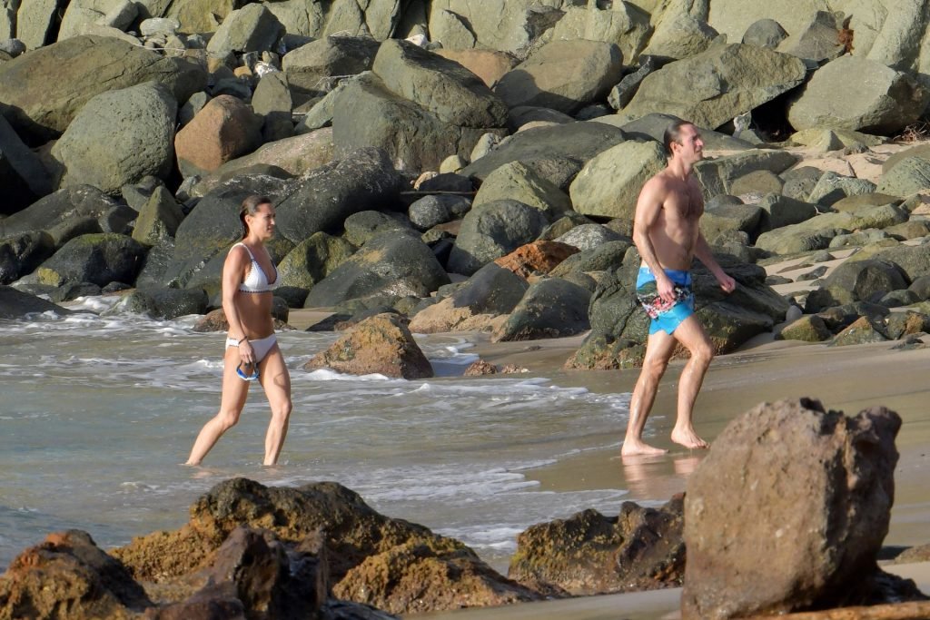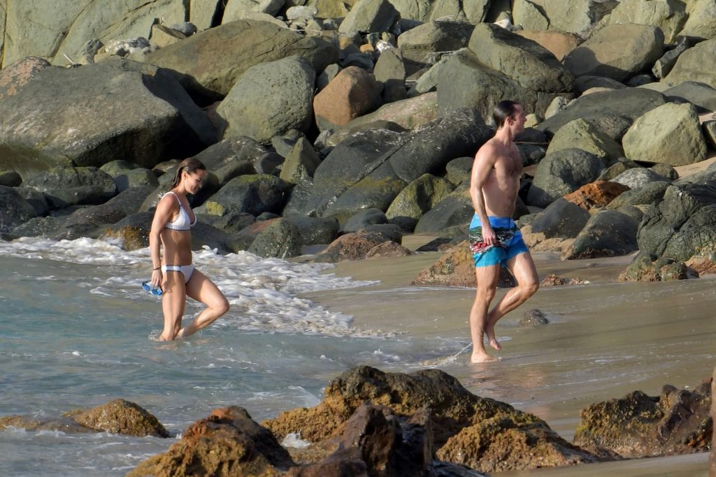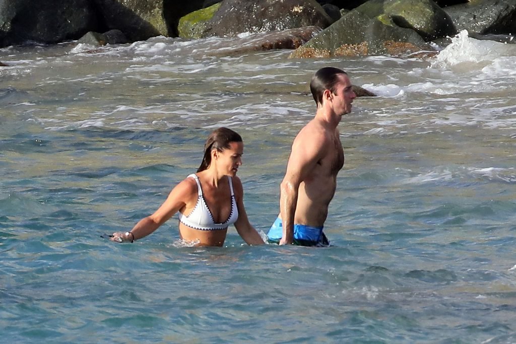 Nouvelle maman Pippa Middleton prend du temps pour se détendre avec son mari sur l’île des Caraïbes, 01/02/2019. Ici photographiée montrant son corps mince portant un deux-pièces blanc lors d’une baignade avec son homme.