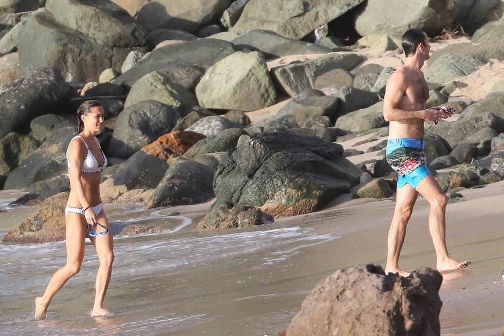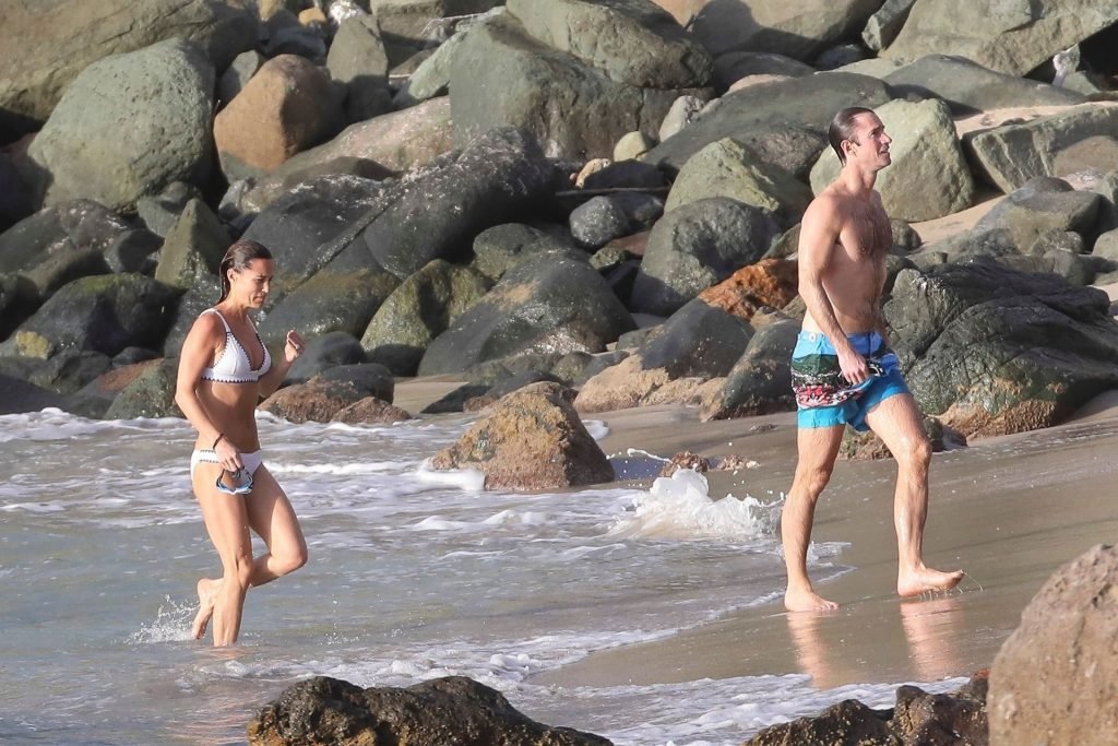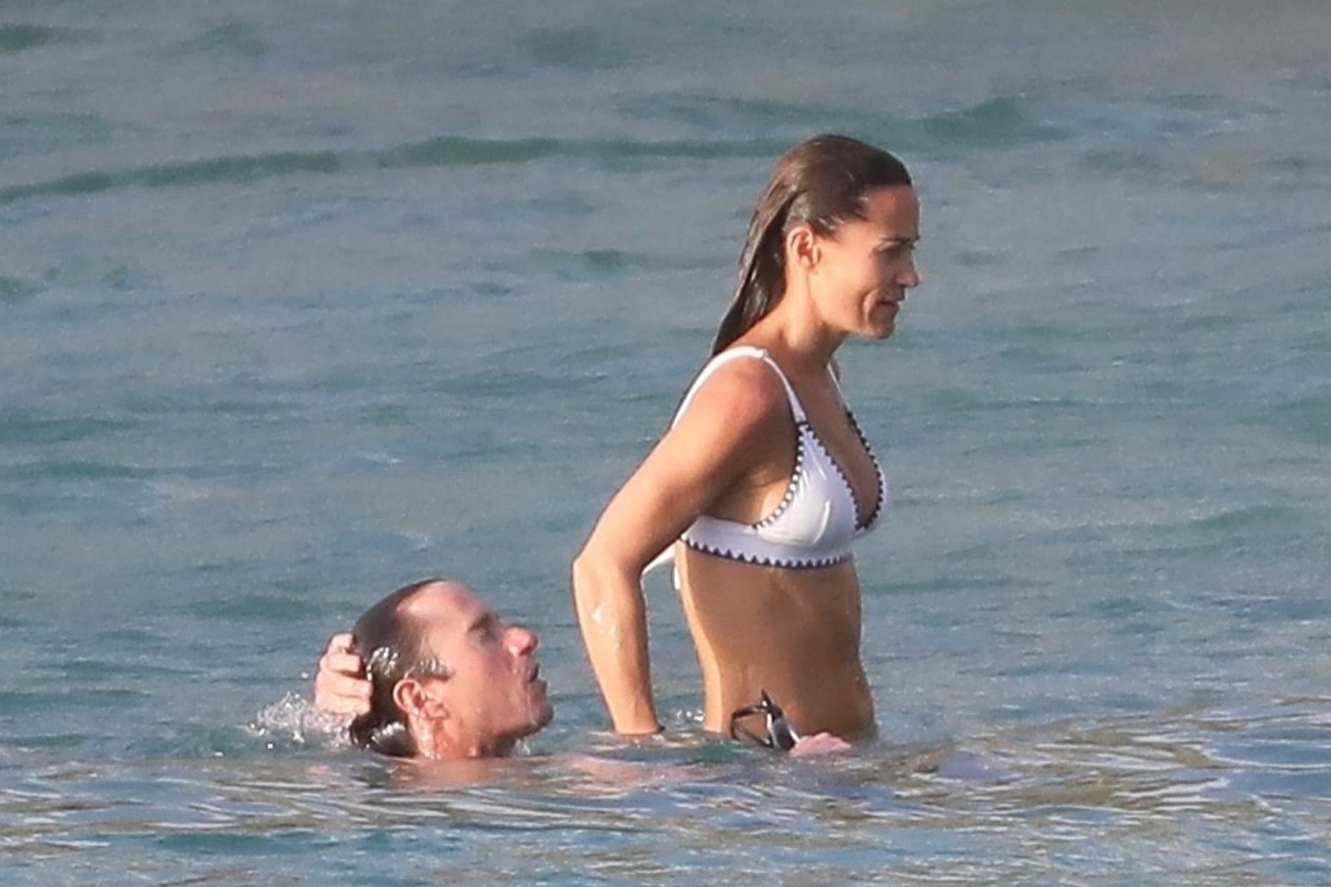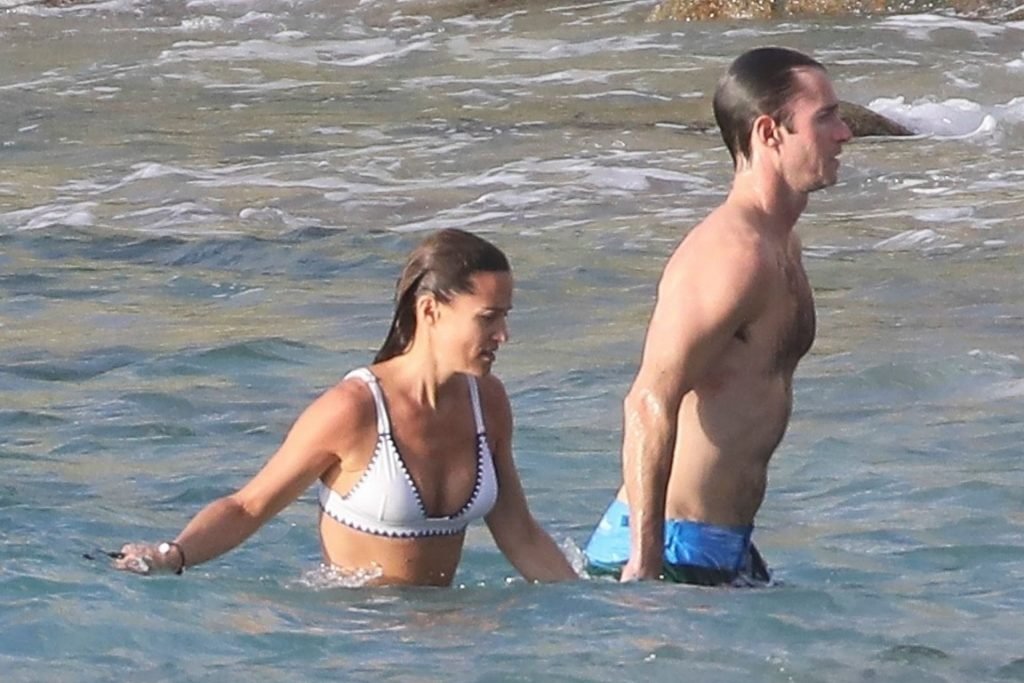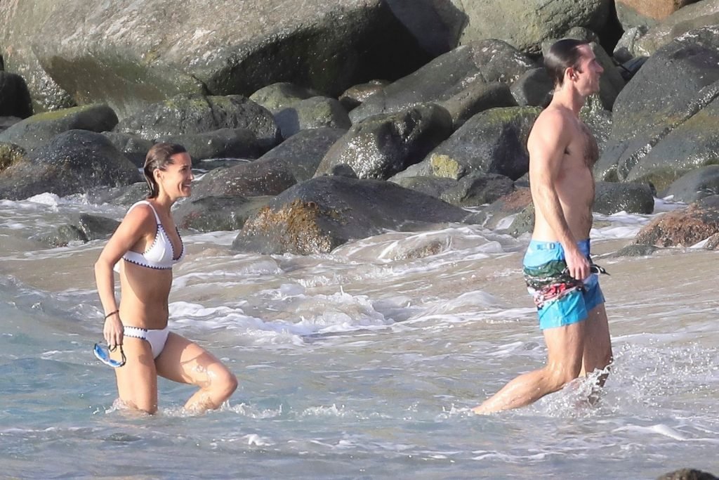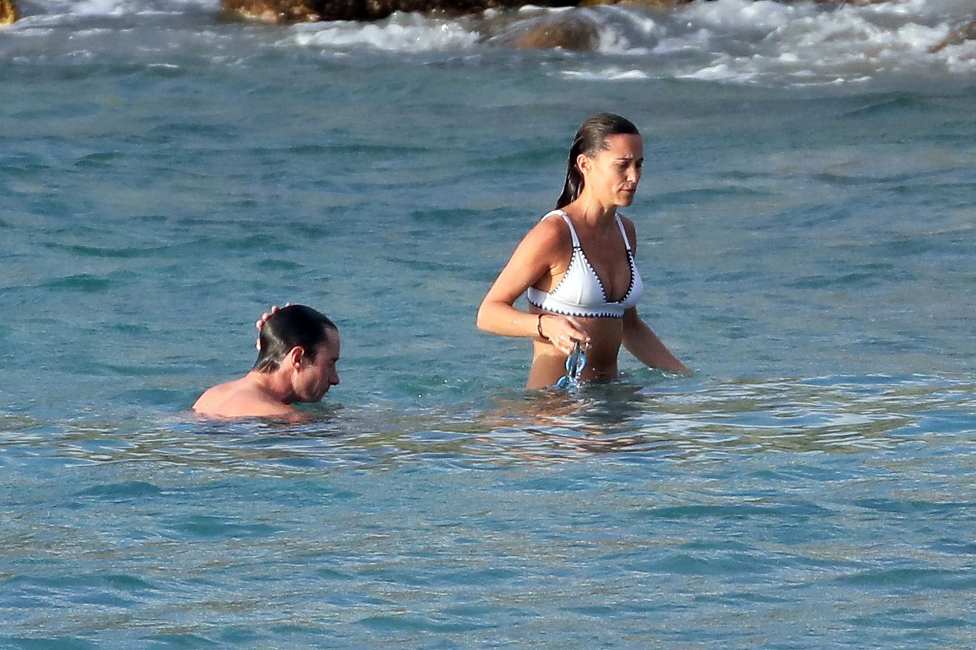 Nouvelle maman Pippa Middleton prend du temps pour se détendre avec son mari sur l’île des Caraïbes, 01/02/2019. Ici photographiée montrant son corps mince portant un deux-pièces blanc lors d’une baignade avec son homme.