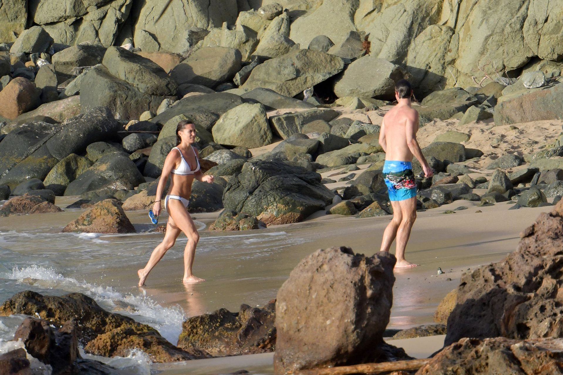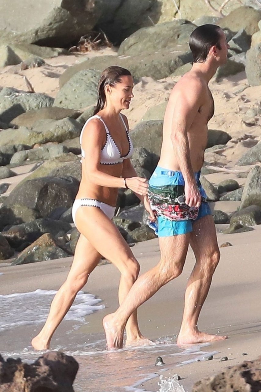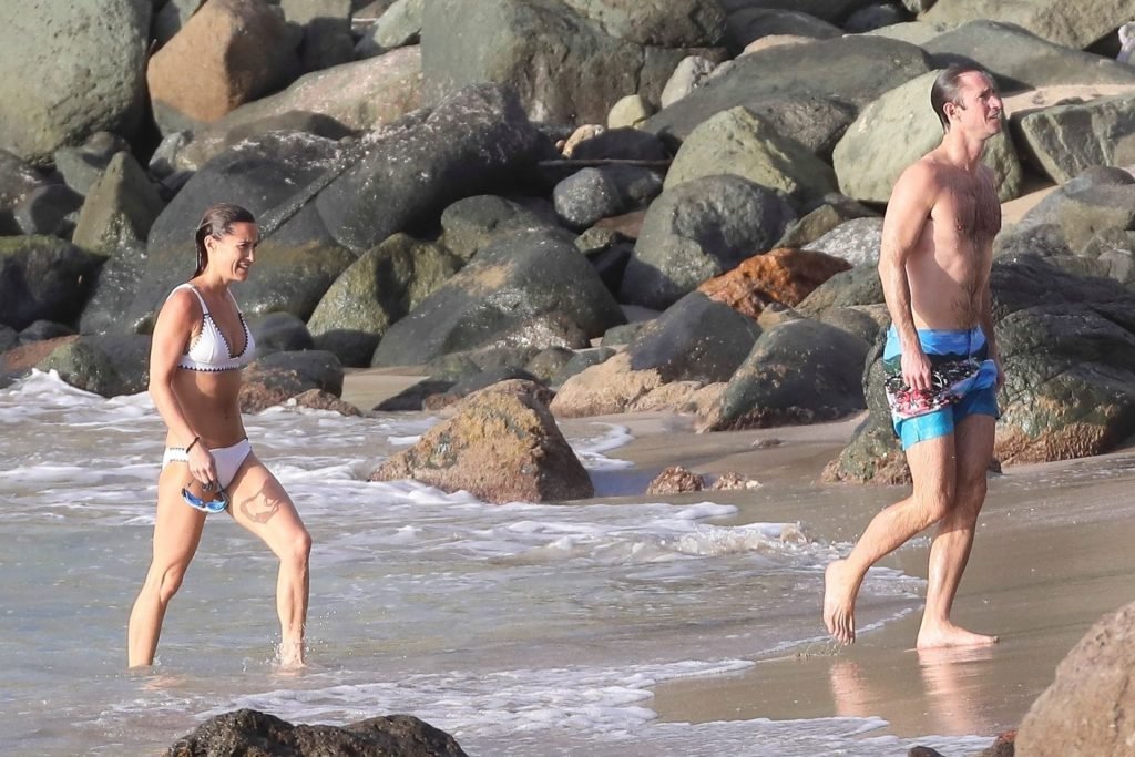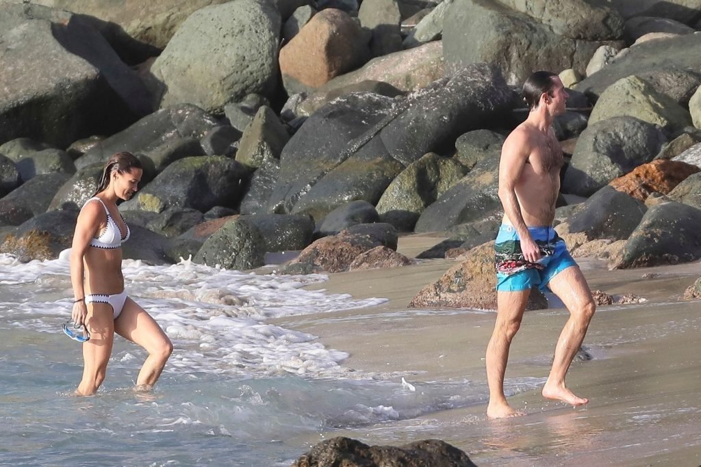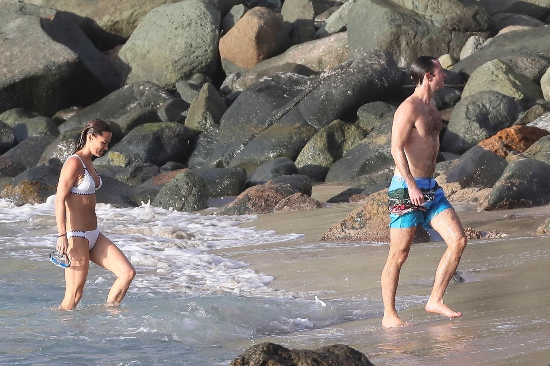 Nouvelle maman Pippa Middleton prend du temps pour se détendre avec son mari sur l’île des Caraïbes, 01/02/2019. Ici photographiée montrant son corps mince portant un deux-pièces blanc lors d’une baignade avec son homme.