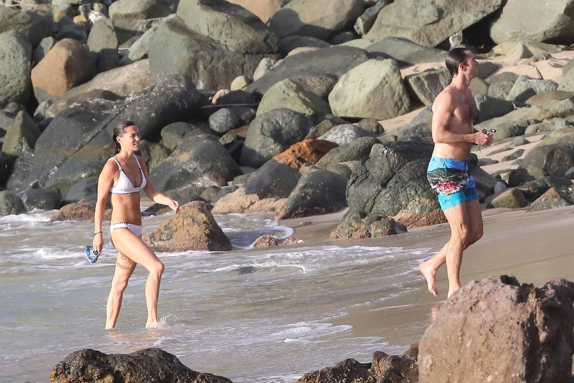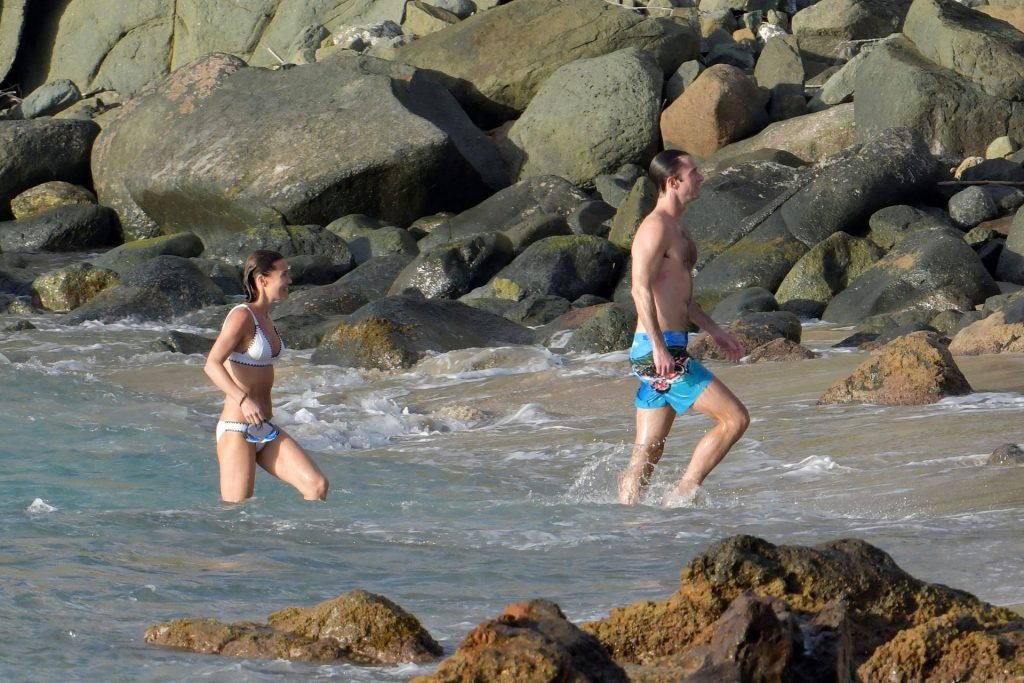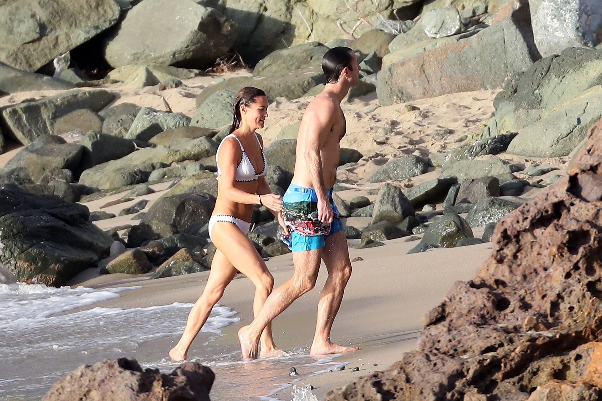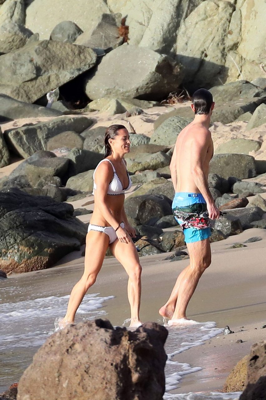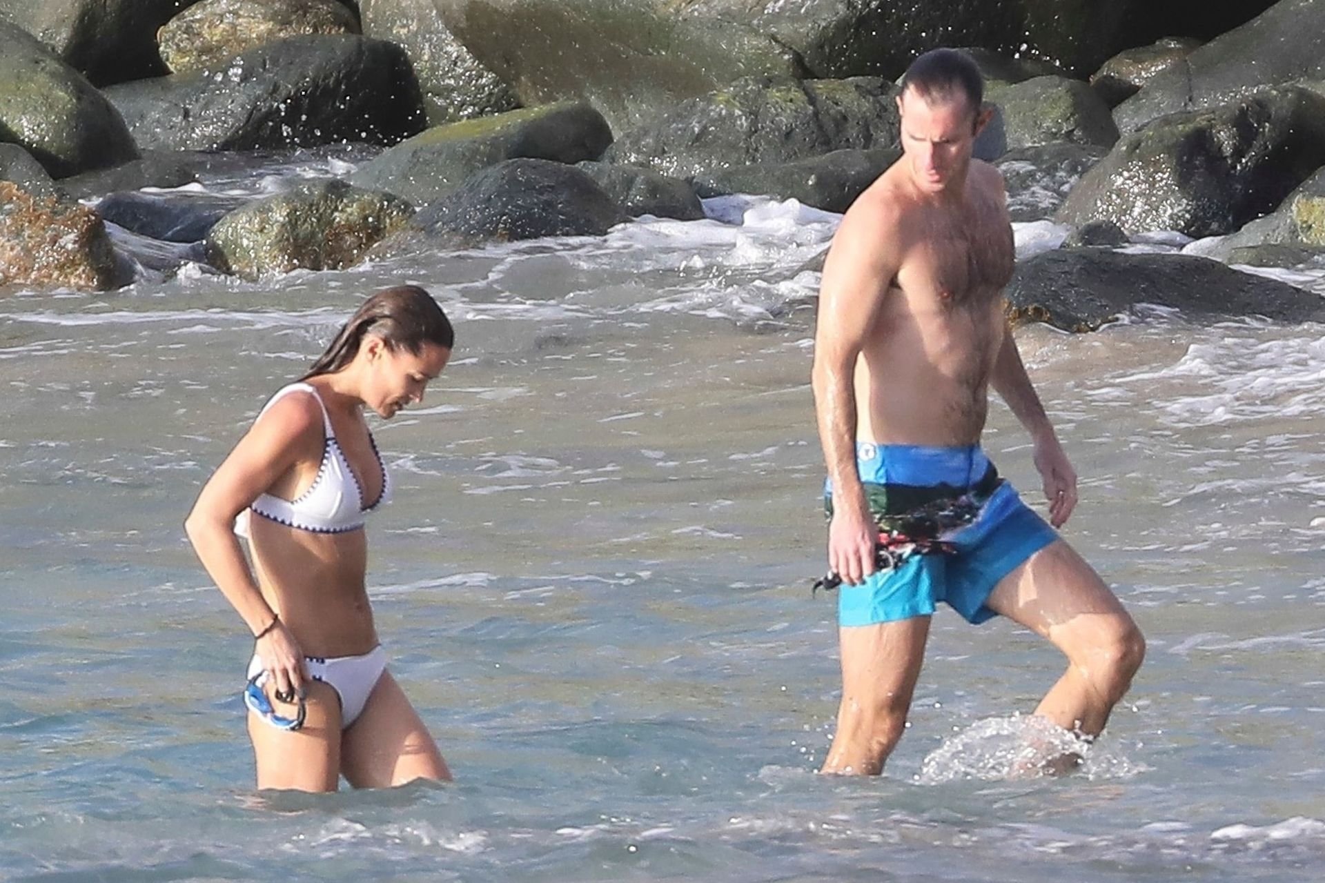 Nouvelle maman Pippa Middleton prend du temps pour se détendre avec son mari sur l’île des Caraïbes, 01/02/2019. Ici photographiée montrant son corps mince portant un deux-pièces blanc lors d’une baignade avec son homme.