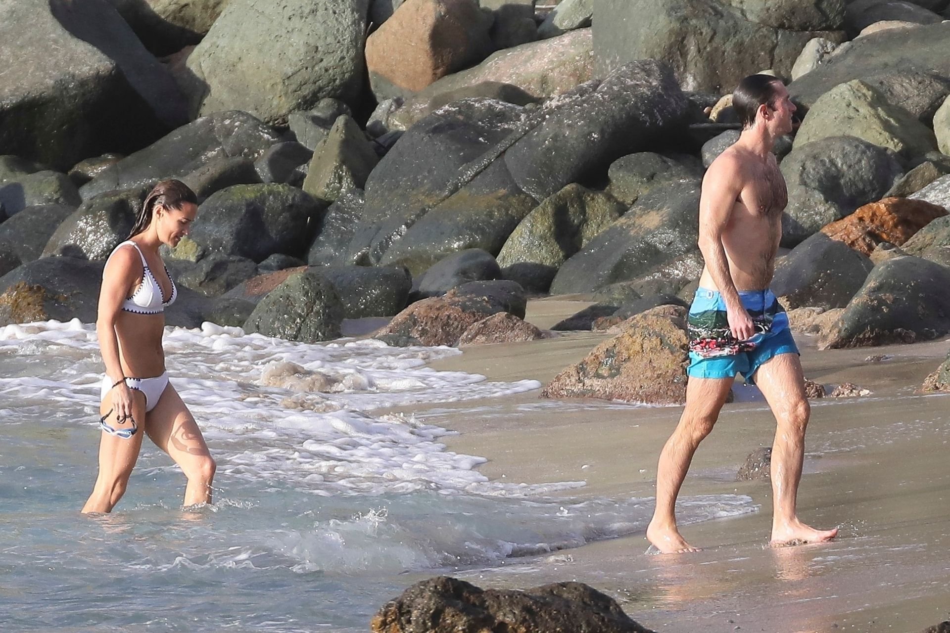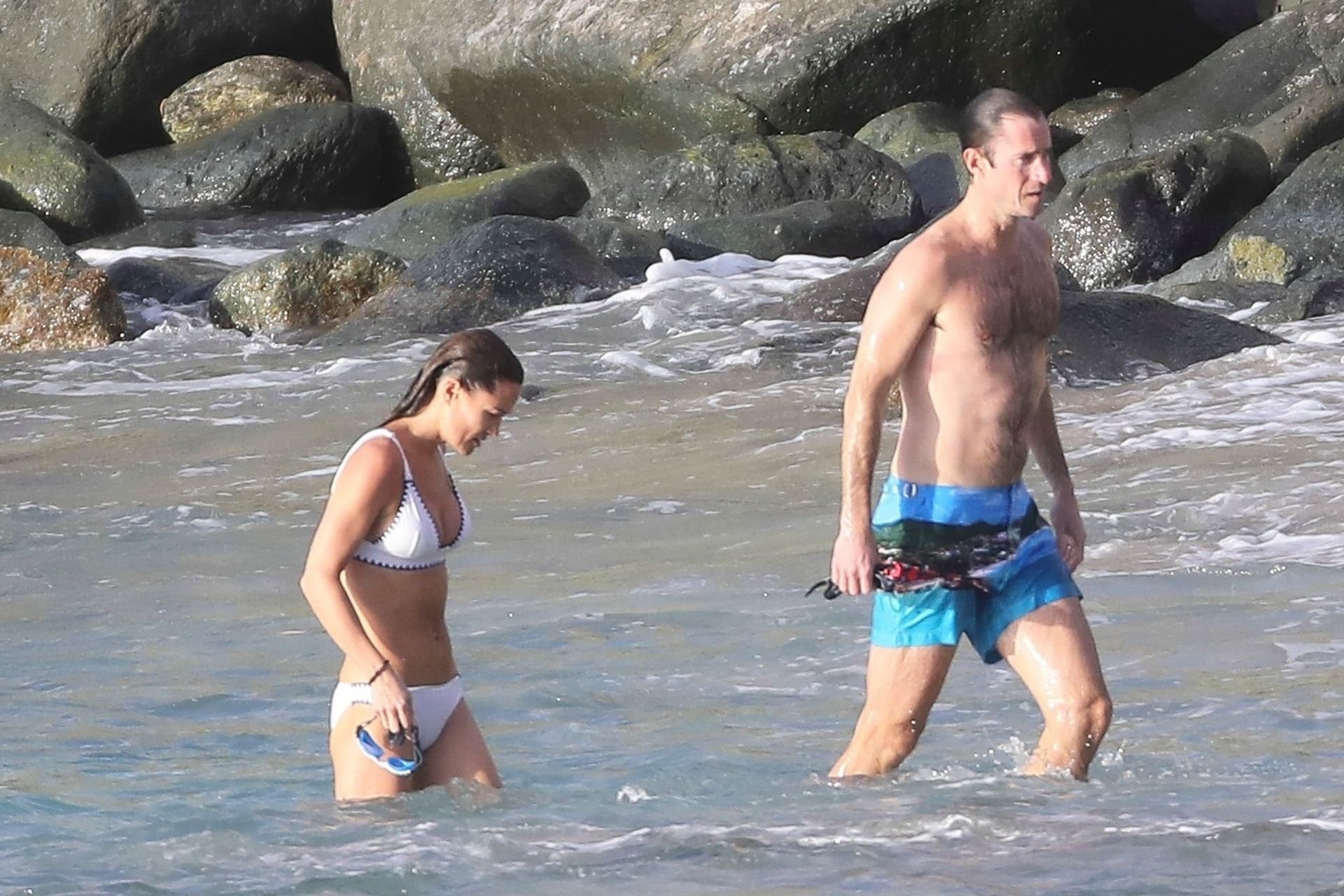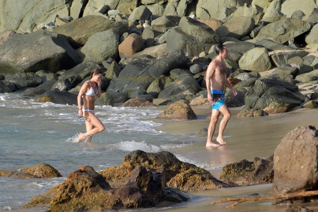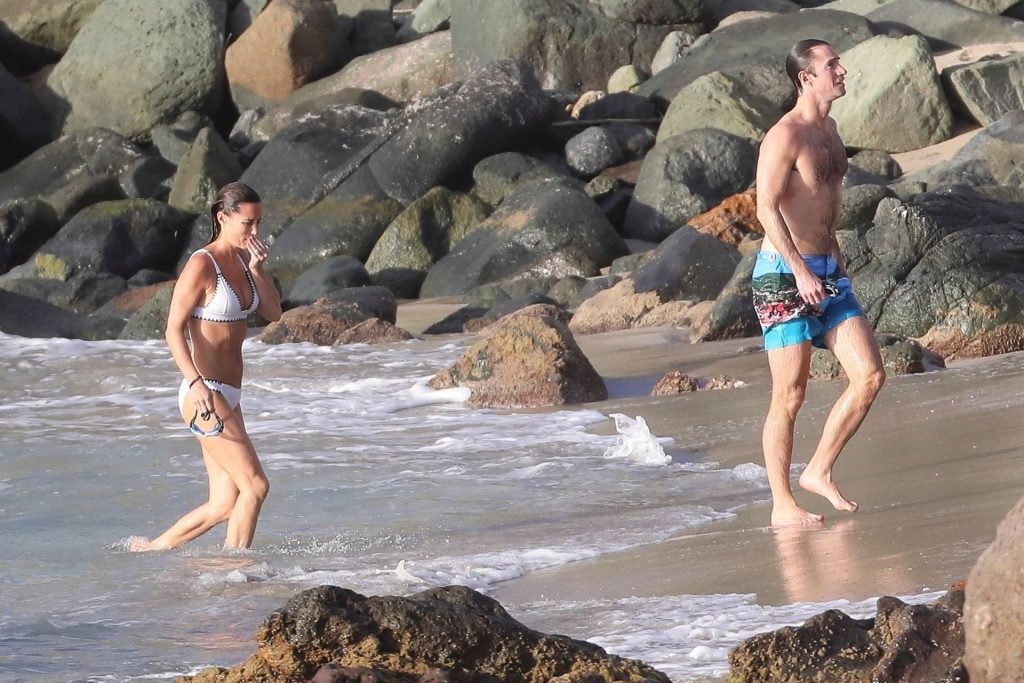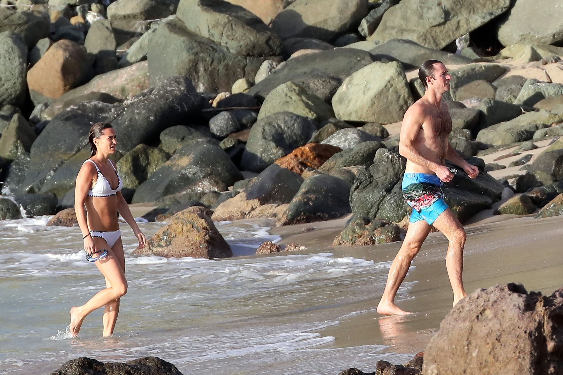 Nouvelle maman Pippa Middleton prend du temps pour se détendre avec son mari sur l’île des Caraïbes, 01/02/2019. Ici photographiée montrant son corps mince portant un deux-pièces blanc lors d’une baignade avec son homme.