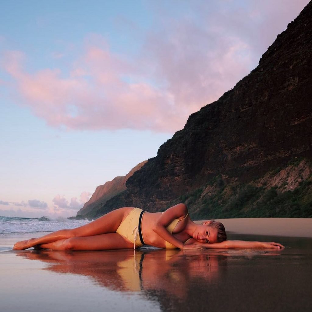 La chanteuse Pixie Lott a été aperçue en bikini rayé blanc et bleu avec Oliver Cheshire sur la plage de Kauai, Hawaii, le 11/06/2018.